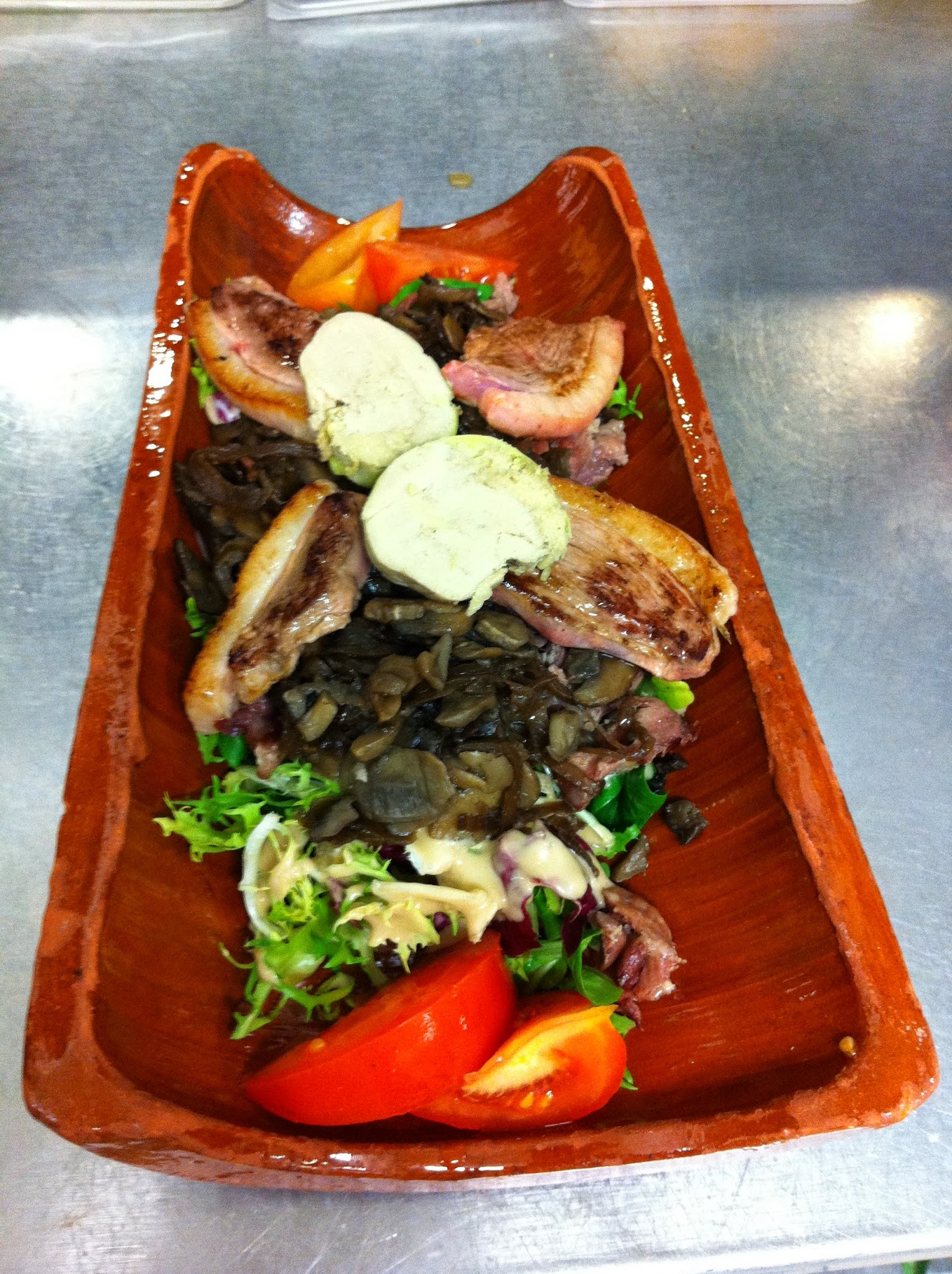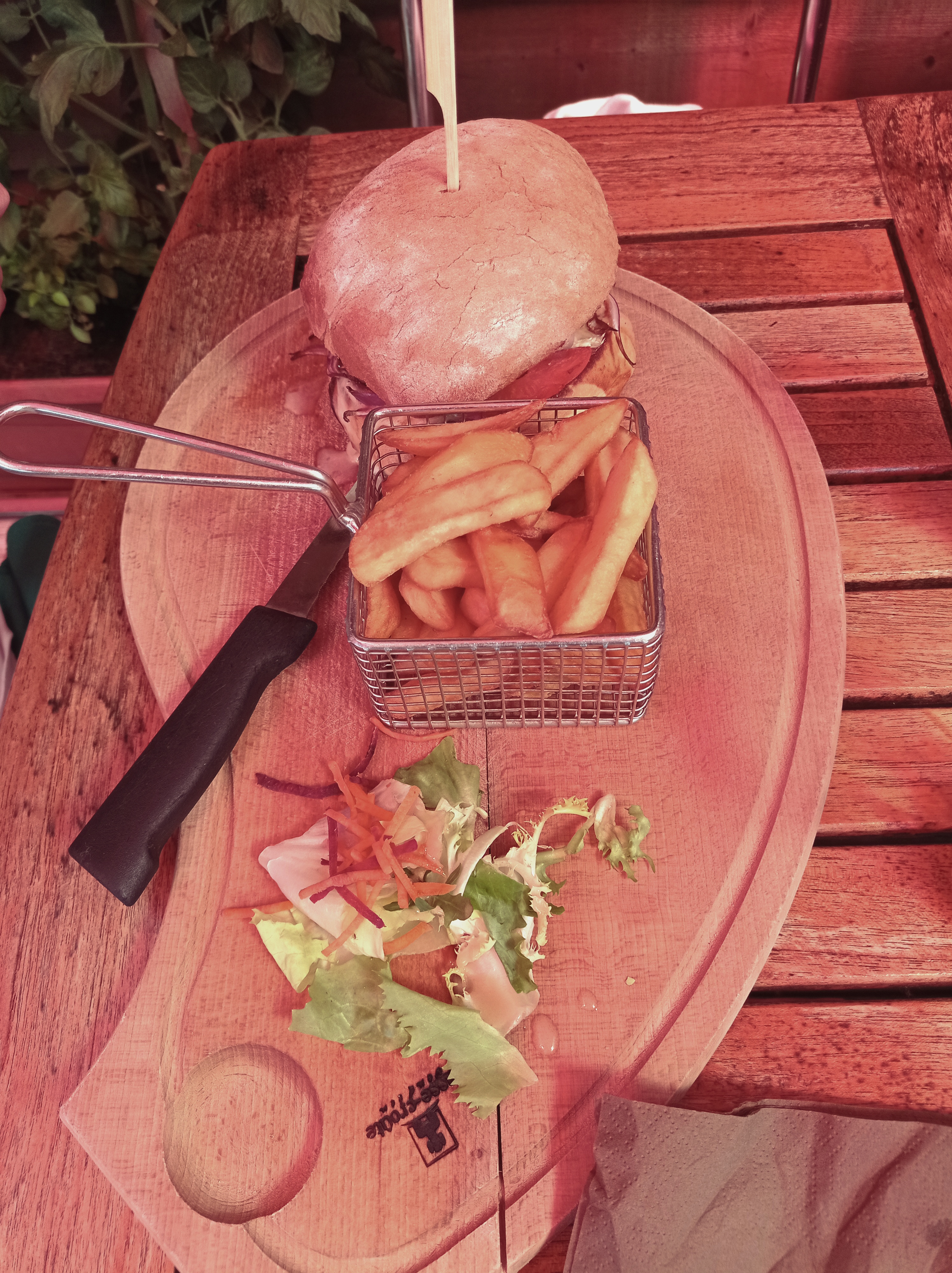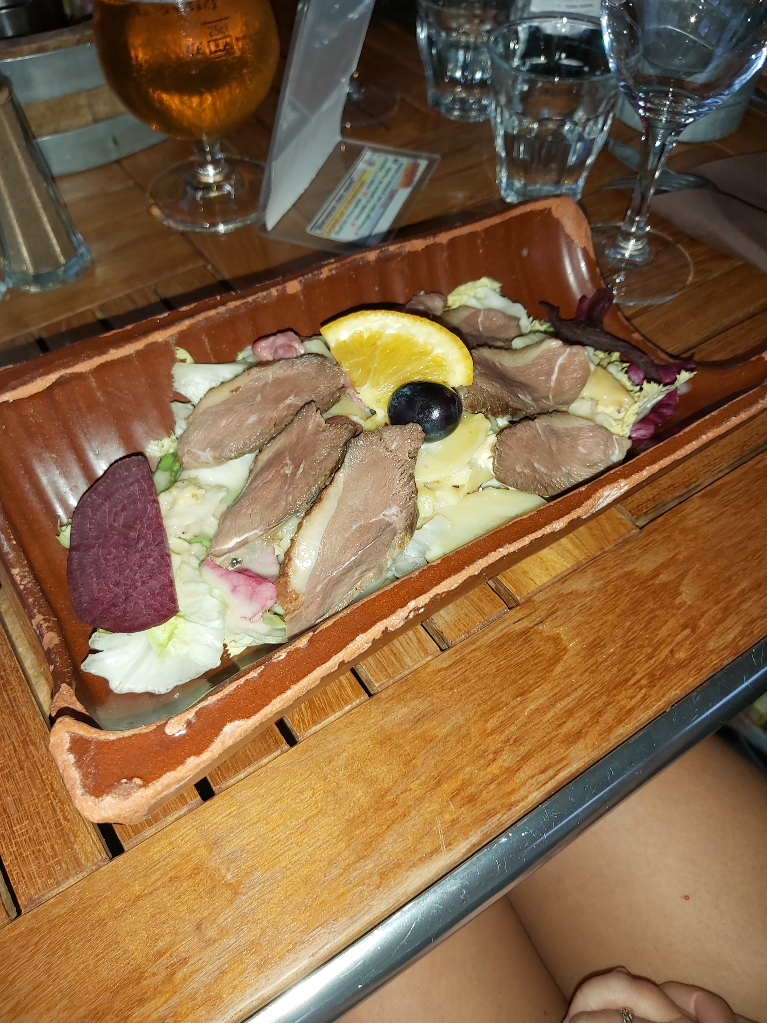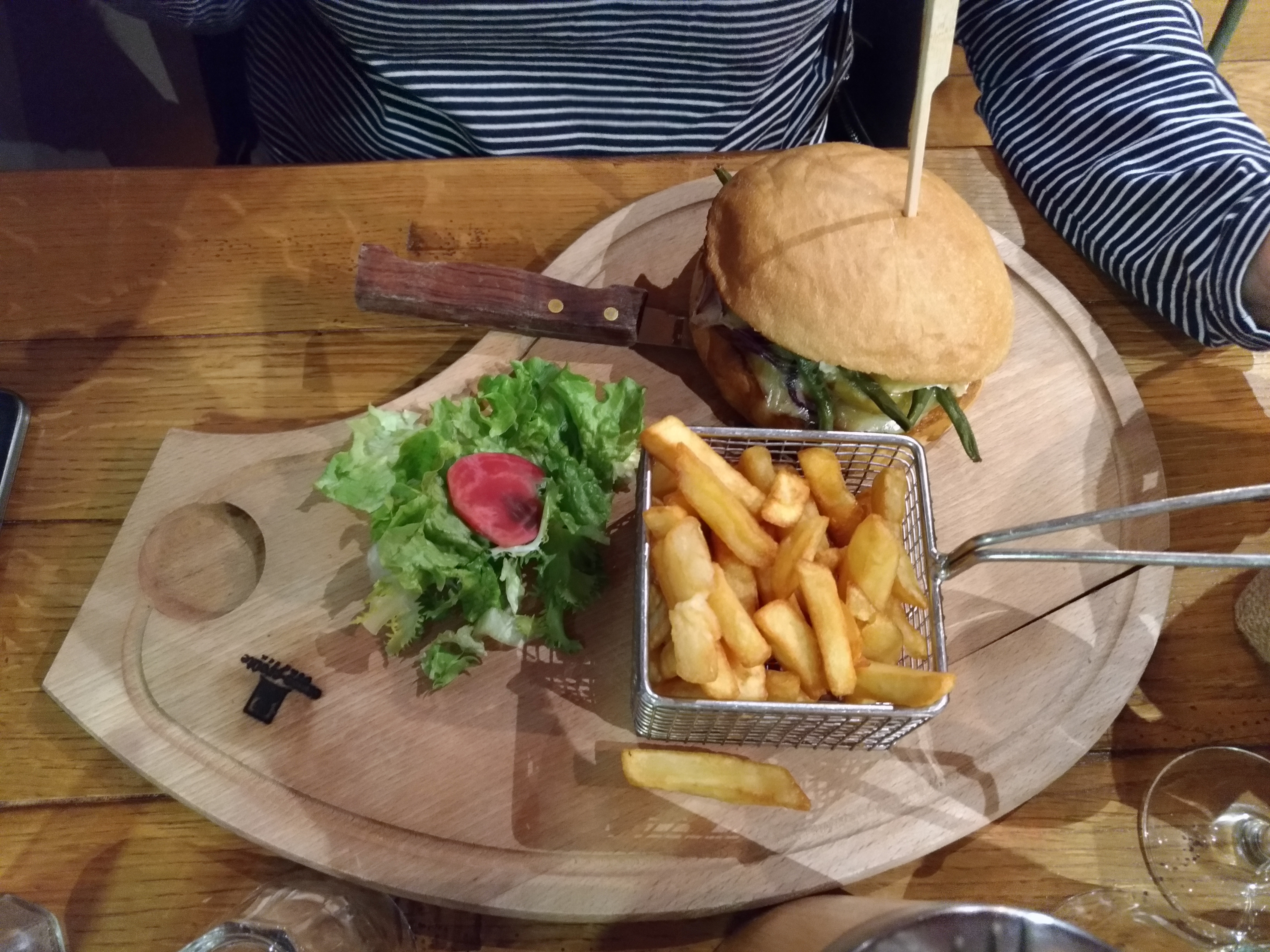 Repas du midi pour la fête des pères. Lieu vraiment sympa et atypique ++++. Le personnel très sympathique aussi et accueillant ++++ En ce qui concerne la nourriture, ce n’est pas mauvais mais c’est pas top non plus. Une salade de chèvre avec un fromage de chèvre bruni au chalumeau, ce qui laisse un goût de brûlé pas très agréable. La salade pleine de terre ou de sable, très désagréable en bouche, nous l’avons d’ailleurs signalé. Nous n’avons pas trop compris l’association St Jacques/viande, d’autant que la seule poêlée de la mer ne contient pas de St Jacques. St Jacques qui ne sont en fait que des noix de pétoncle surgelées, un peu de tromperie sur la marchandise sur ce coup là. Un jambon de Vendée très très salé. Un burger bon mais sans plus. Des frites surgelées aussi mais bonnes sans plus également. Rien à dire sur le dessert : pain et brioche perdu, c’était simple mais bon. En bref, c’est pas catastrophique du tout, mais c’est pas au top non plus. Quelques réglages en cuisine pourraient tout améliorer 😉