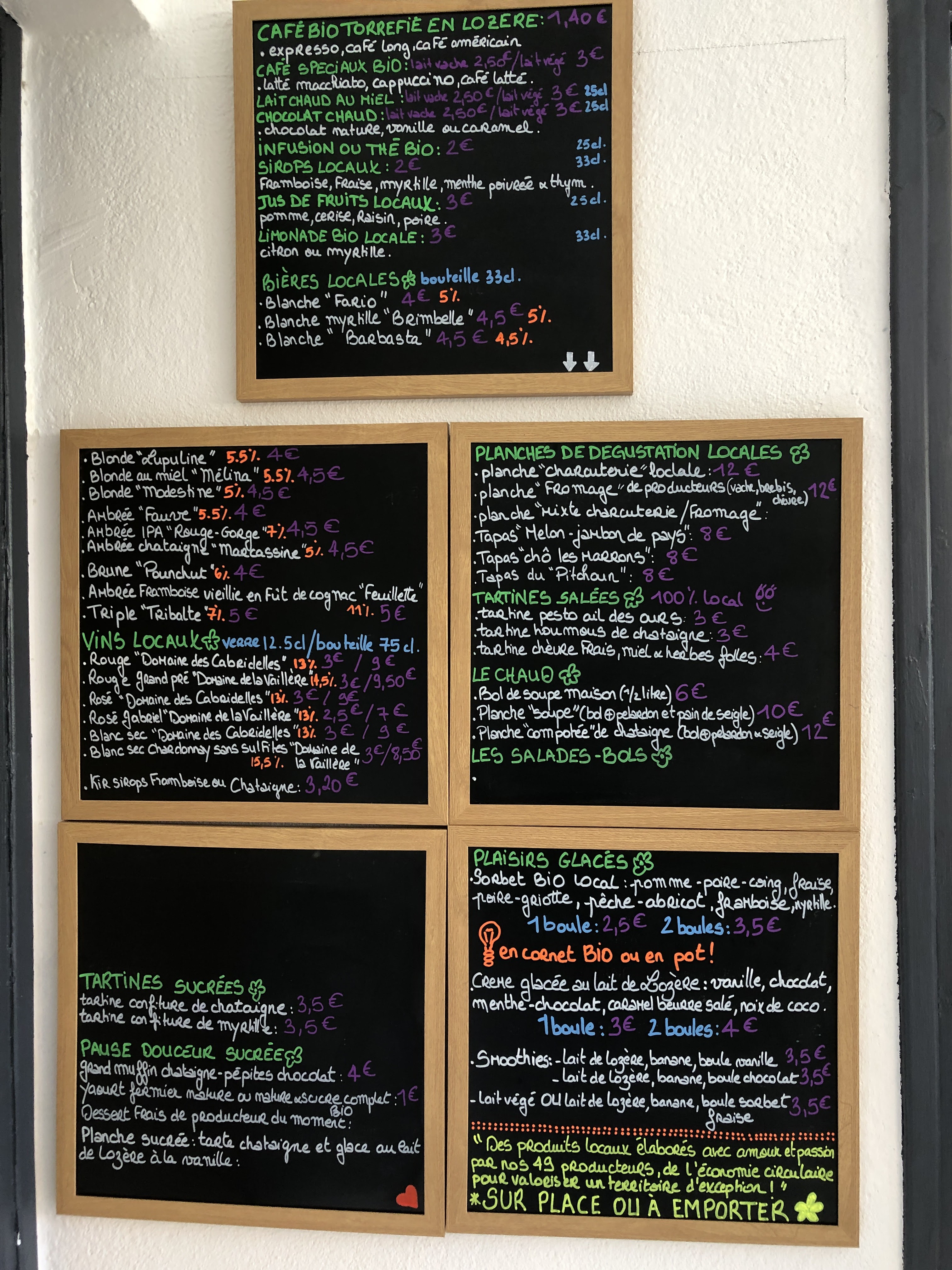 Salades, gaufres salées ou sucrées, assiettes de fromages, bières diverses...produits lozériens...desserts maison. Accueil sympathique... A l'intérieur, juste quatre tables. Mais petite terrasse agréable aux beaux jours.