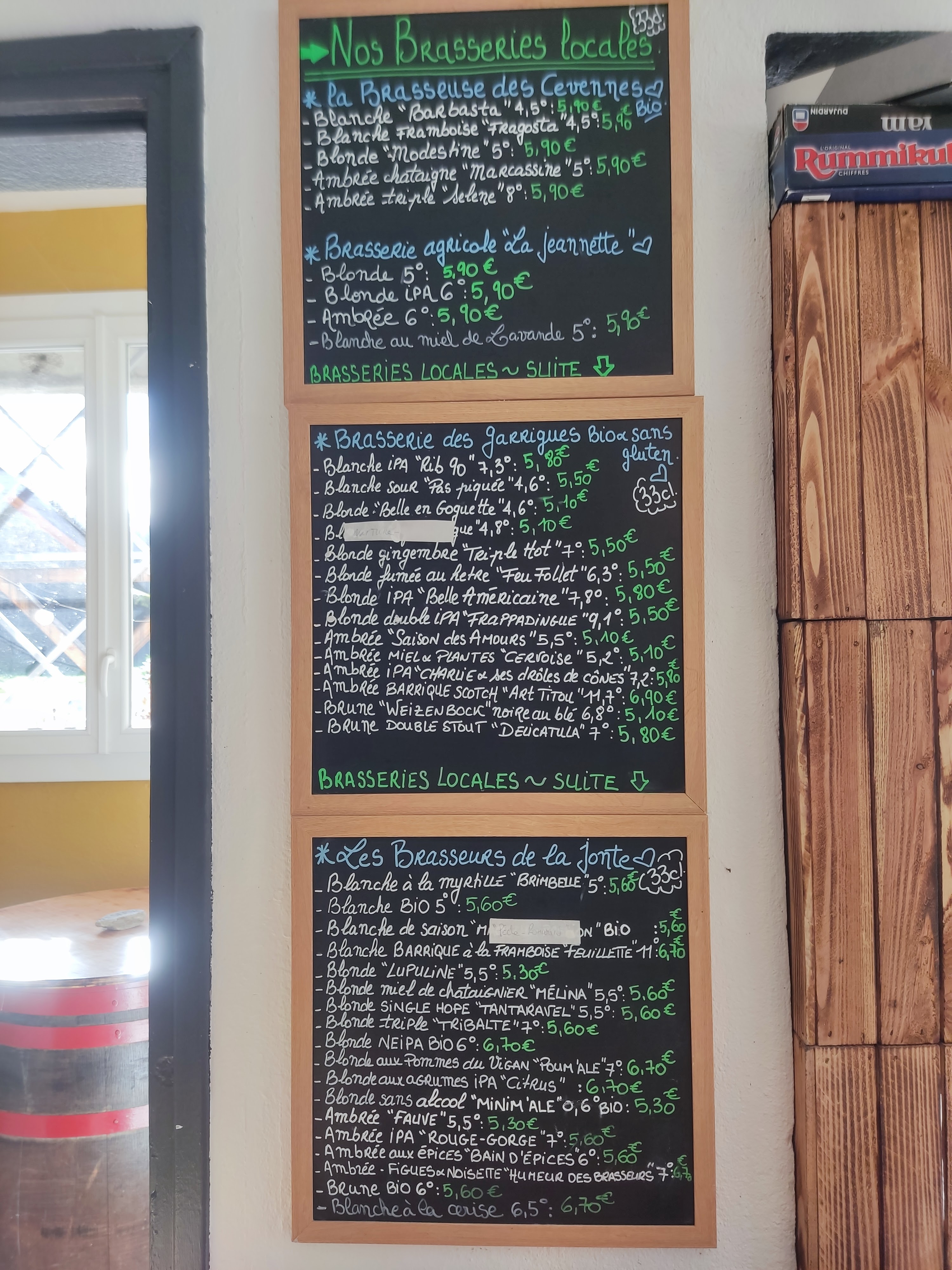 Dans l'ancienne gendarmerie du Pont de Monvert, Cévennes in thé Box propose de beaux produits régionaux (c'est une épicerie bio, en plus de tout le reste) et un large choix de bière très intéressant. L'aménagement extérieur avec de nombreuses tables et chaises en tous genres permet de se reposer d'une balade en dégustant des charcuteries locales en se désaltérant. On a apprécié 3 choses tout particulièrement : les jeux mis à disposition, les glaces (vraiment celle marron est au top) et les gaufres ! On y est allé plusieurs fois.