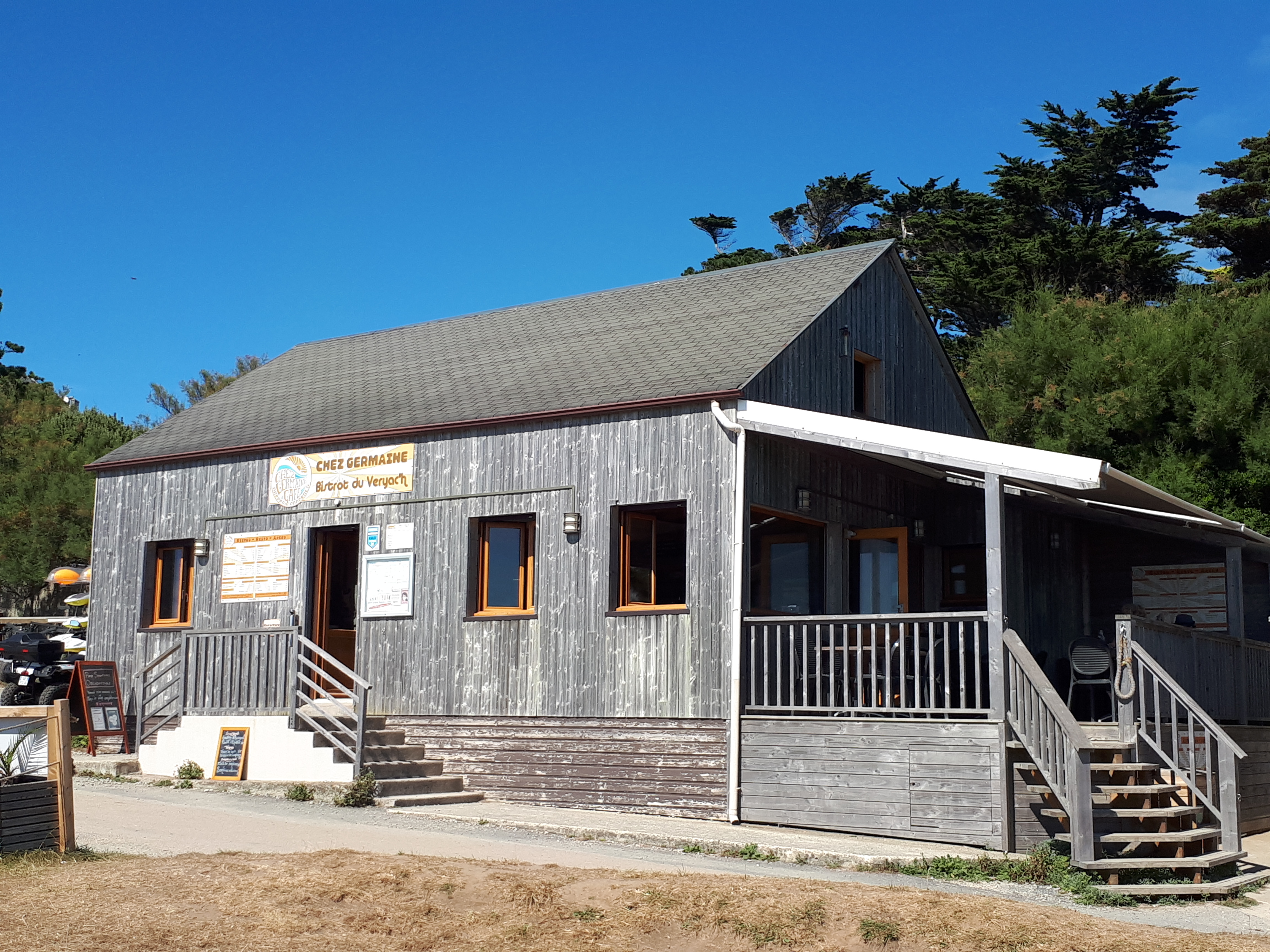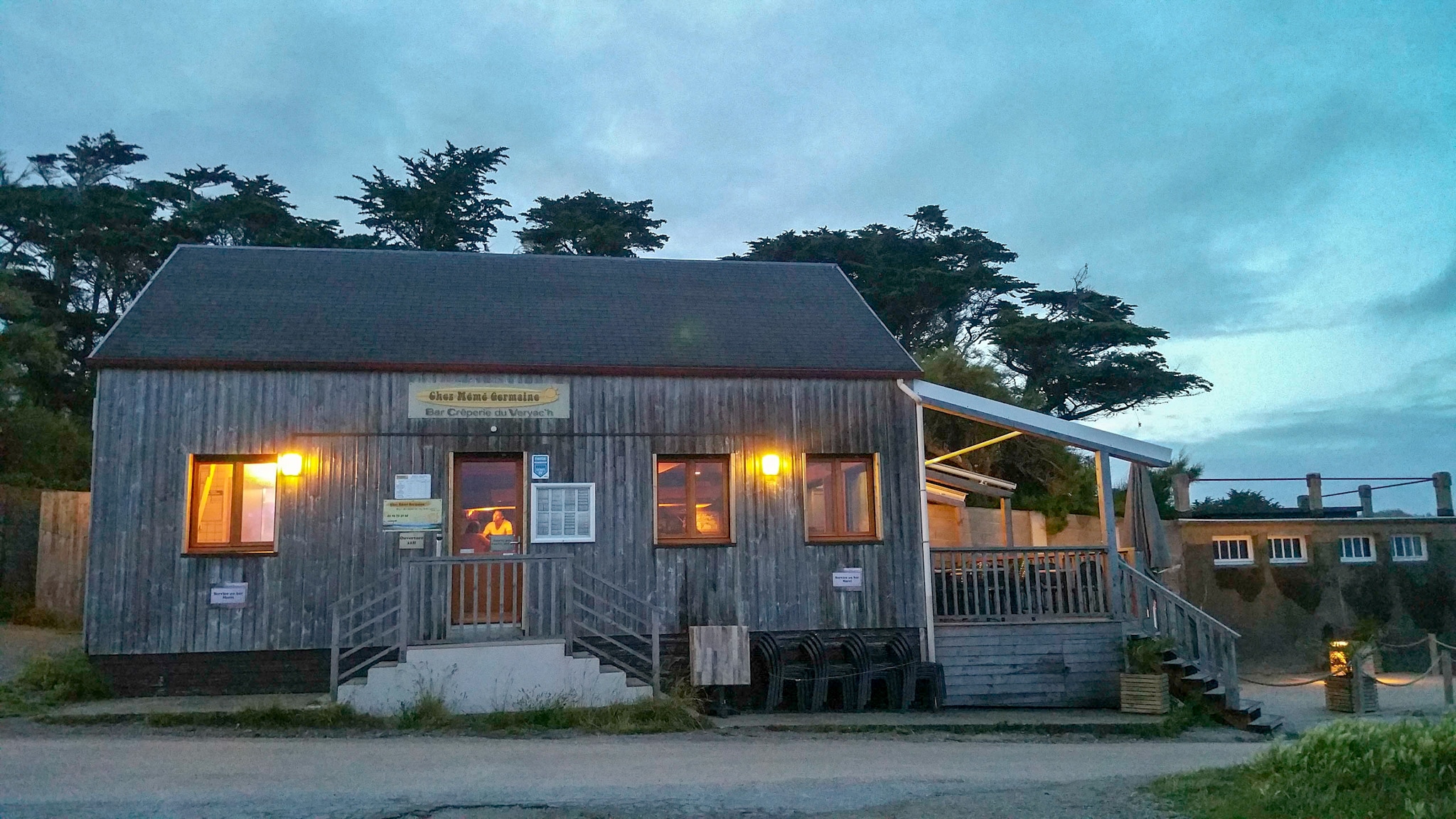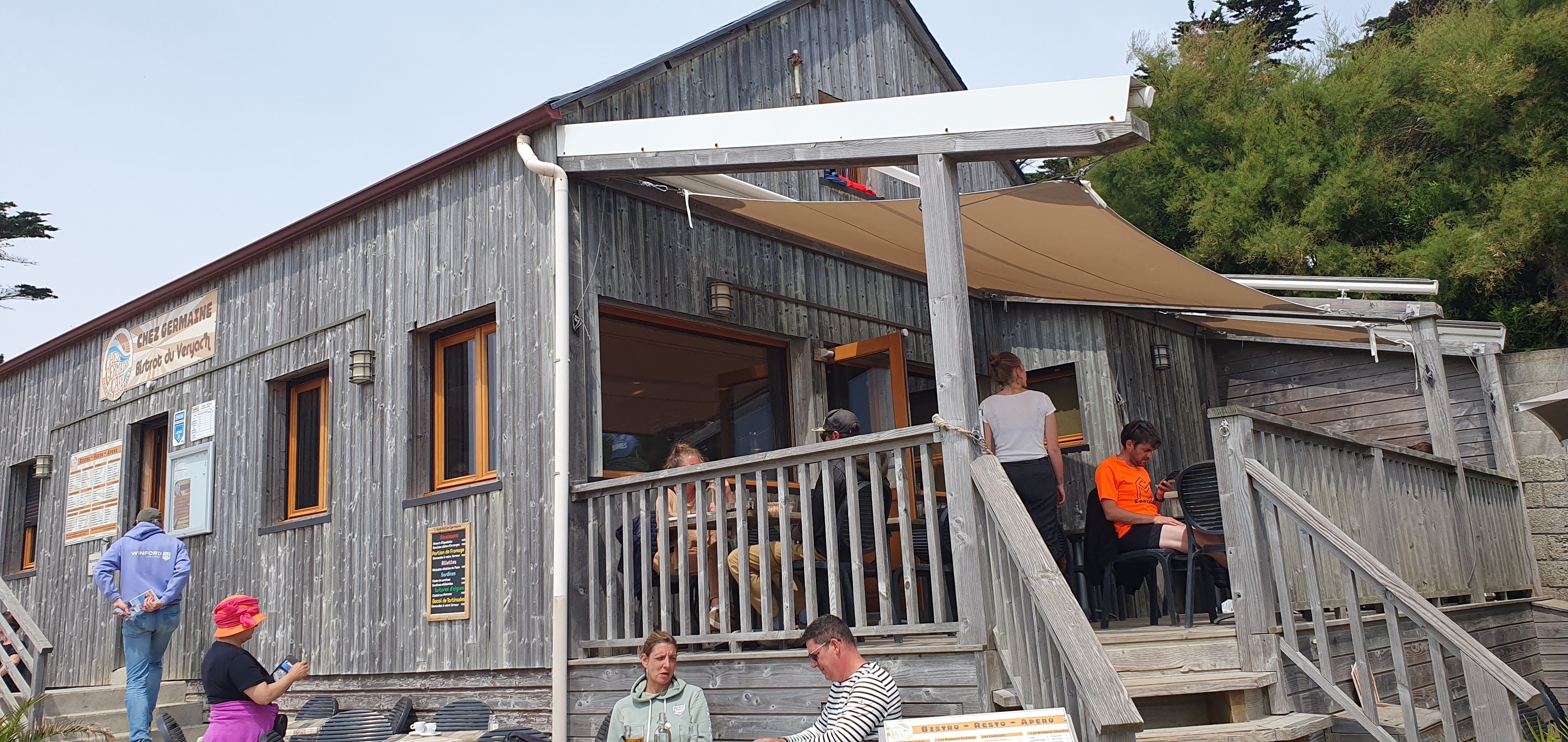 C'est après une bonne balade sur le GR 34 depuis le centre de Camaret-sur-Mer, en passant par la pointe du Toulinguet, que nous avons atterri à la plage de Veryac'h où se trouve le bar-crêperie Chez Germaine. Chouette ambiance. Une équipe jeune et dynamique est sur le pont et à la barre (... au bar plutôt) la manœuvre s'opère à 200% ! La vue sur la pointe de Pen Hir depuis la terrasse est somptueuse, mais nous avons préféré nous installer à l'intérieur. Bien nous en a pris car nous avons passé un très agréable moment au contact des membres de l'équipage. Les crêpes et les galettes sont très correctes et les prix aussi (pour 1 complète, 1 crêpe et 1 bolée de cidre, comptez une quinzaine d'euros). Un signe qui ne trompe pas, après que j'aie malencontreusement renversé le pichet de cidre (très largement entamé d'ailleurs), c'est avec le sourire que la serveuse a essuyé les dégâts et nous l'a remplacé gracieusement. Ça c'est commerçant 👏 et merci. Chez Germaine c'est aussi un caf'conc et des dates vous attendent tout au long de la saison, ça peut aussi tourner en boeuf pour un oui ou pour un non. Un coin parfaitement festif où les vacances coulent en douceur de 12h à 01h. Pas de réservation possible donc soyez prévoyants et patients, mais ça vaut le détour. 🏴☠️