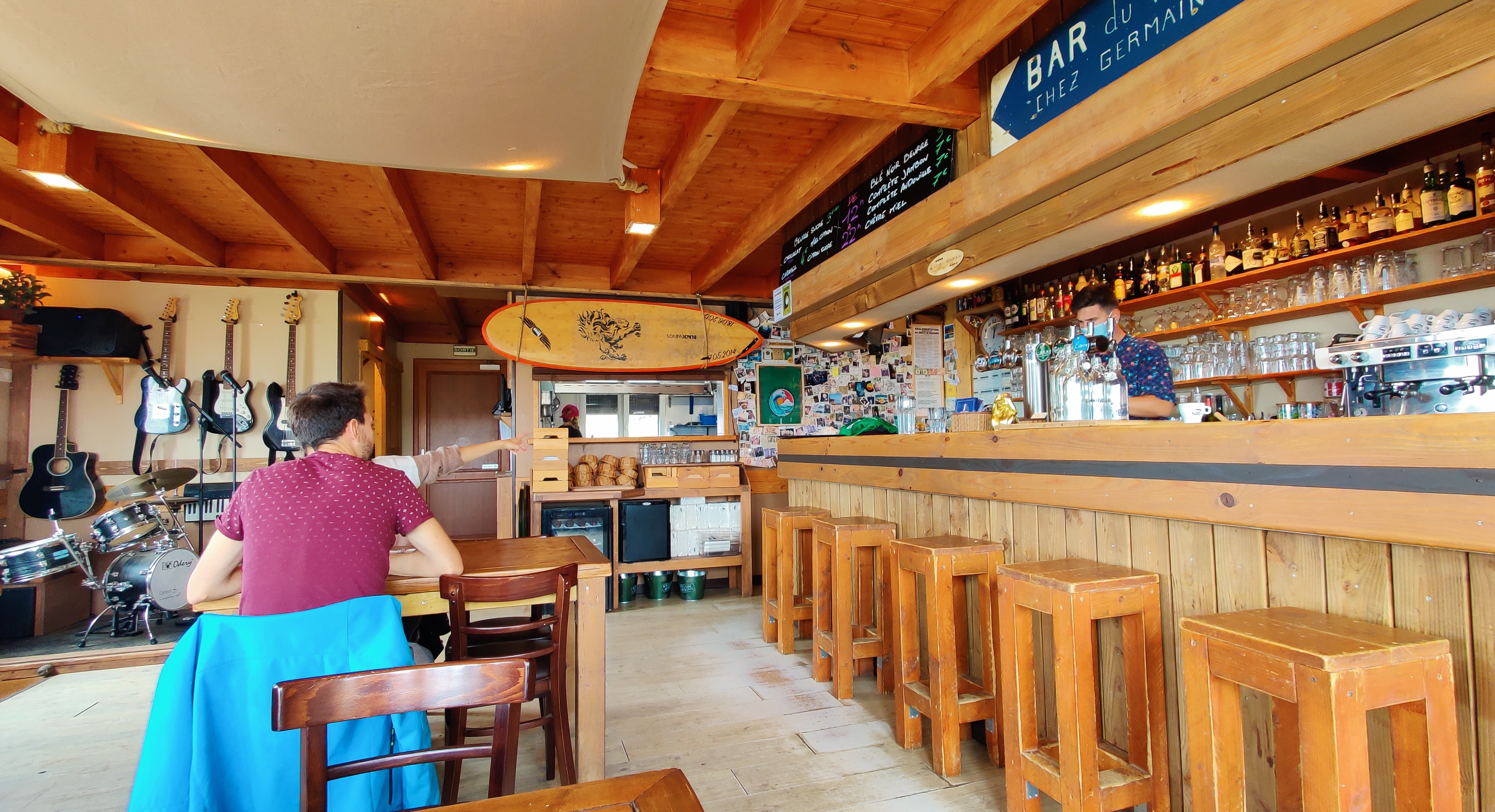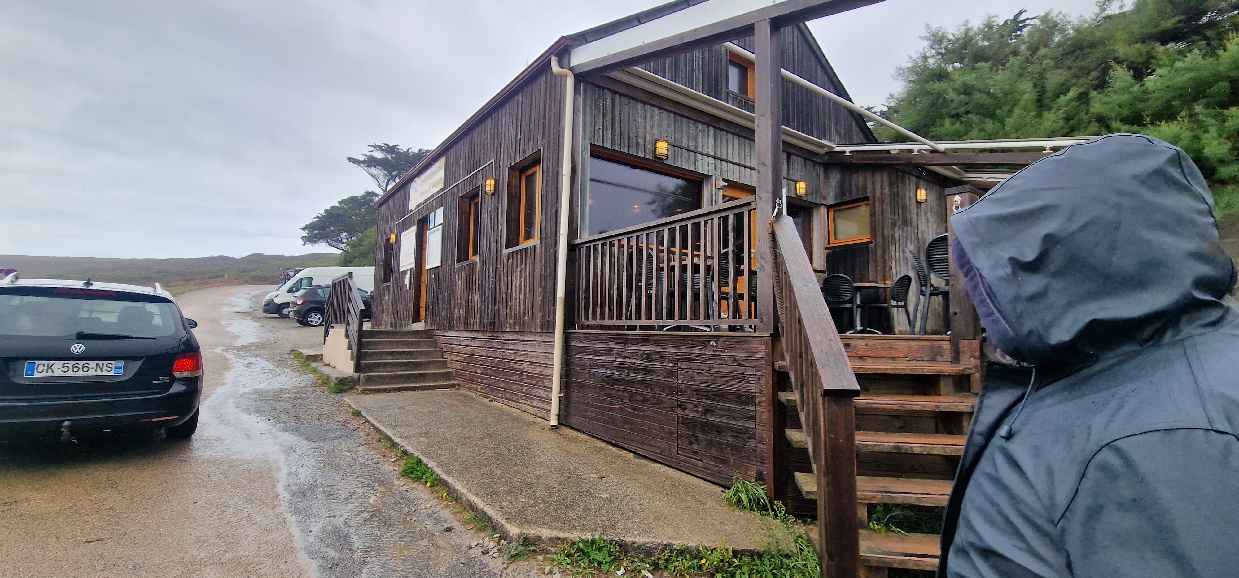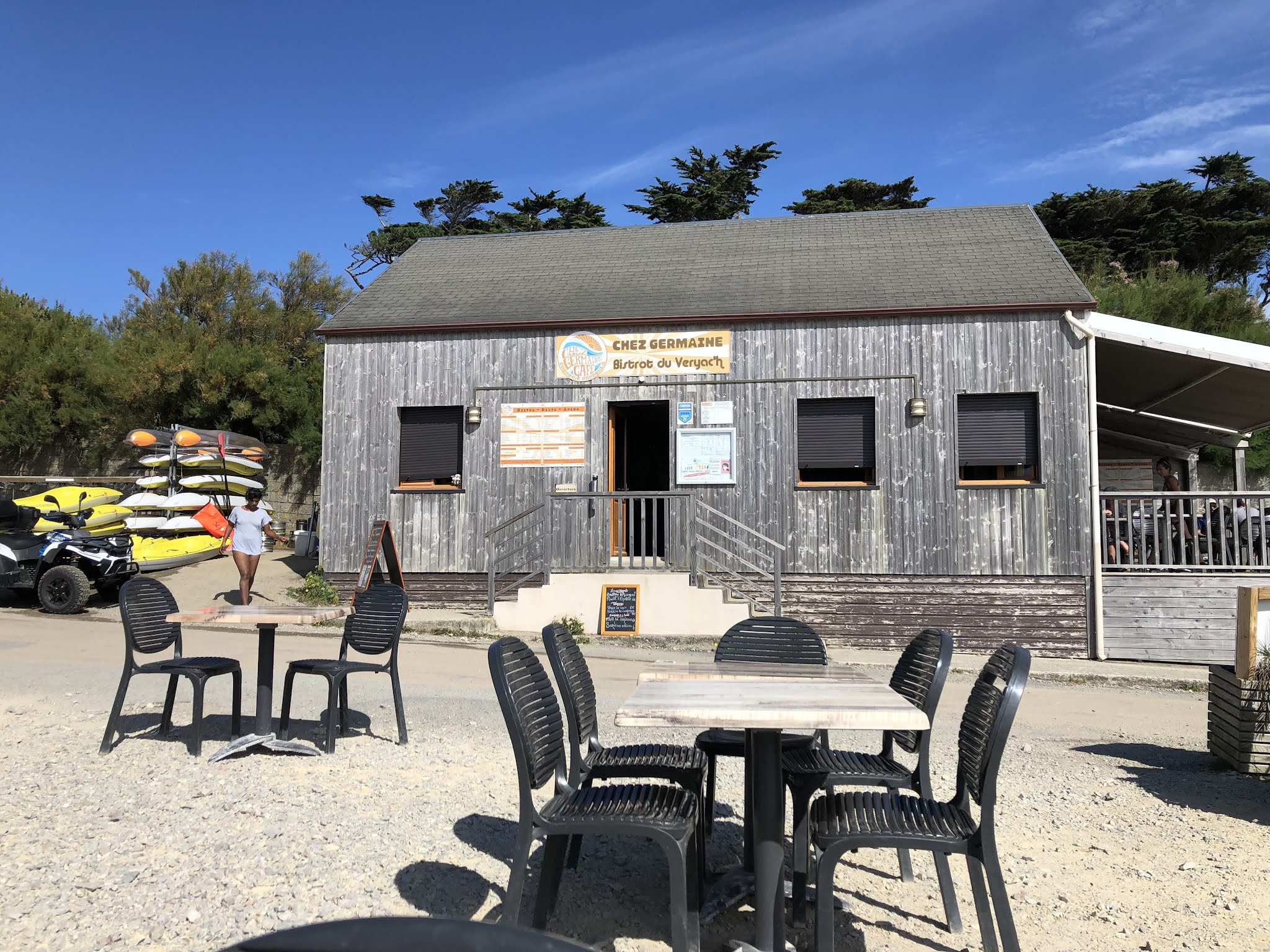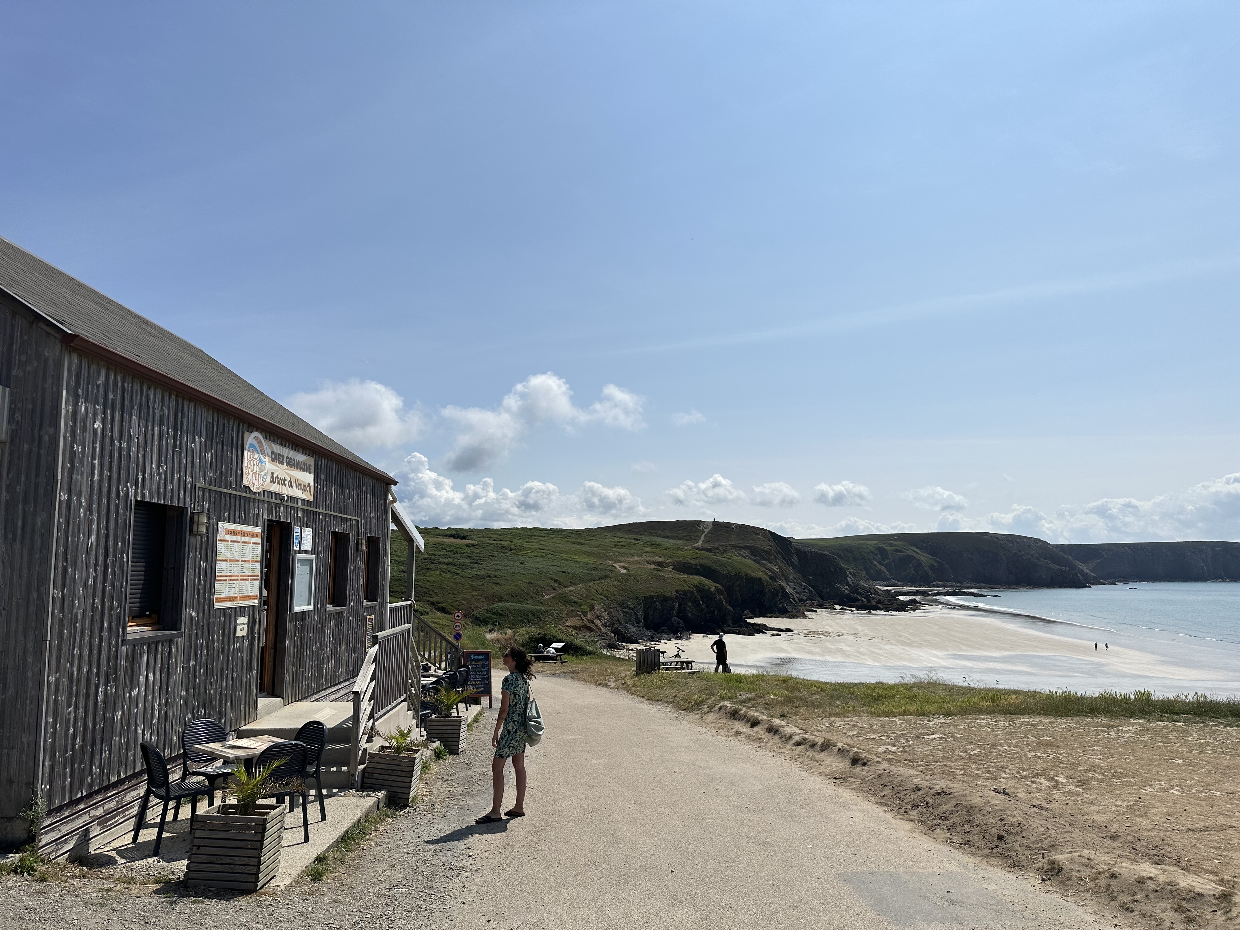 C'est après une bonne balade sur le GR 34 depuis le centre de Camaret-sur-Mer, en passant par la pointe du Toulinguet, que nous avons atterri à la plage de Veryac'h où se trouve le bar-crêperie Chez Germaine. Chouette ambiance. Une équipe jeune et dynamique est sur le pont et à la barre (... au bar plutôt) la manœuvre s'opère à 200% ! La vue sur la pointe de Pen Hir depuis la terrasse est somptueuse, mais nous avons préféré nous installer à l'intérieur. Bien nous en a pris car nous avons passé un très agréable moment au contact des membres de l'équipage. Les crêpes et les galettes sont très correctes et les prix aussi (pour 1 complète, 1 crêpe et 1 bolée de cidre, comptez une quinzaine d'euros). Un signe qui ne trompe pas, après que j'aie malencontreusement renversé le pichet de cidre (très largement entamé d'ailleurs), c'est avec le sourire que la serveuse a essuyé les dégâts et nous l'a remplacé gracieusement. Ça c'est commerçant 👏 et merci. Chez Germaine c'est aussi un caf'conc et des dates vous attendent tout au long de la saison, ça peut aussi tourner en boeuf pour un oui ou pour un non. Un coin parfaitement festif où les vacances coulent en douceur de 12h à 01h. Pas de réservation possible donc soyez prévoyants et patients, mais ça vaut le détour. 🏴☠️