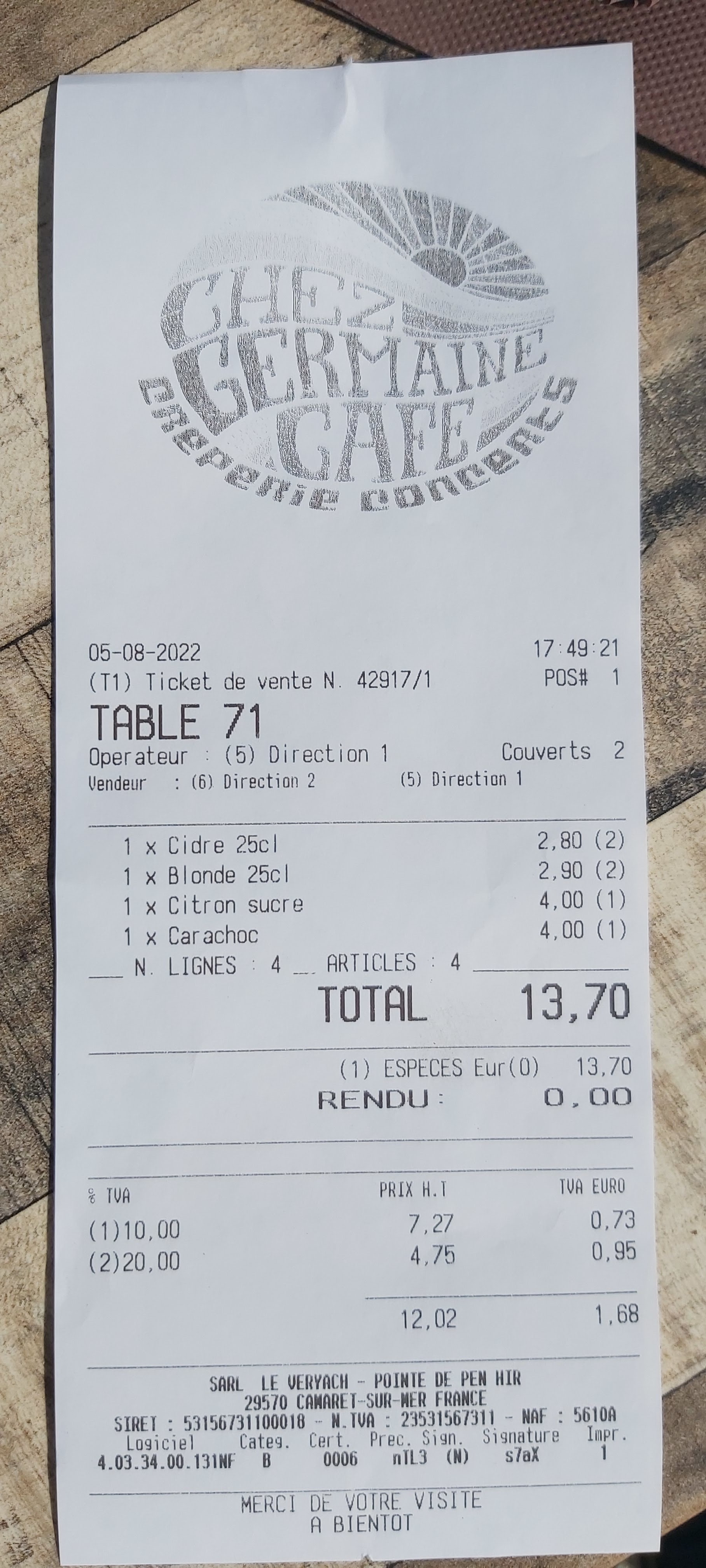 Rien de tel qu’une crêpe au chocolat un un bon cidre artisanal après une grosse rando dans le crachin pour se réchauffer! Chez germaine une institution qui a su garder sa simplicité et des prix raisonnables pour accueillir des gens aux salaires normaux. Merci!