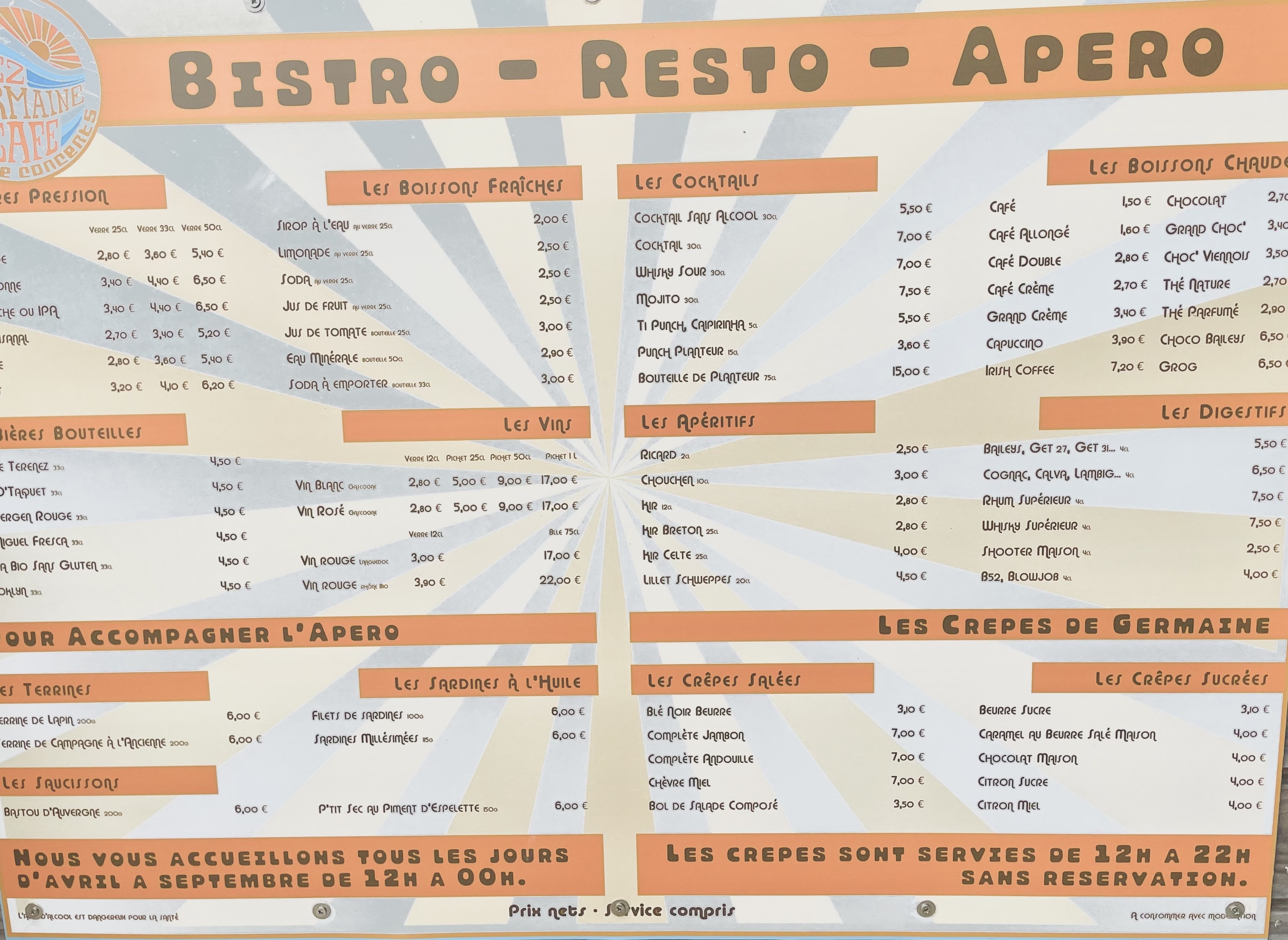 Super moment chez germaine, malgré un grand nombre de client et d’attente, le personnel s’est montré super agréable, arrangeant et efficace ! + le spot qui était super sympathique