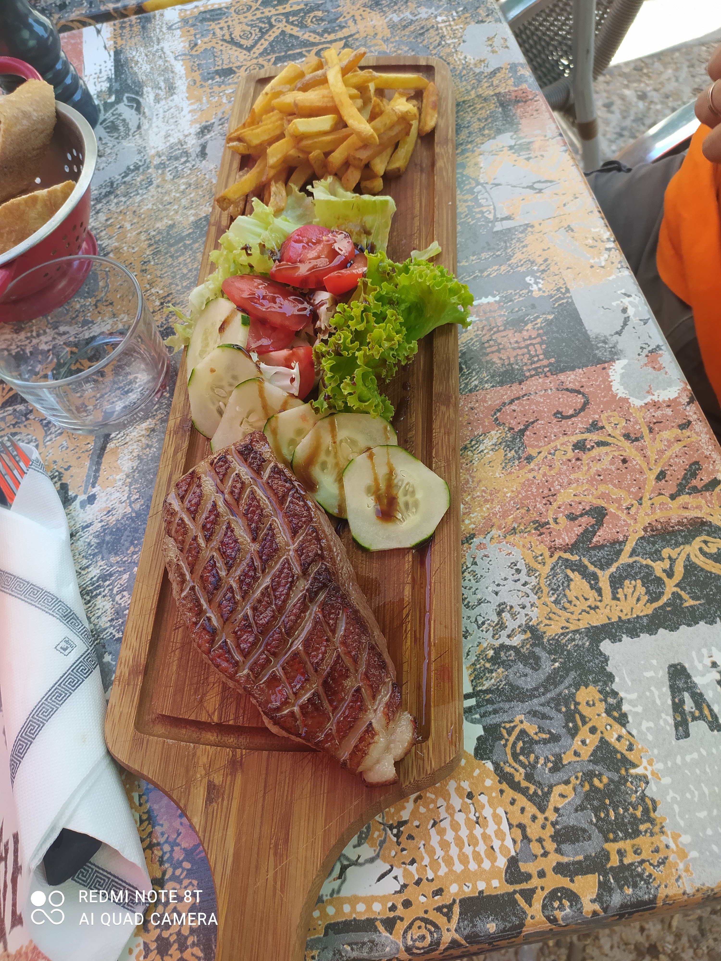 Ce soir, nous avons dégusté un délicieux Magret de Canard. Cuit au four à la perfection, servi avec frites et laitue. L'aïoli fait maison avec les frites était un changement savoureux par rapport à la mayonnaise ordinaire. L'ambiance est très conviviale et il y a un mélange de locaux et de touristes comme nous. En plus du français, les propriétaires parlent aussi anglais et même espagnol... et si vous n'y parvenez toujours pas, vous pouvez toujours utiliser vos mains et vos pieds pour vous faire comprendre. Le menu change régulièrement pour que les photos soient un instantané. Essayez également de décrypter les commentaires humoristiques entre les deux... un bon exemple de l'ambiance agréablement détendue. Même si seule la propriétaire Caroline est aux commandes et qu'il y a de nombreuses tables, vous n'aurez pas à attendre longtemps pour son attention et son service. Les prix restent très raisonnables avec l'achat actuel d'ingrédients coûteux.