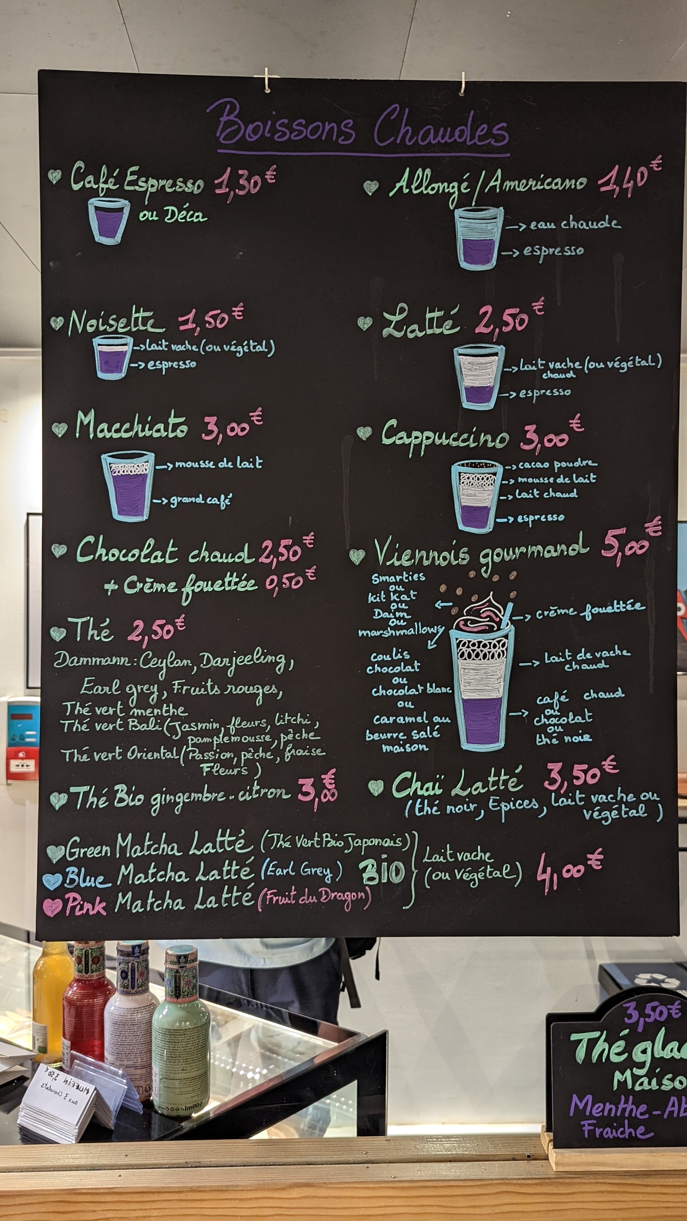 Deux cookies deux cafés une panna cotta pour 11,50 €. Plutôt bon. Par contre quand les enfants demandent un verre d'eau c'est non il faut acheter une bouteille 1,50€.