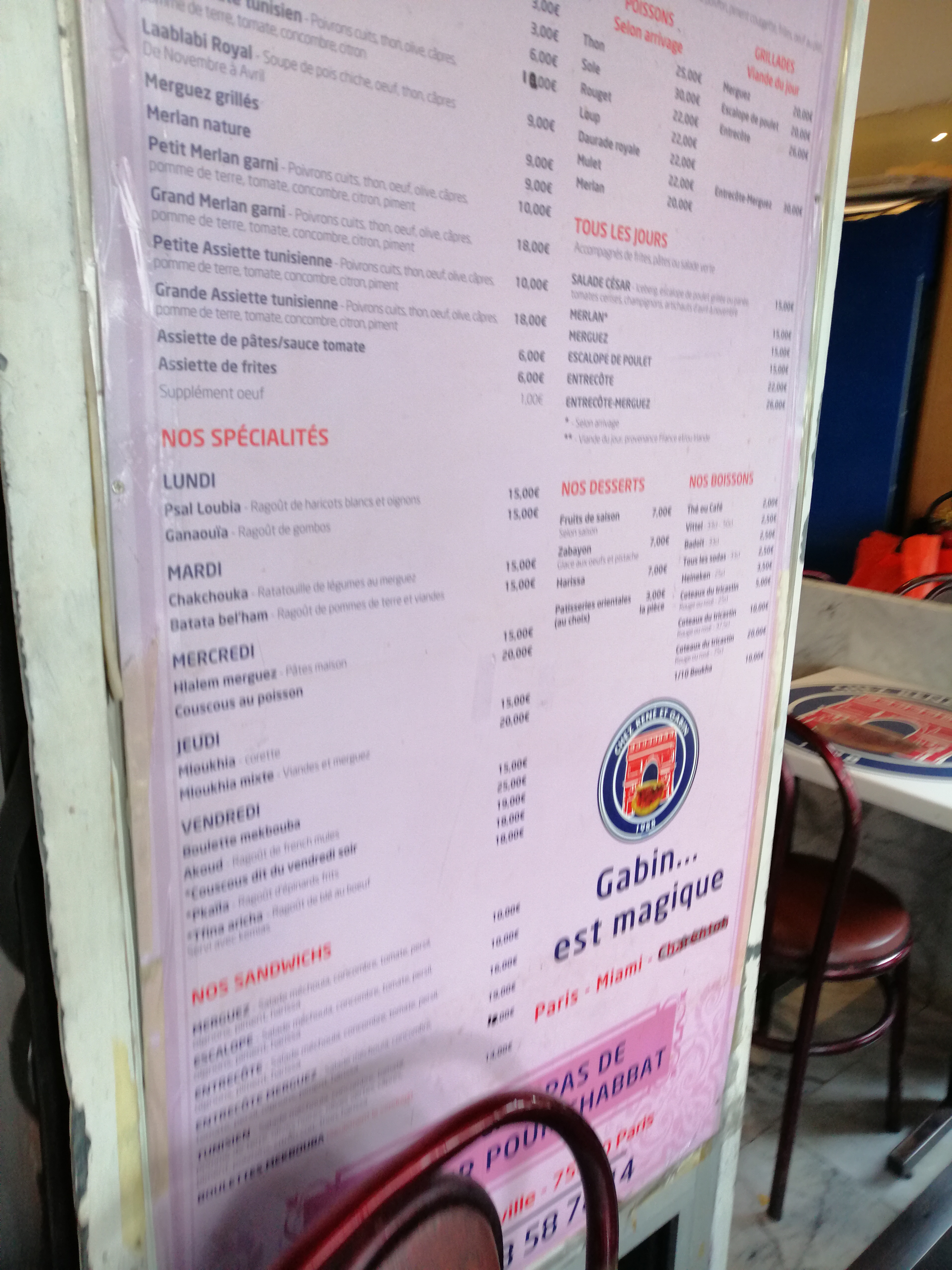 Tout est bien, que ce soit l ambiance (animée comme il faut !) ou les plats, cela faisait des années que nous n avions pas mangé de sandwich tunisien, et nous nous sommes régalés, la soupe de pois chiches est délicieuse, les briks à l œuf également, nous en avons également pris à emporter pour la famille et tout le monde a adoré ! En bref à très bientôt pour les plats du jour (mloukhia du jeudi, couscous pkaila et etc) Les sanitaires (en dehors du restau) ne sont vraiment pas top