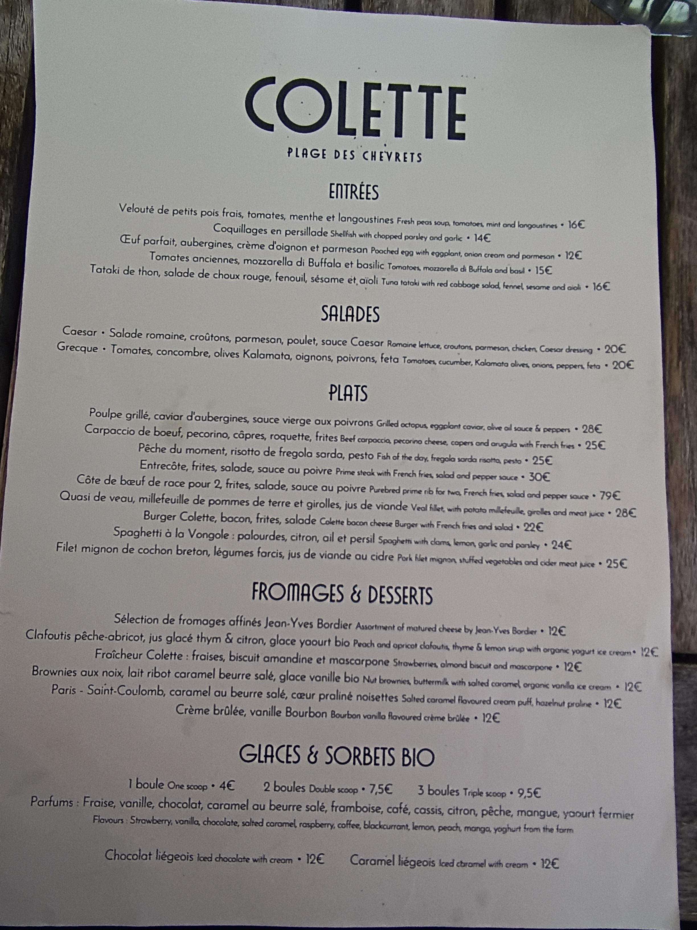 Posté le 17/12/2024 à 10:47"Super moment chez Colette, même par temps chargé c’est superbe, la mer qui nous borde, les nuages qui défilent et qui viennent changer la couleur de l’eau et du ciel , ce spectacle accompagne dignement les plats succulents qui nous sont servis dans une ambiance à la fois chaleureuse et cosy ! L’équipe est très sympathique et pro.Nous reviendrons. (Petite amélioration possible : prévoir un vestiaire et revoir le confort de certaines des chaises en rotin). Merci"