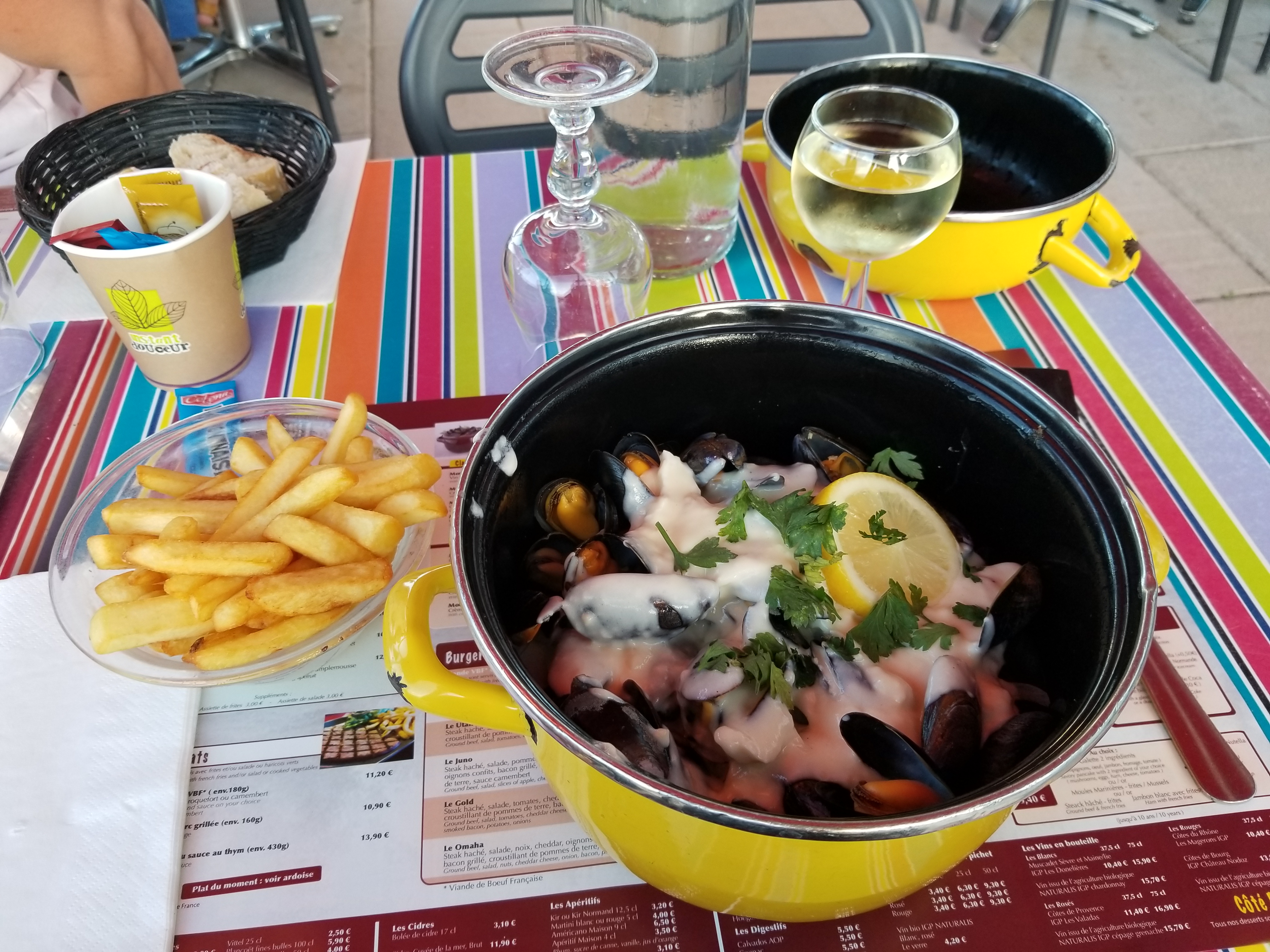 Moules commandées pour emportées, très bonnes et portions copieuses. Servies très rapidement donc je recommande ! Dommage pour les frites, la quantité était légère et on aurait préféré des frites maison !
