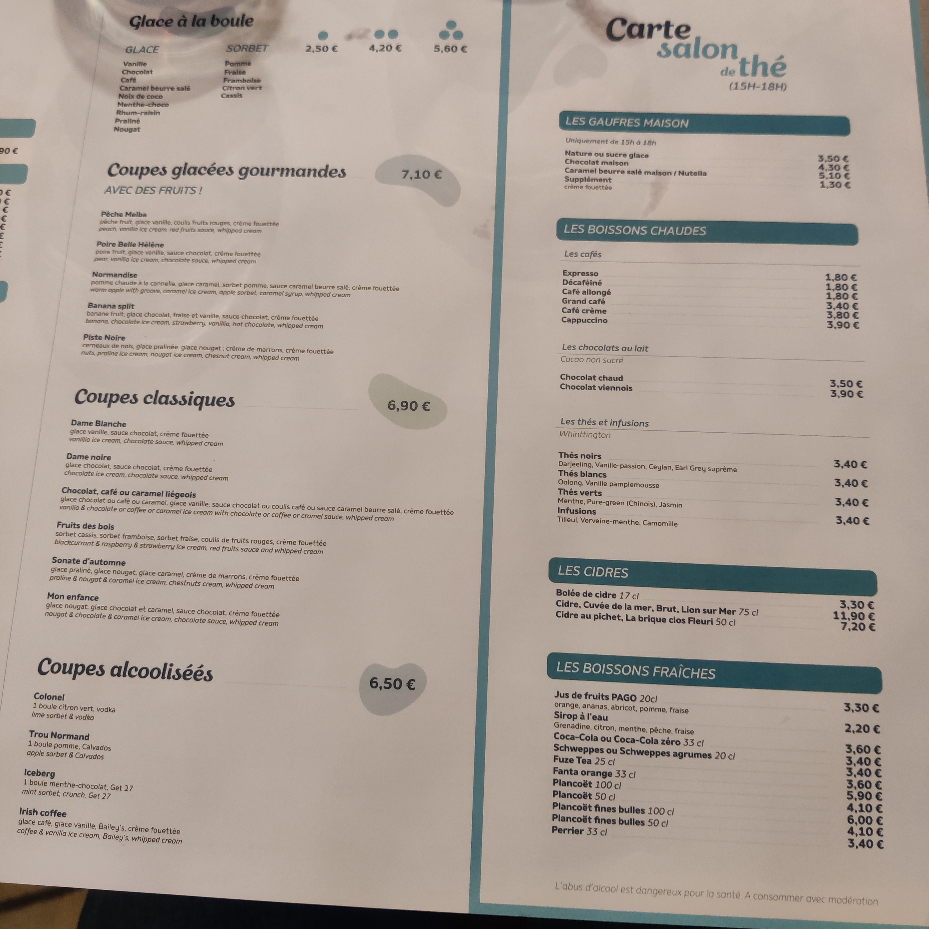 Nous nous sommes posés dans ce restaurant en début d’après-midi pour manger une glace. L’attente a été assez longue avant que l’on nous apporte la carte, mais ensuite tout à été assez vite. Nous avons commandé une dame blanche (7,10 € la coupe) qui est très bonne. Les serveurs / serveuses sont très sympa. A refaire à l’occasion pour goûter les plats à la carte.