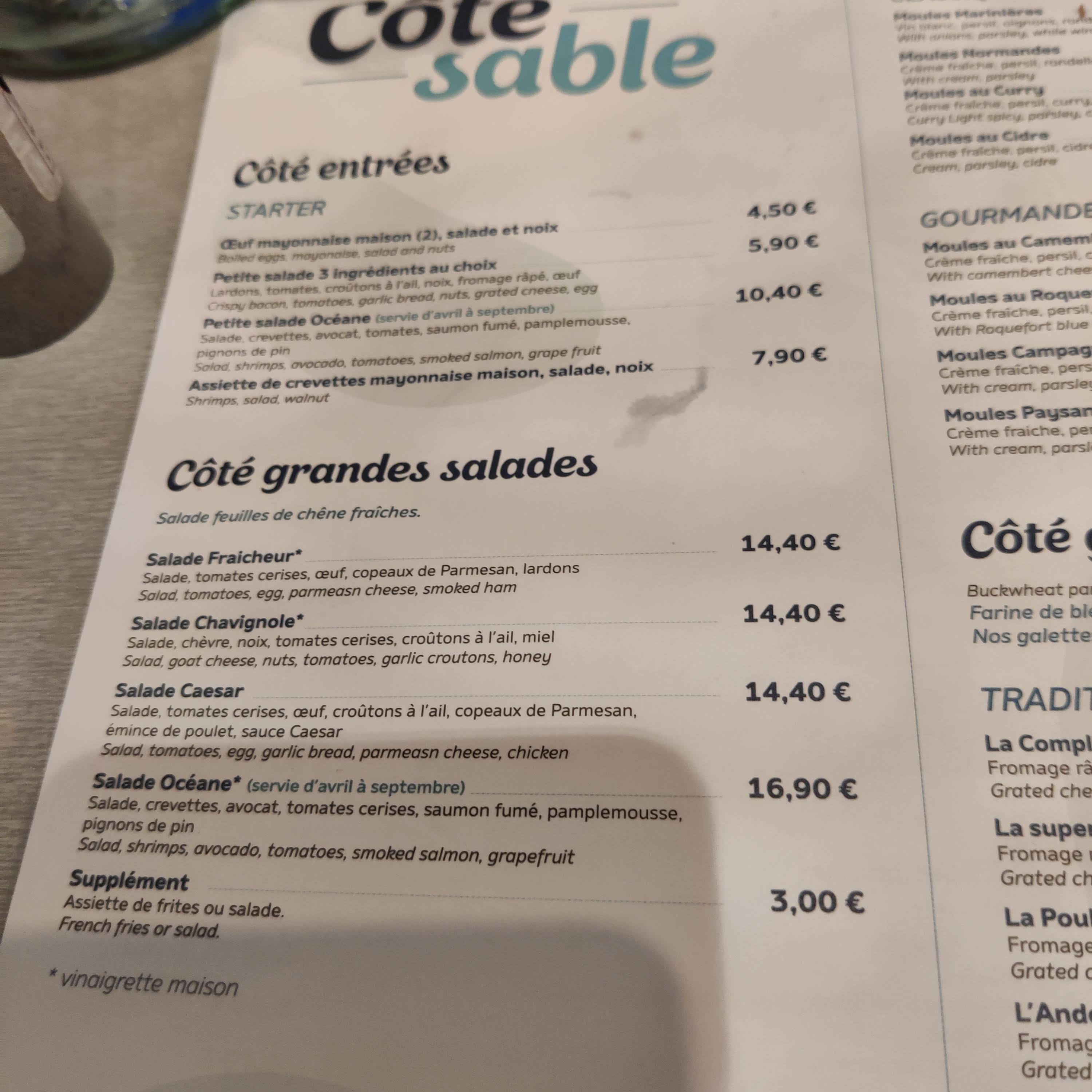 Bon acceuil , cuisine généreuse , sercice ok. Mais ce soir , 22 Août 2023 j'ai essayer de joindre ce restaurant plusieurs fois entre 19 h et 21 h sans succès pour reserver une table pour 9 personnes . J'ai donc réservé chez son concurent direct situé juste à côté , le Crabe Vert qui a repondu au premier appel Même si mon appel chez côté sable était pendant le service du soir , il ne me semble pas professionnel de ne pas prendre les communications .