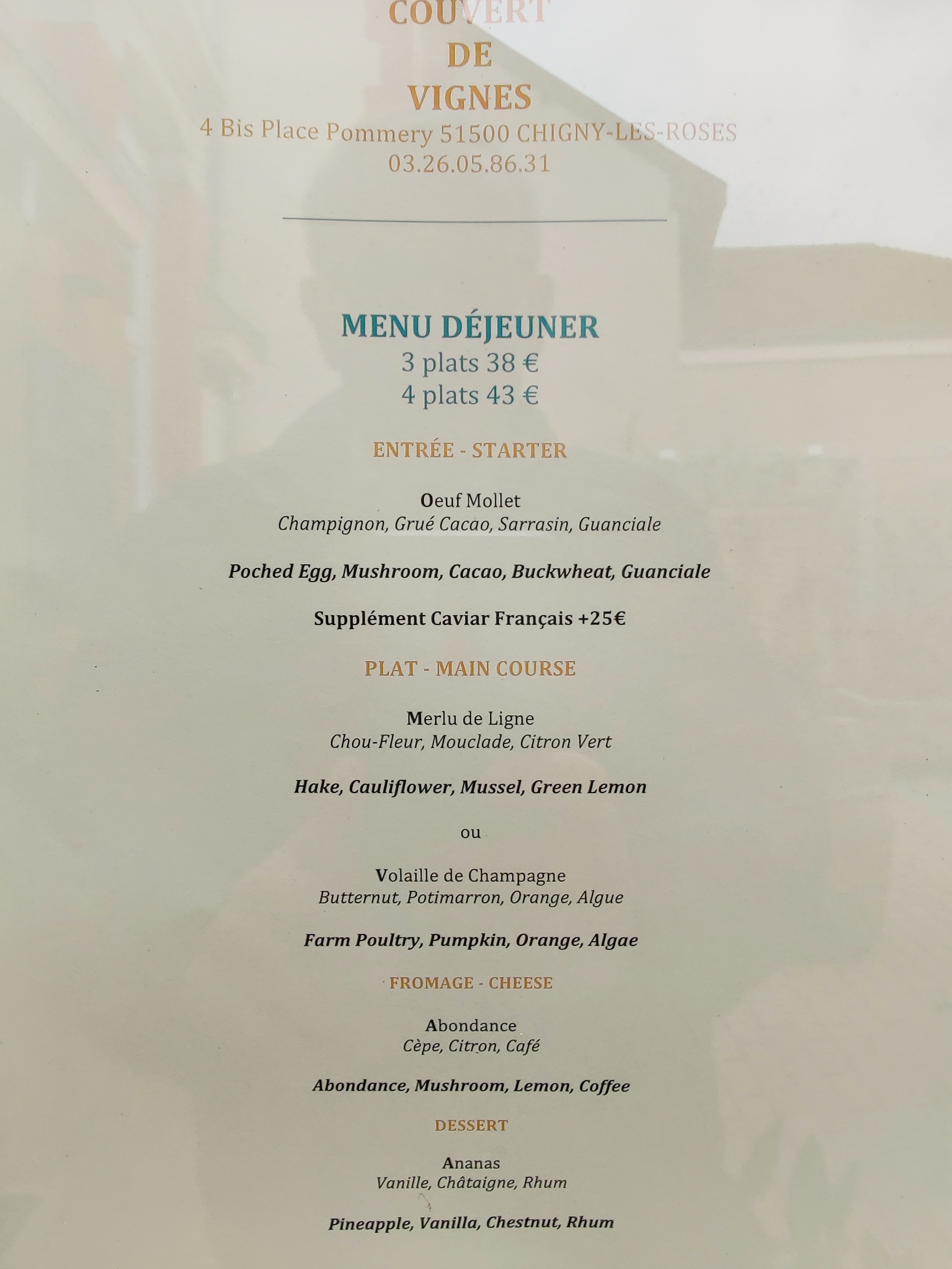 Nous avons passé un excellent moment au « couvert des vignes ». Le menu est copieux et les plats délicieux: une très sympathique et enrichissante découverte de mélanges de saveurs , le tout accompagné d’une proposition de champagne singuliers se conjuguant parfaitement avec les plats. Le service est irréprochable et nous vous en remercions. Nous aurions voulu en apprendre davantage…l’occasion de revenir une prochaine fois. Félicitations pour le ( courageux) travail accompli: une belle réussite locale à promouvoir !