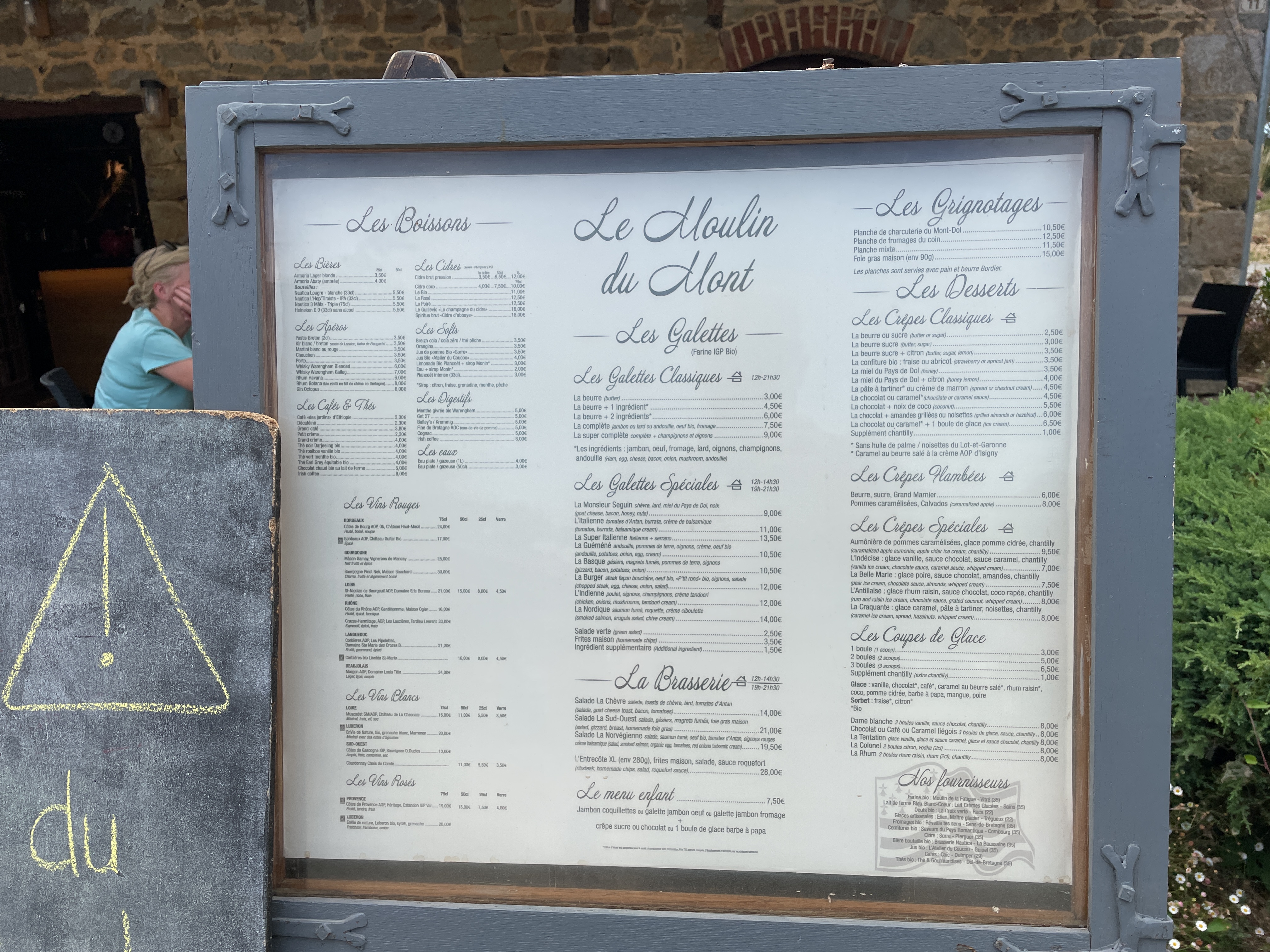 Nous avons manger une Galette Super avec du cidre doux, un vrai régal en plus un équipe gentille et serviable avec toujours un petit mot d’humour. Et pour le belge que nous sommes ; leur mayonnaise est faite maison. Vraiment à conseillé et comme on dit dans certains guides : vaut le détour ! Et profite bien d’une belle vue sur le Mont Dol