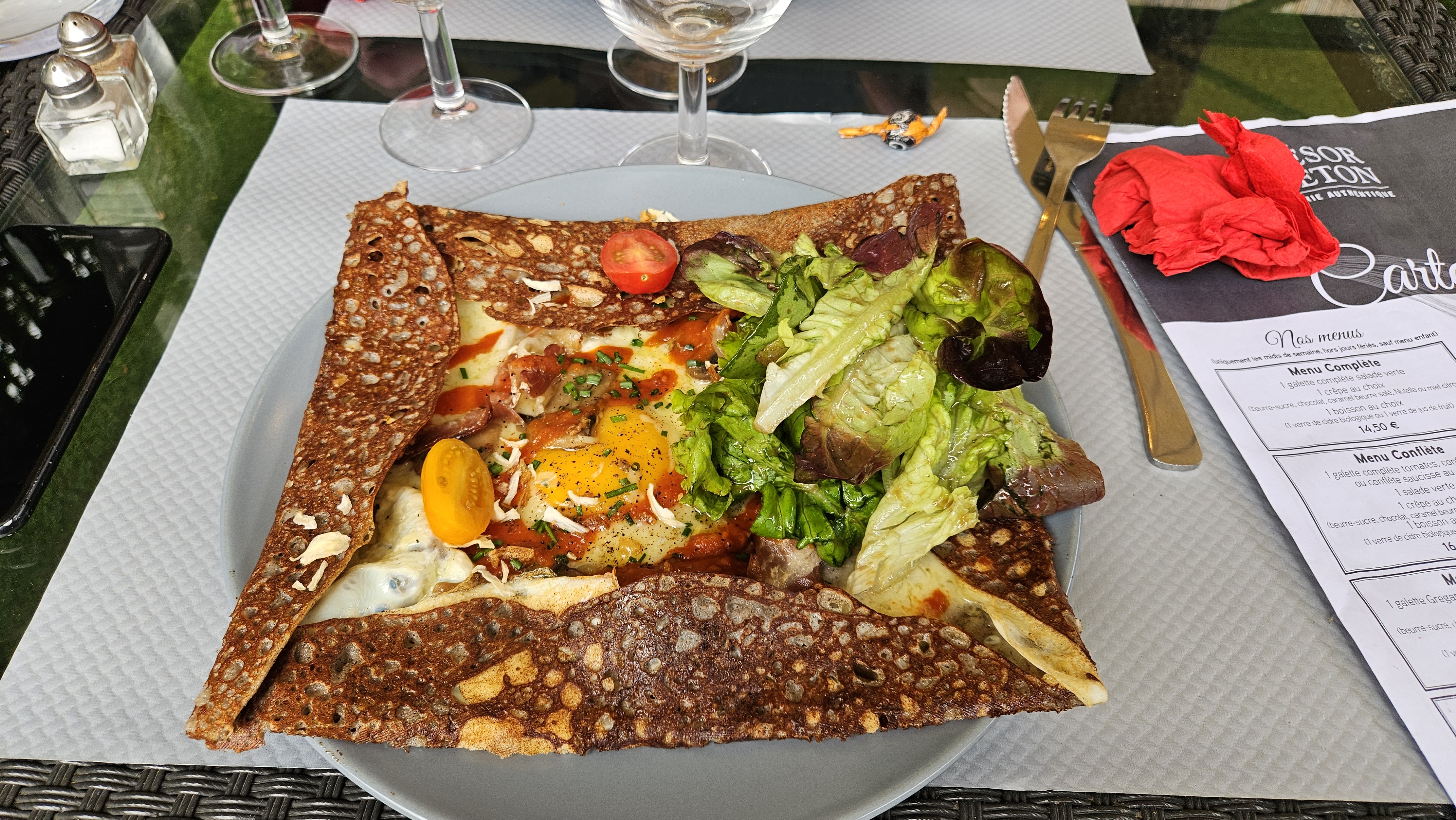 Posté le 24/05/2023 à 21:13"Galettes croustillantes à l'extérieur et tendres à l'intérieur, bien garnies, les oignons confits et non crus et les crêpes sont aussi excellentes. A ne pas louper."