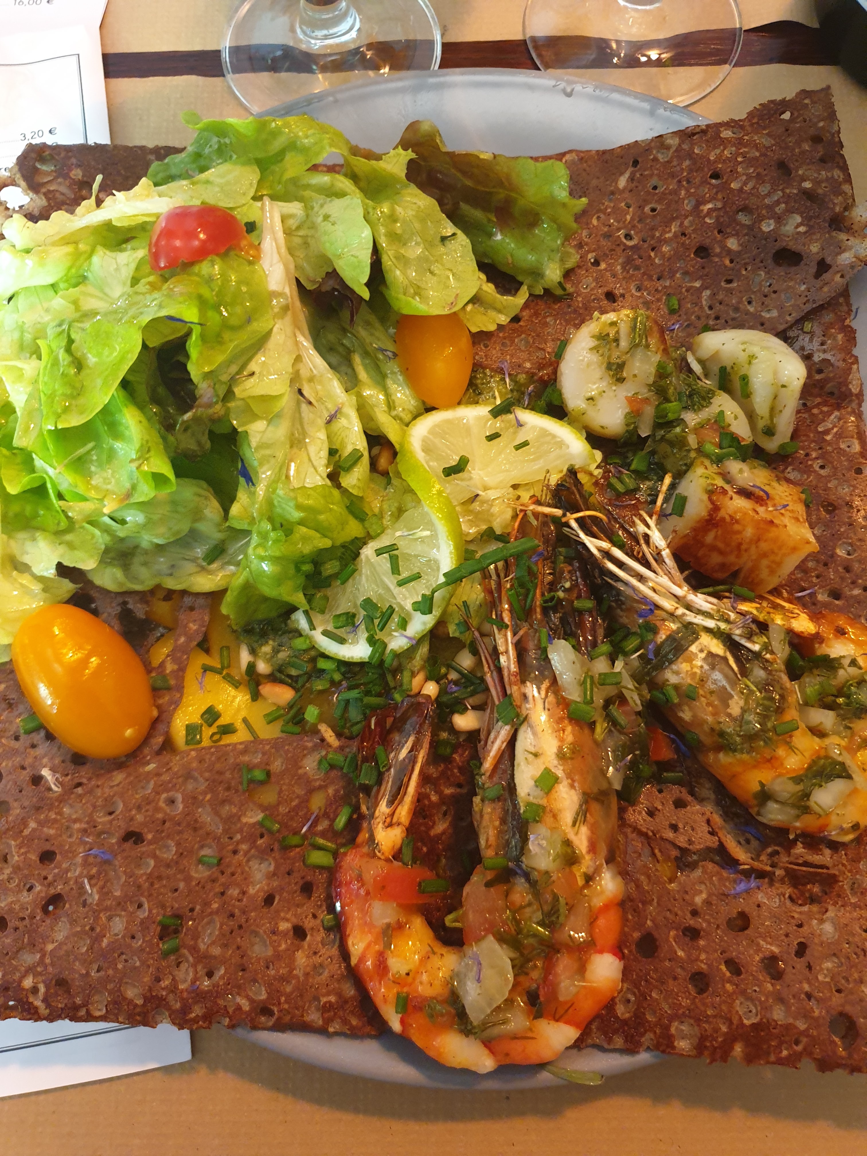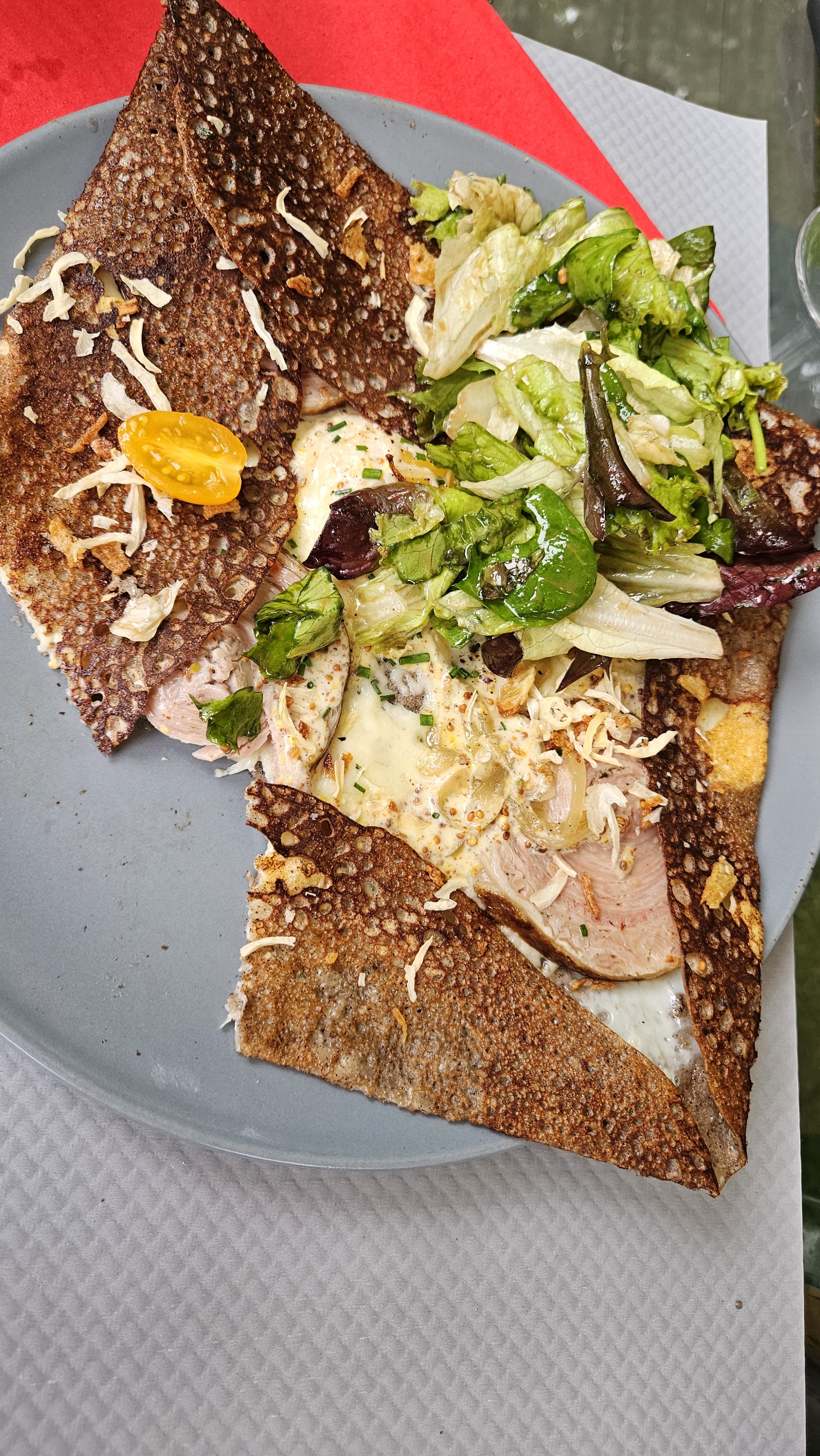 L’accueil est moyen. On nous propose une table en extérieur. C’est sale. Il y a du pollen sur les tables et de la saleté qui ne date pas d’aujourd’hui. On entend un avion grande ligne toutes les 5 minutes. C’est très bruyant. On commande nos crêpes on est 4. Et pourtant il y a une qui n’a pas été respectée. Erreur de la serveuse très gentille ou du cuisinier très distrait ?! Salade à 3,50€ c’est abusé car il n’y a rien dedans. Les crêpes sucrées sont meilleures que les salées qui arrivent à peine chaudes. 85€ 3 adultes et un enfant c’est très (trop) cher pour des crêpes servies dans un endroit qui manque de cachet et de sérieux. Je ne comprends toujours pas les supers avis sur toute la toile.