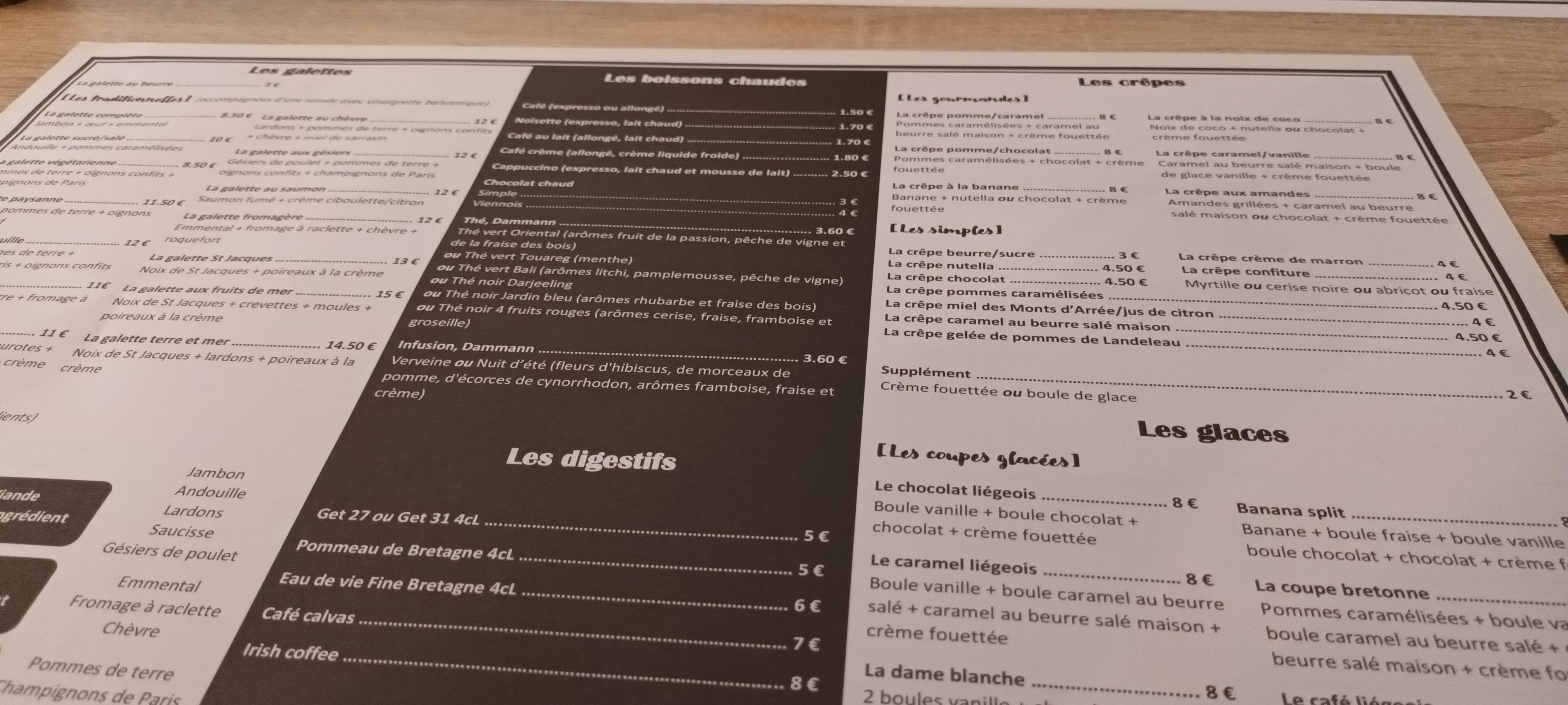 Cartes de crêpes très sympa, prix raisonnables et 3 menus possibles dont 1 menu enfant à 10€ sans limite d’âge ! Nous étions 10 et le restaurant nous a fait une tables pour 4 adultes et 6 enfants : c’était parfait ! LOL