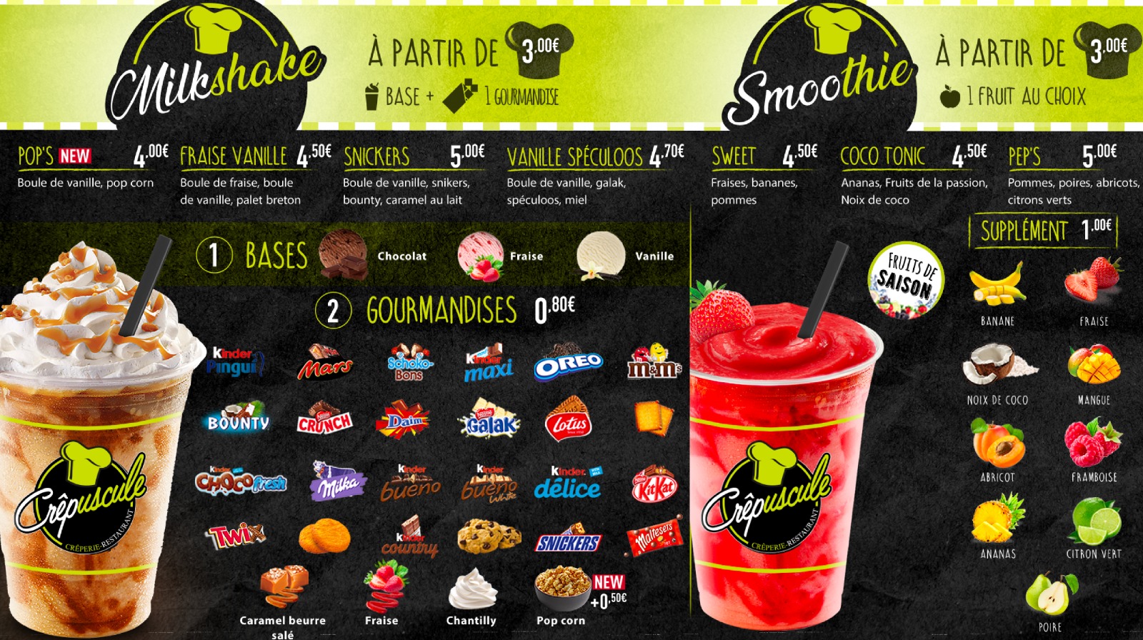 Milshake base vanille avec kinder bueno + kinder country + chantilly Très frais et super bon à déguster, parfait lorsque l'été arrivera Personnel très agréable et vous accueille avec le sourire Je recommande!