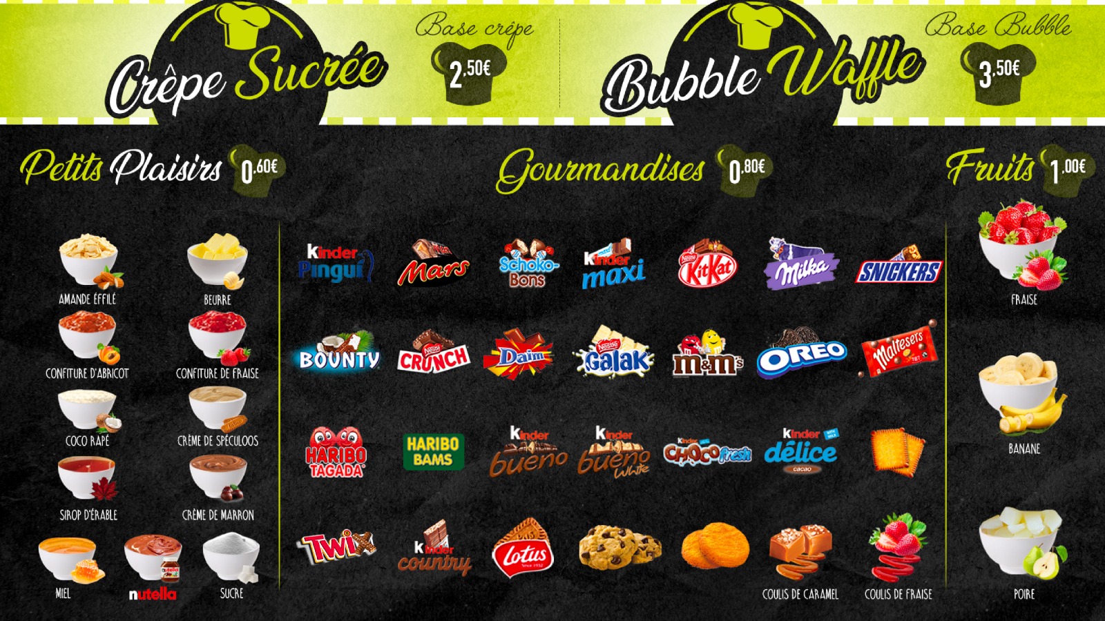 Crêpes 100% personnalisables, beaucoup de choix de garnitures, Hôtesse très gentille et souriante. Crêpes bien garnie.