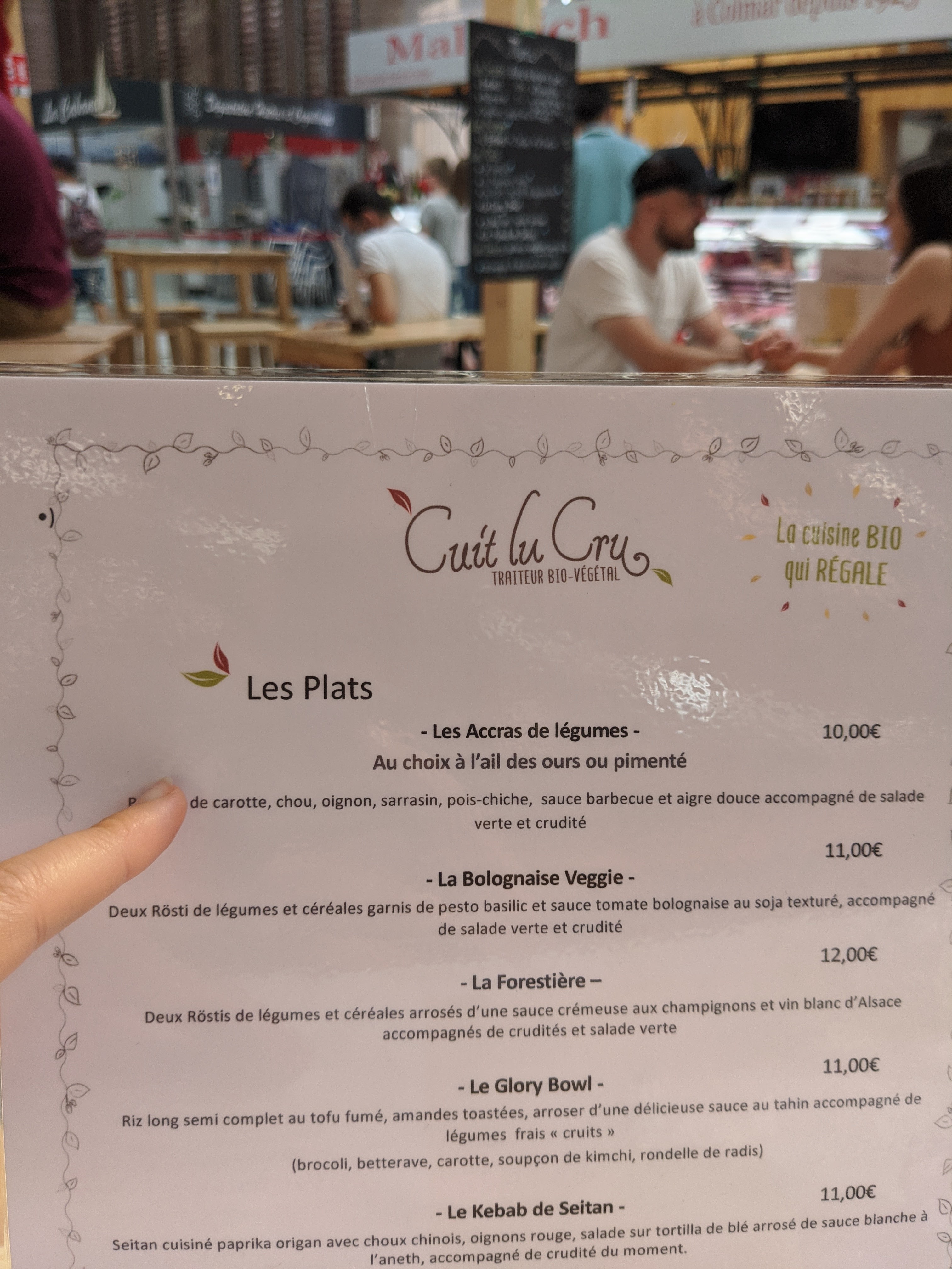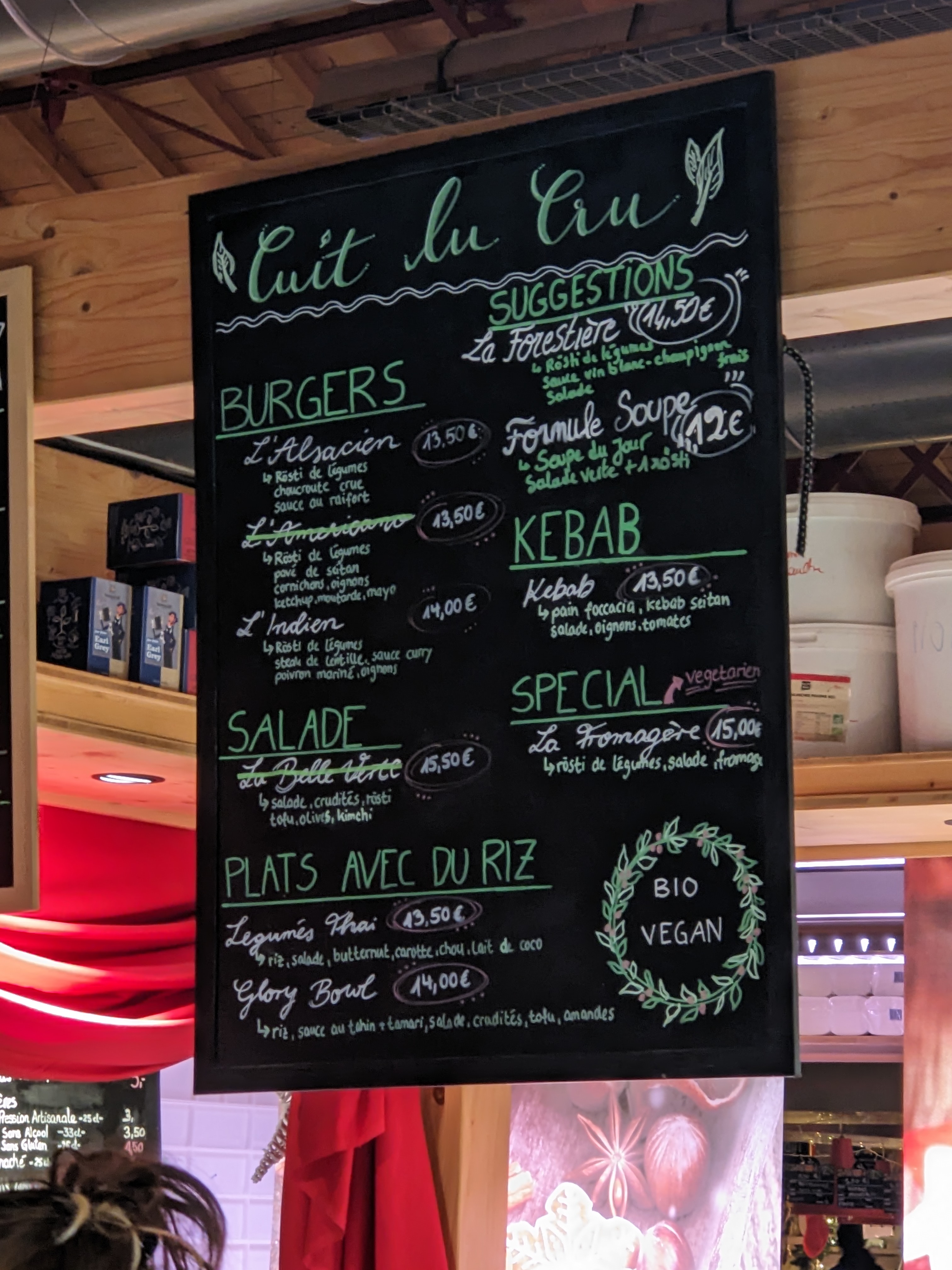 Cuit lu Cru est l'un des vendeurs de nourriture du Marché Couvert et ce samedi soir, ils étaient sur le point de fermer lorsque nous sommes arrivés. Ils ont un menu plastifié sur papier glacé (en français mais Google Translate le fera pour vous si vous le souhaitez) et à 18h45, un certain nombre d'articles étaient épuisés. Le restaurant est biologique et végétal. Service chaleureux à la caisse et nous nous sommes assis au comptoir où je pouvais regarder la nourriture se préparer. Assez occupées aussi tard et ces dames se bousculaient définitivement pour rester en avance sur la ruée de dernière minute. J'ai choisi le Burger Alsacien que je n'ai lu attentivement que Qu'est-ce que c'est ? était placé devant moi. Tant mieux car c'était assez délicieux. burger rosti aux légumes et céréales garni de choucroute crue avec tomates séchées et aubergines marinées avec sauce crémeuse au raifort et ail sauvage. C'était incroyable et parce que j'avais un dîner sain, j'ai mangé plus tard quelque chose de frit avec de la glace du marché de Noël.