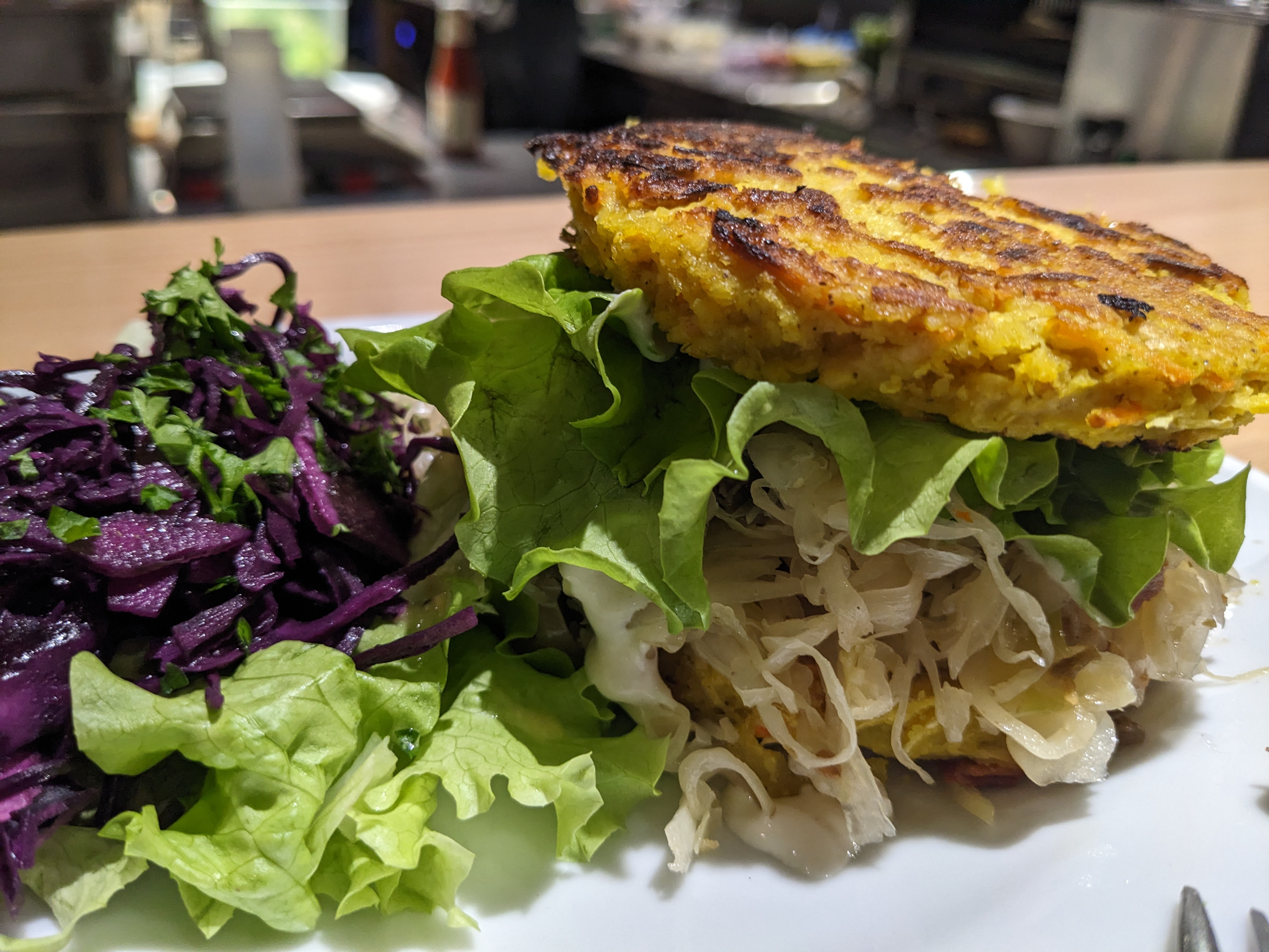 Sandwich kebab consommé, bon, bien assaisonné, copieux et pas lourd. Le burger alsacien : à mon goût la choucroute est excessivement acide et donc la saveur n'est pas bien équilibrée. La salade qui accompagne les deux plats est excellente. J'ai également consommé une salade de fruits avec de la crème végétalienne, bien. Des saveurs assez raffinées et pas évidentes avec des prix moyens.