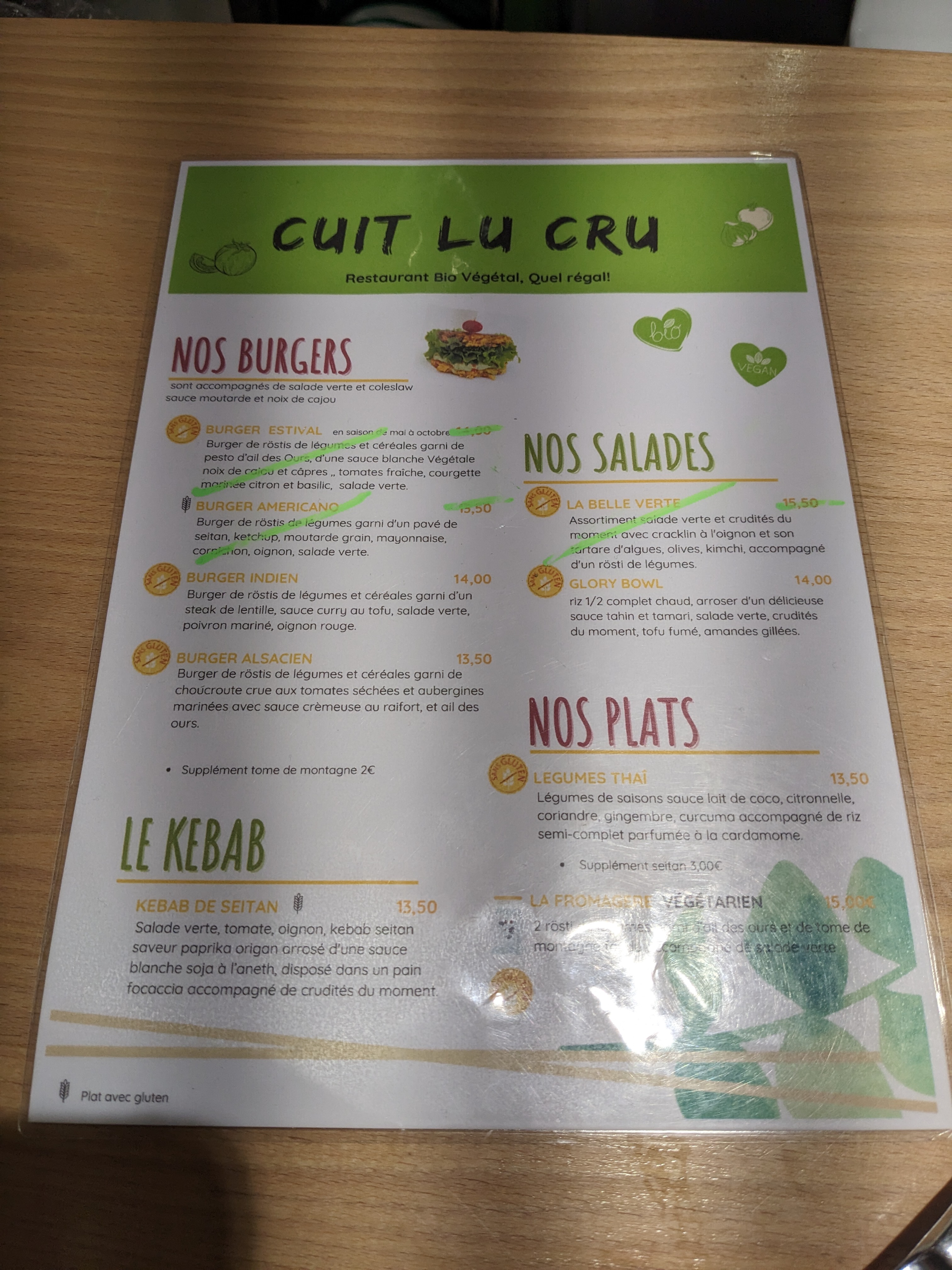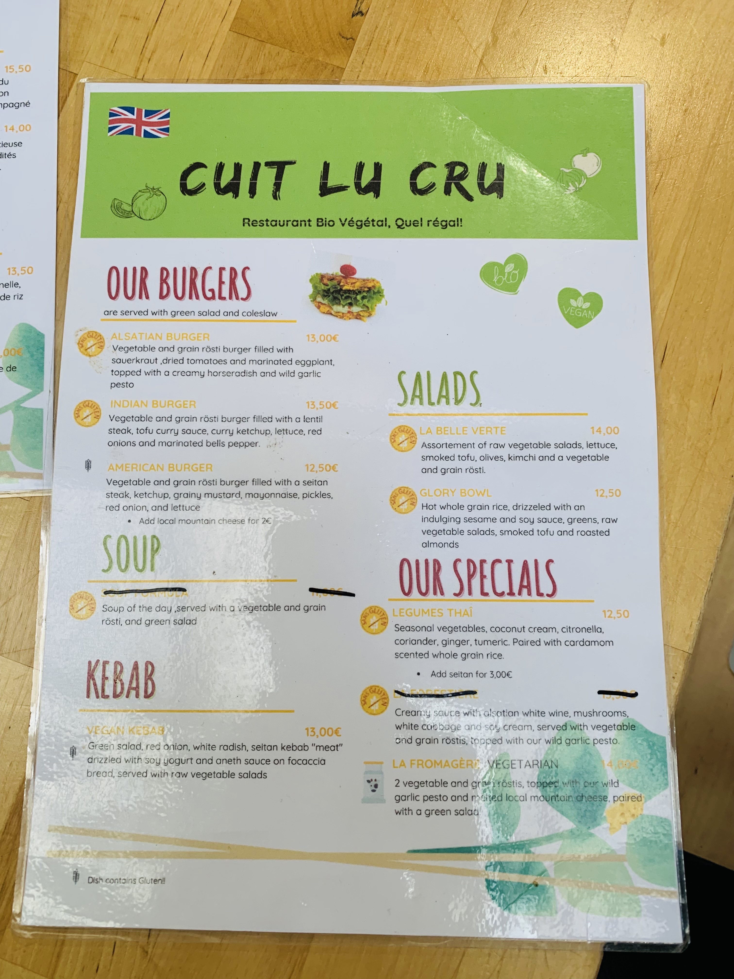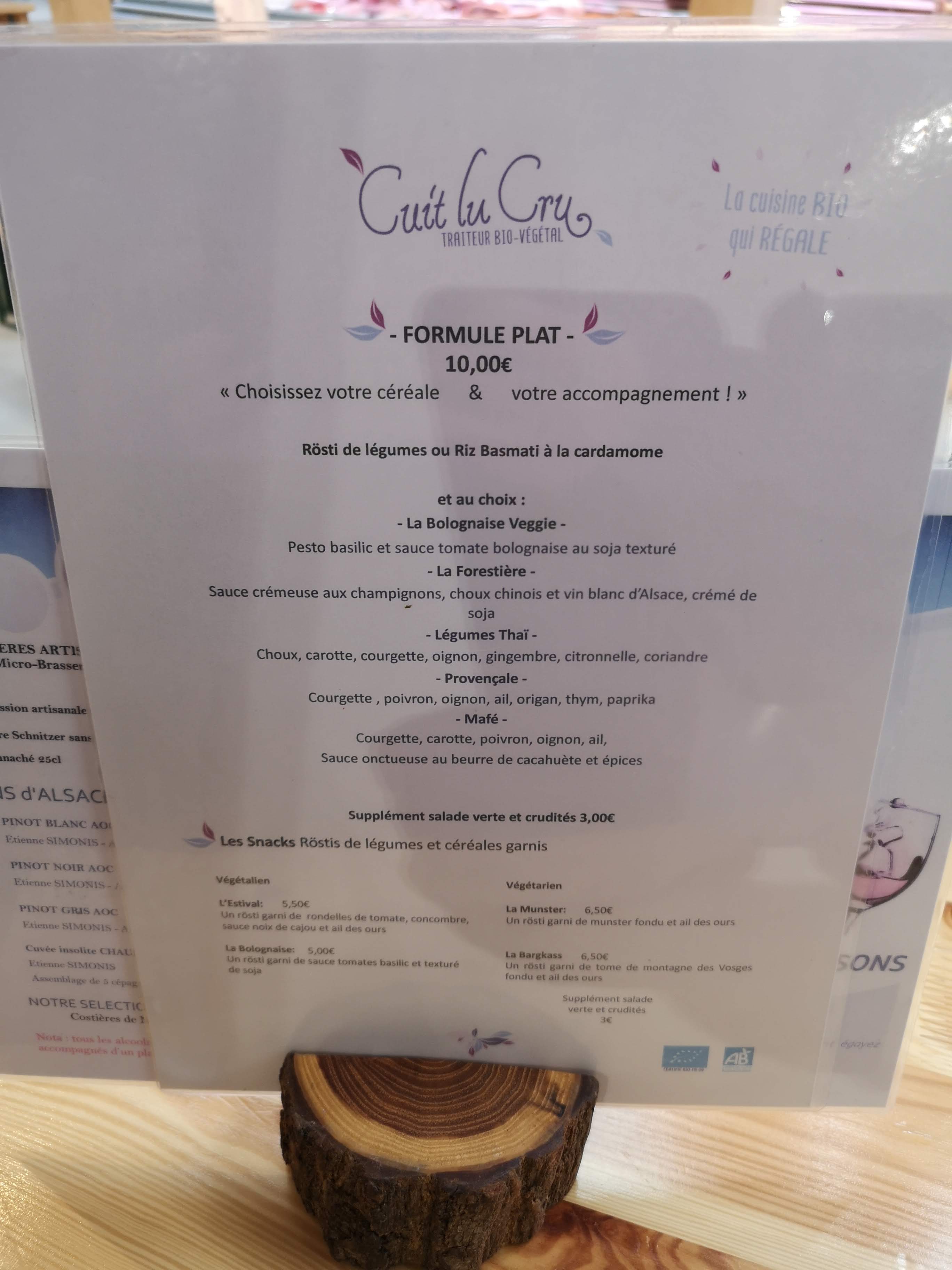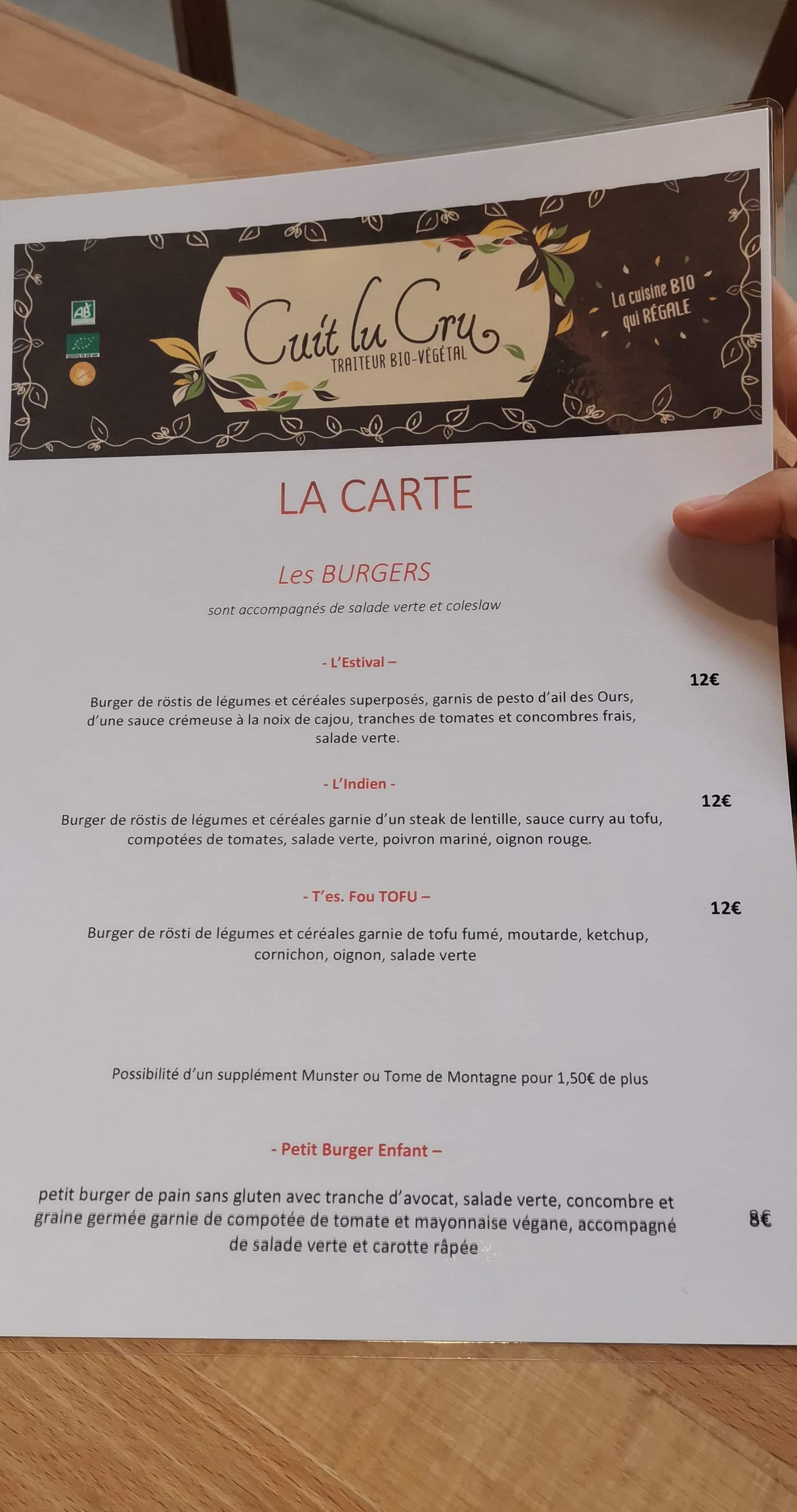 Nous recommandons chaleureusement Cuit lu cru, où nous avons désormais nos habitudes, aux végétaliens de tous poils mais aussi à celles et ceux qui souhaitent découvrir cet Art de vivre dans le cadre bucolique du marché couvert du centre de Colmar. Merveilleuse idée que ces burger végétaliens et sans gluten à l'ail des ours où d'originaux roestis de petits légumes se substituent aux sempiternelles parodies de pain que nous infligent leurs pâles confrères. Délicieux petits accras de légumes et jus pressés minute composés par une petite équipe serviable et attentive ayant à coeur de s'adapter à vos envies et aux particularités de votre régime. Aux amateurs de pâtisseries : sans sucre raffiné, la Joconde, en plus d'être à tomber, laissera sur vos lèvres un petit sourire mystérieux (au chocolat bien sûr ;o).
