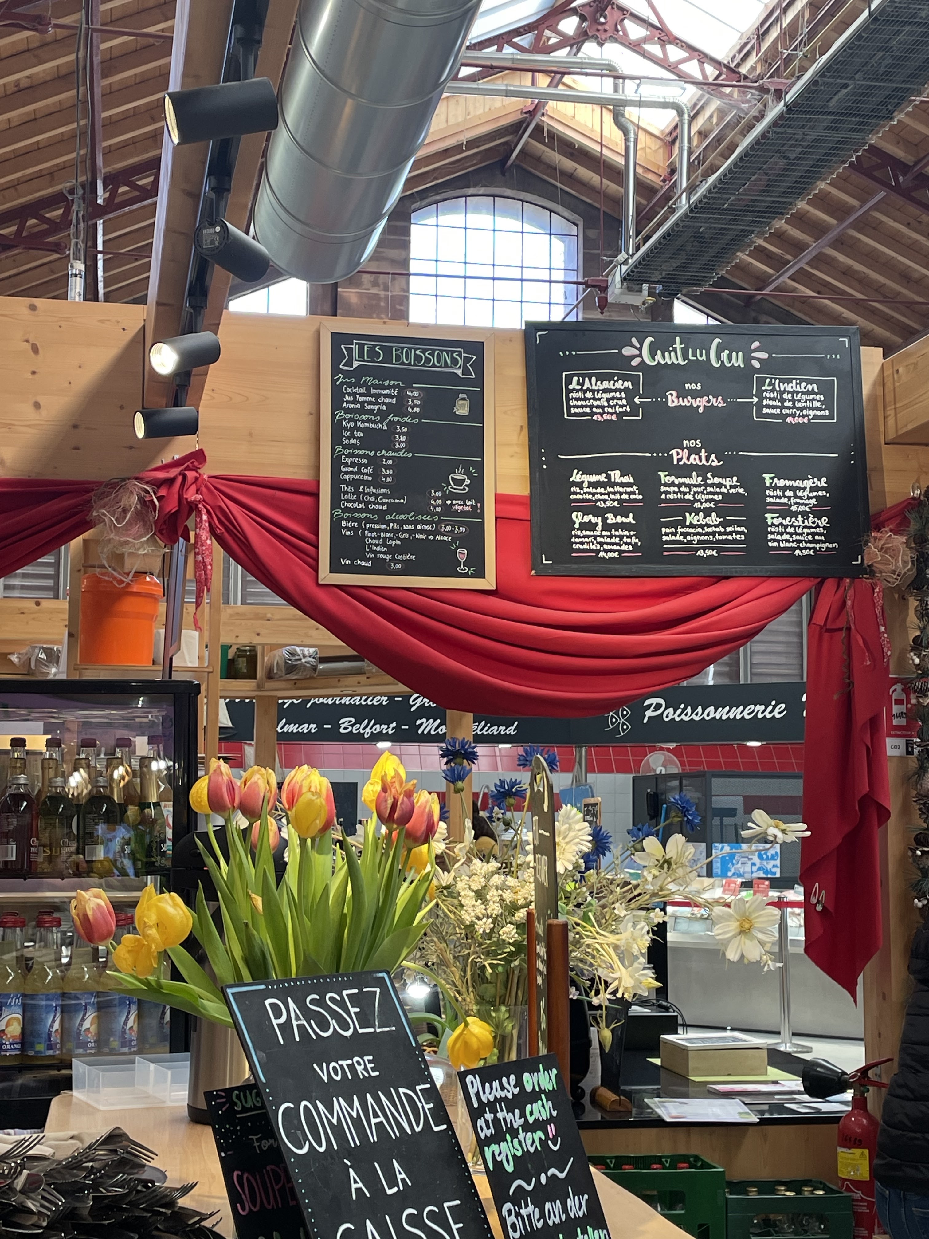 Excellent café végétalien avec des sièges à l'intérieur et à l'extérieur du marché. Tout est végétalien et la plupart de la nourriture est sans gluten, avec une signalisation super claire et des menus en français et en anglais (et je suppose, en allemand !) Nous avons eu le burger alsacien et le burger américain (non sans gluten), et les deux étaient excellents ! De plus, il y avait une belle bière artisanale et divers bons jus de fruits.