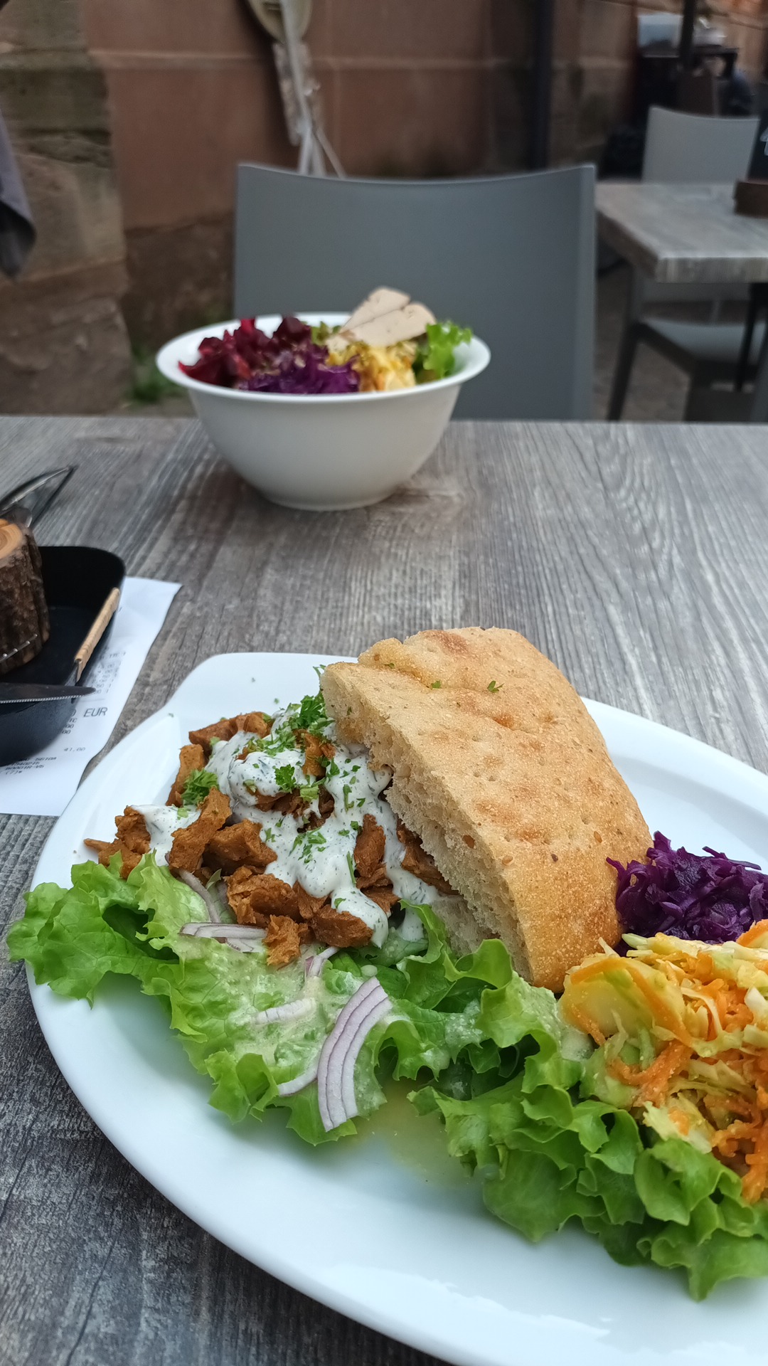 Bonne cuisine vegan à Colmar ! Nous avons aimé l'Alsace Burger (ils utilisent des galettes de légumes au lieu de petits pains, ce qui est une belle variante) et le kebab de seitan (portion énorme).