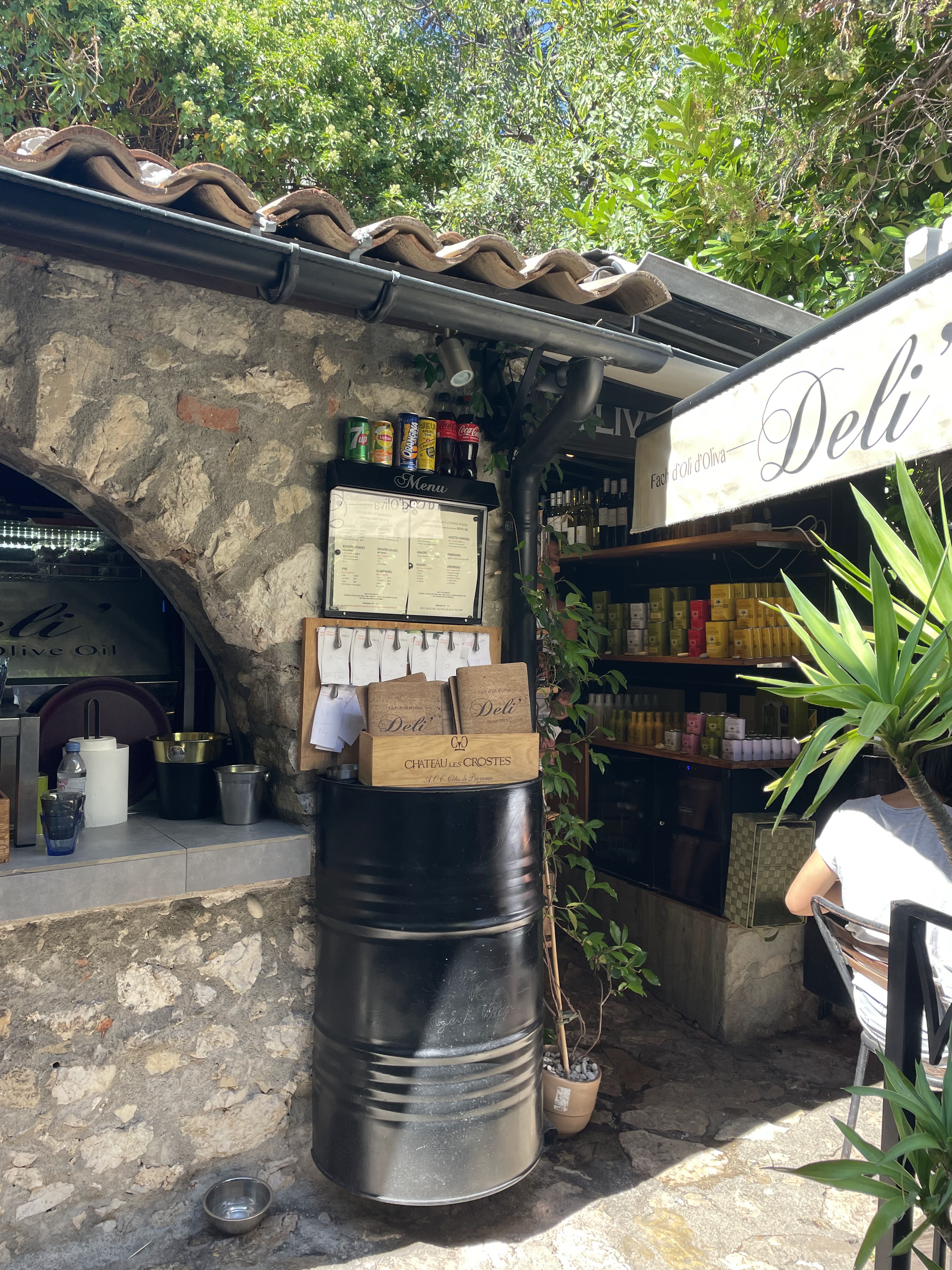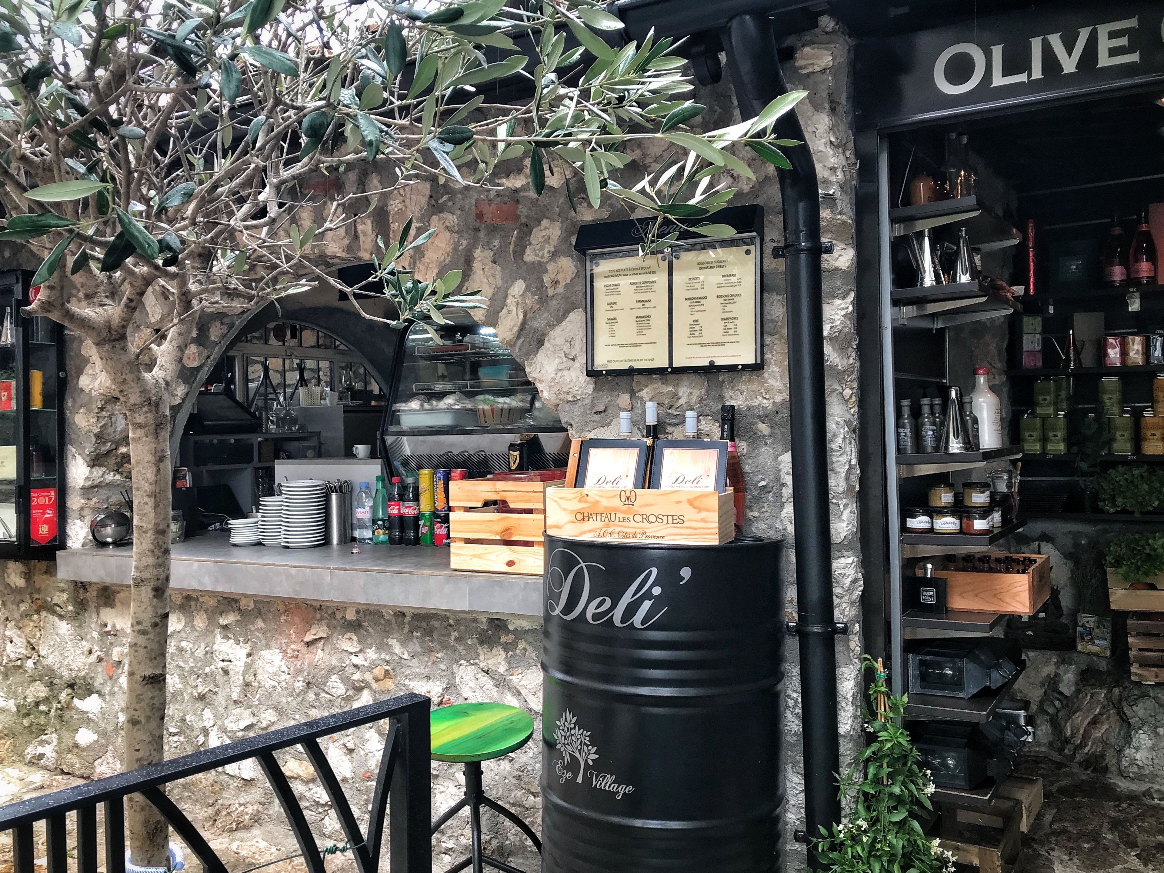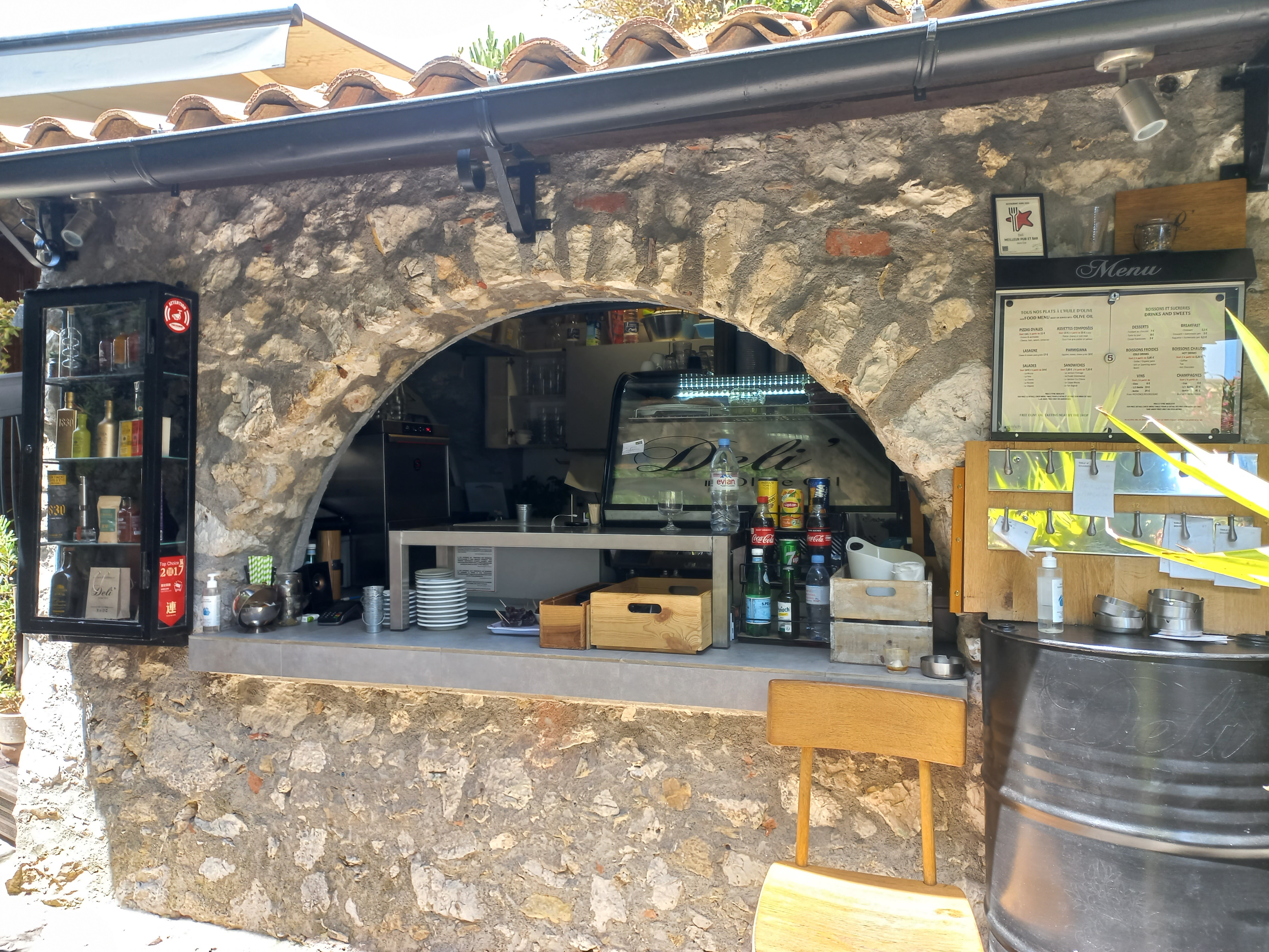 Quelques tables, salades fraîches et généreuses, assaisonnement élaborés avec produits de la marque A l''olivier. Pissaladière, pan bagnat,... Un peu cher, 16€ la salade niçoise, mais on est en plein centre d' Eze. Parfait pour pause déjeuner.