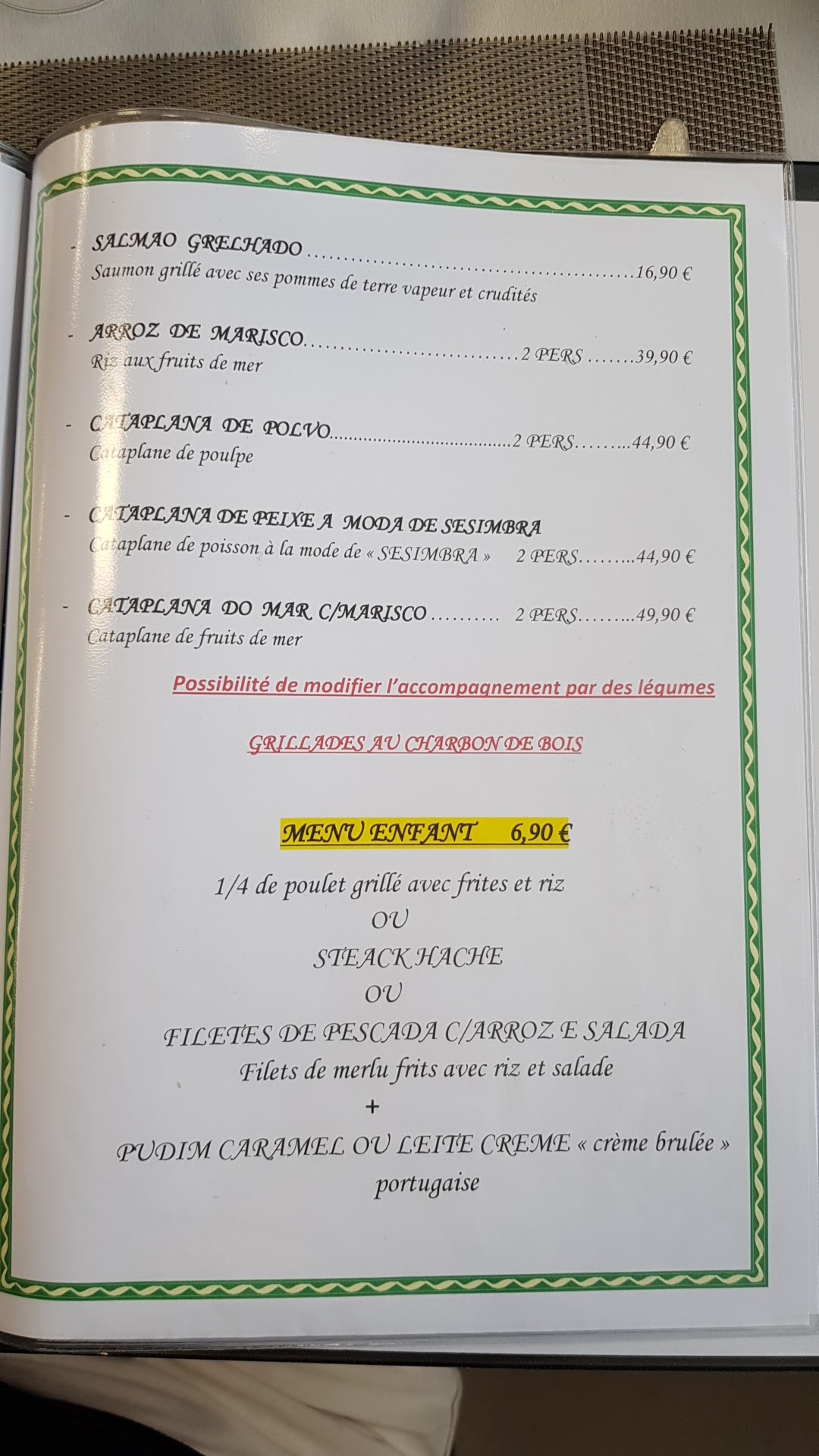 Accueil chaleureux comme au Portugal.Lieu très propre et un service efficace et sympathique avec une explication pour chaque question concernant les divers plats proposés.La morue est super bonne et les plats sont très copieux avec une addition correcte.Le patron est très sympa on a vraiment le sentiment d'être au Portugal.Vivement que l'on puisse retourner pour nos vacances dans ce merveilleux pays.