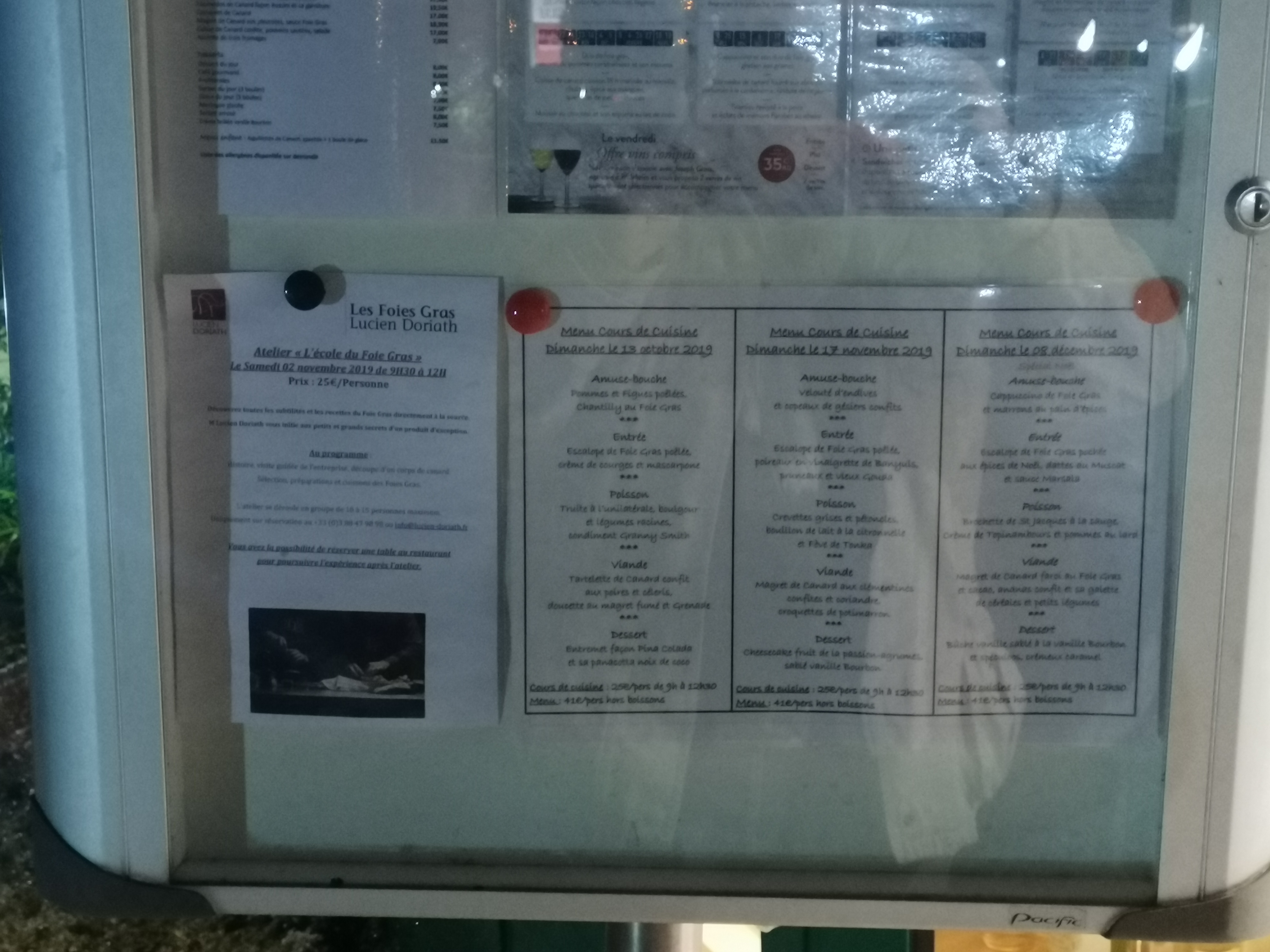 Bonjour, Nos horaires, qui différent pour la boutique et le restaurant, sont précisées sur Google. Le panneau indiquant le plat du jour et notre spécialité, le foie gras poêlé, n'est sorti que les jours d'ouverture du restaurant, soit du mercredi au dimanche. Vous trouvez effectivement devant la boutique, la carte du restaurant ainsi qu'une ardoise indiquant le Menu Gastronomique (et non le plat du jour) actuellement disponible.
