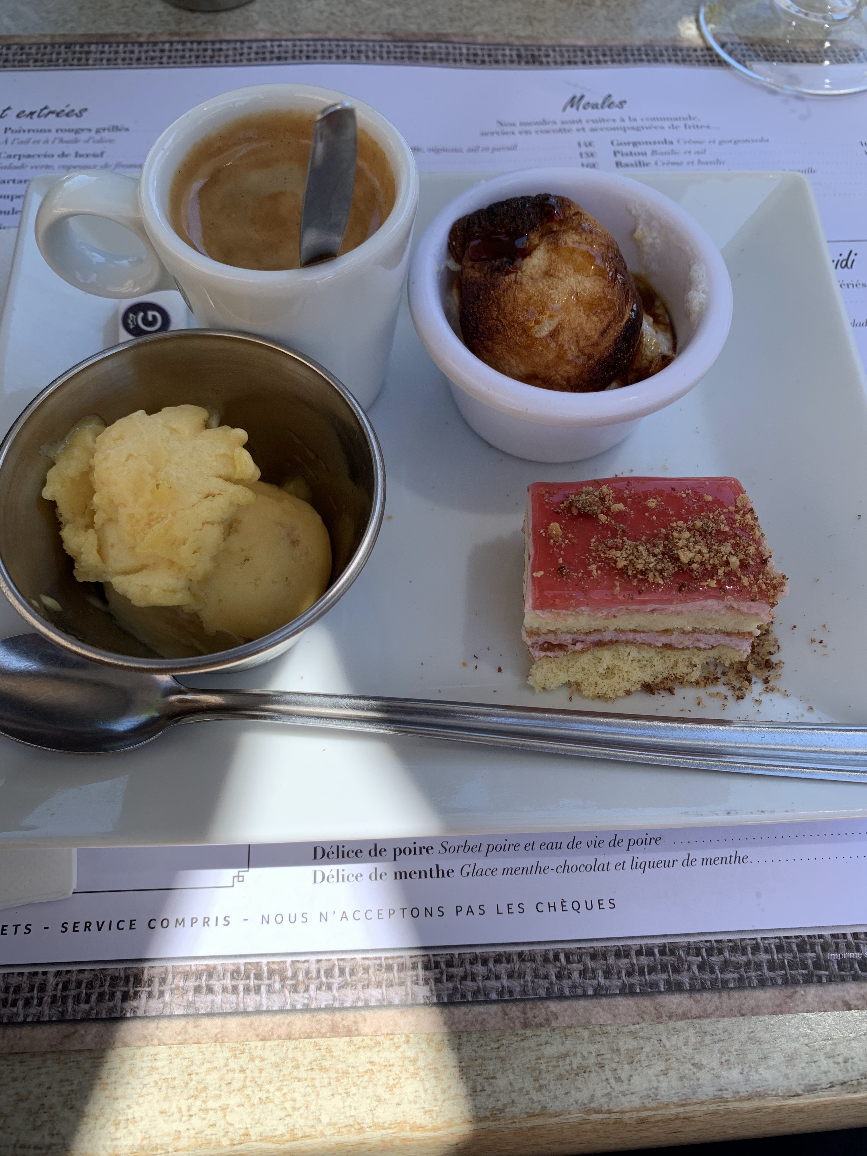 Midi = Plat et dessert, 17.50€, Comprenant : des moules frites, c'était excellent et largement suffisant. Un café gourmand : glace, crème anglaise avec œufs à la neige, meringue etc... . Et le tout est servi avec le sourire en prime. Il est évident que nous reviendrons.