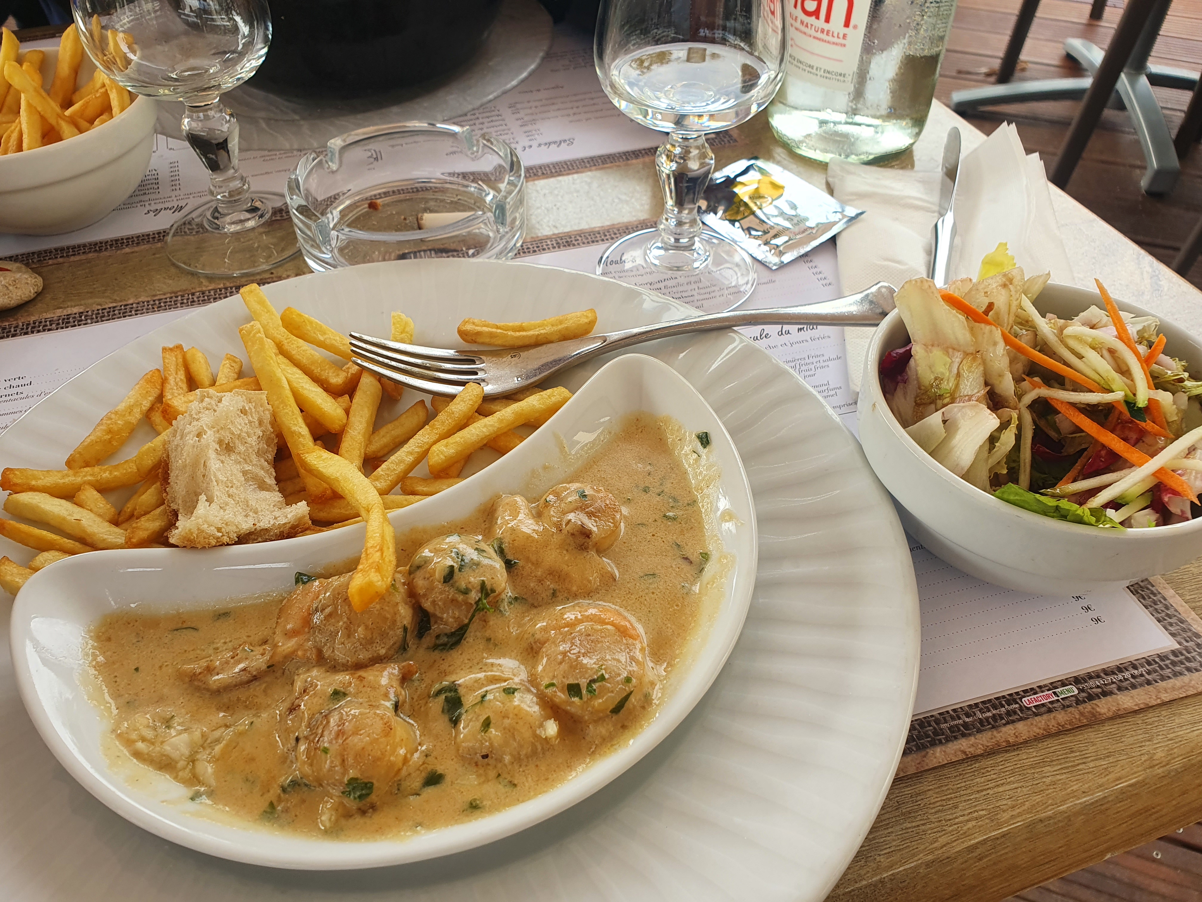 Arrivée à 12h, heure de notre réservation, au tout début du service. Nous voyons d'ailleurs le staff finir de manger. Ce n'est qu'à 13h35 que nous sommes servis ! Service beaucoup trop long (justifié par soit disant un manque de personnel). Rapport qualité prix assez médiocre, plat de saint Jacques à la crème pour 21 euros avec 2 pauvres légumes et à peine 50 grammes de riz en guise d'accompagnement. Serveurs d'une amabilité déconcertante. Frites surgelées, saint Jacques dures comme de la pierre, moules à moitié fraîches. Nous avons hésité à partir le ventre vide tellement nous avions faim, notre commande a été passée en priorité apparemment, mais cela n'a pas empêher que le reste des tables soient servies avant nous... Je me suis nourrie de pain. Décevant