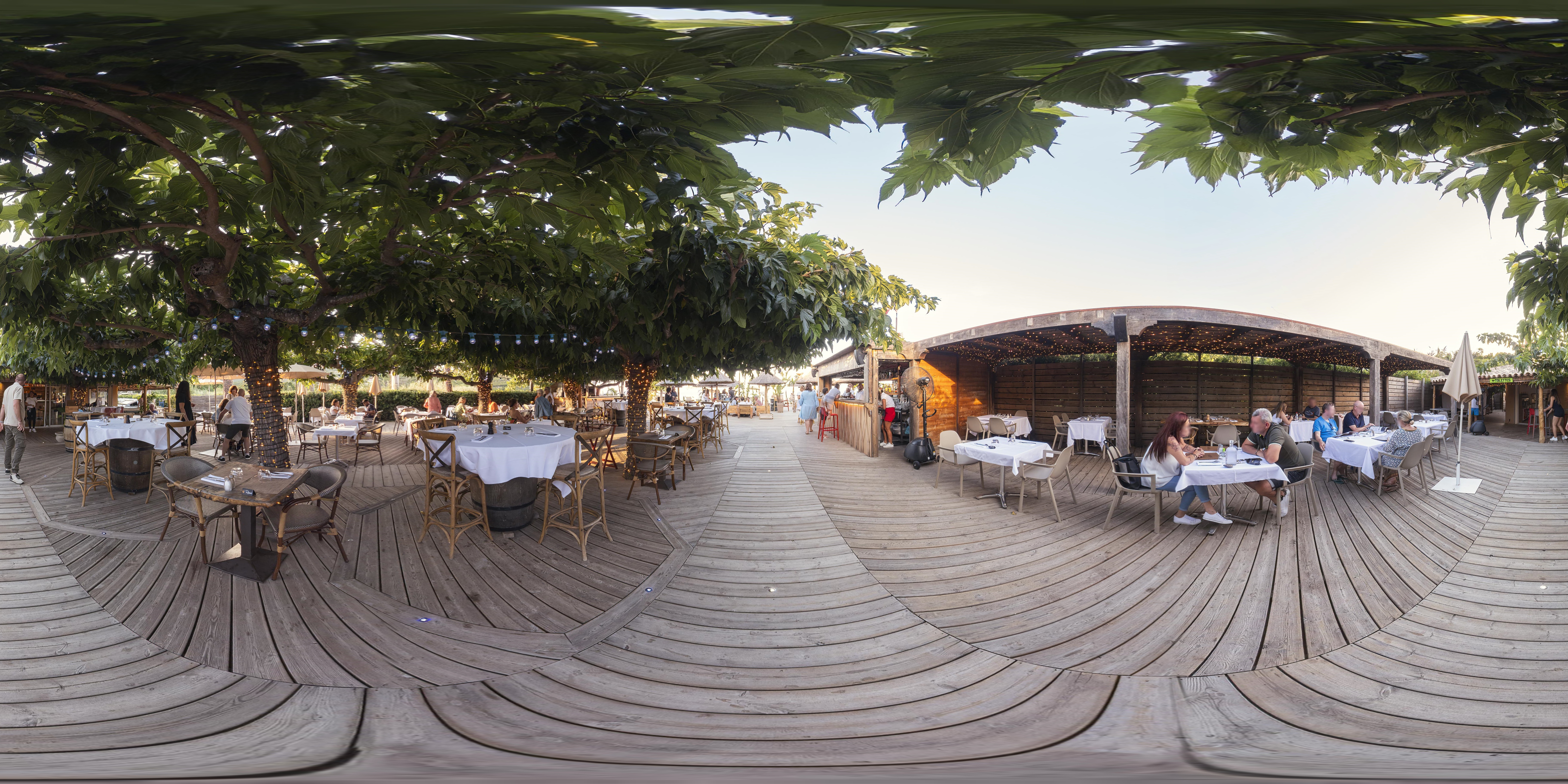 La paillote annee 70 au bord de la plage et face à la mer. Sorte de beach club. Aménagements réussis sur une vaste surface : plancher au sol decors de bois flotté tablées de restauration espace fauteuils larges et bas pour boire ou manger des tapas.guilandes lumineuses lovees sur des troncs d arbre. Mûriers taillés en parasols pour conserver l ombre. Ce lieu assure l ambiance de cette partie du cap dans un éclectisme assumé opportun. Mention spéciale pour le duo piano voix parfaitement rodé aux standards du jazz. La carte est un peu passe partout sans grand intérêt pour une réalisation de bonne facture et des prix étudiés. Service empressé et professionnel. Une gestion efficace d une position en premiere ligne et une vraie halte.