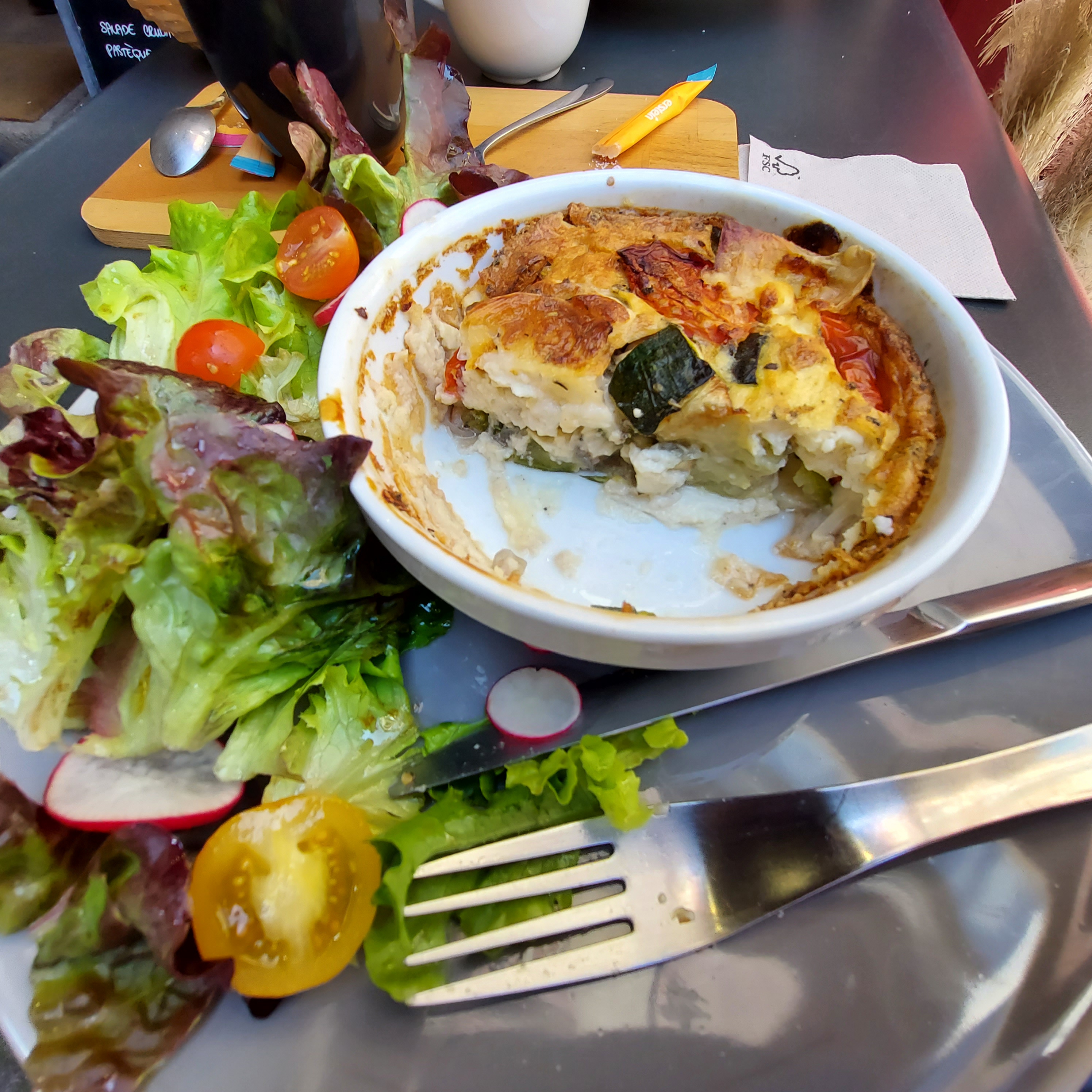 un repas gourmand avec un choix végétarien à chaque fois. De plus les produits sont frais et l carte change régulièrement j'adore.