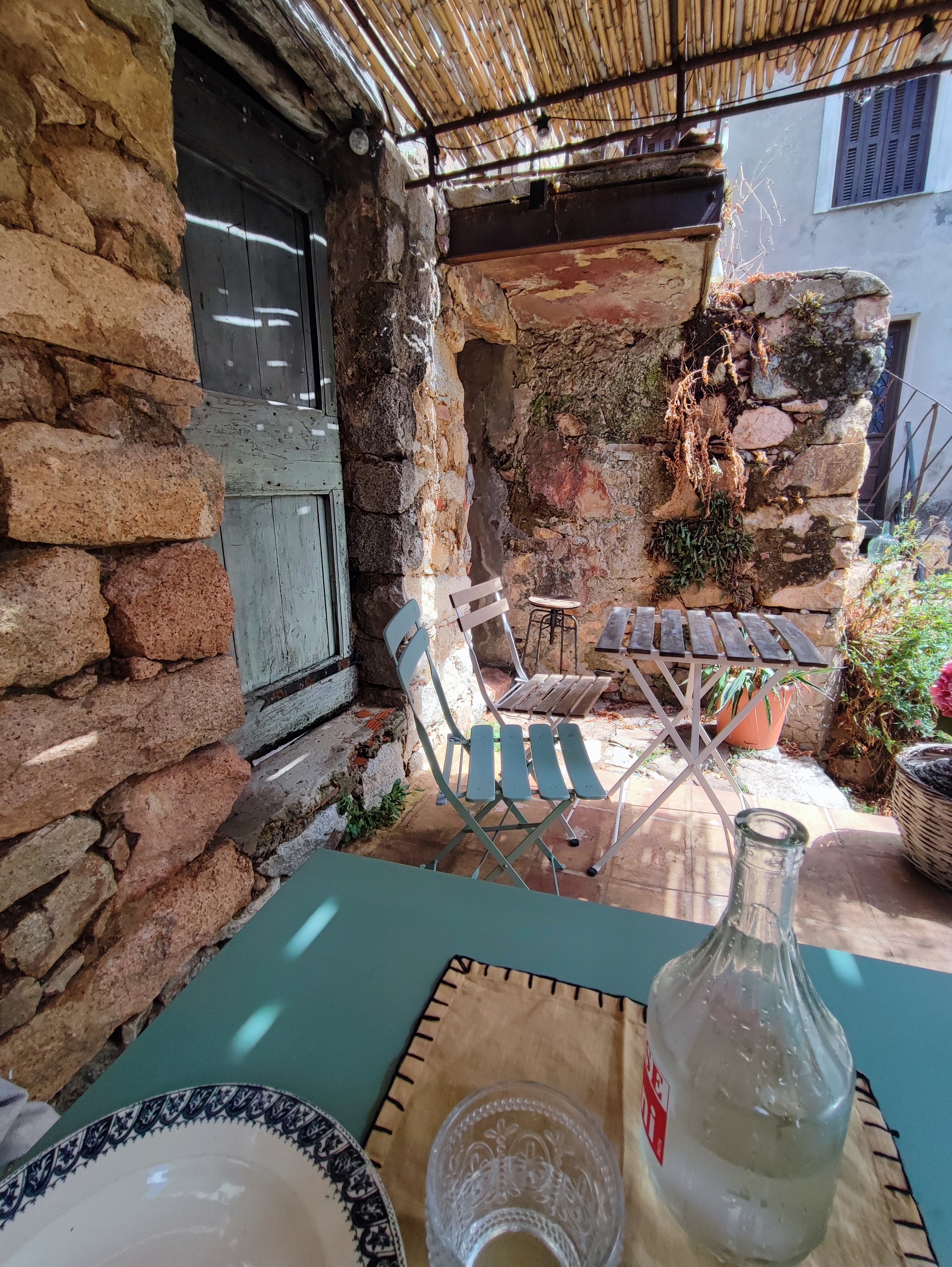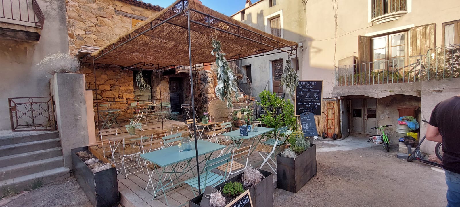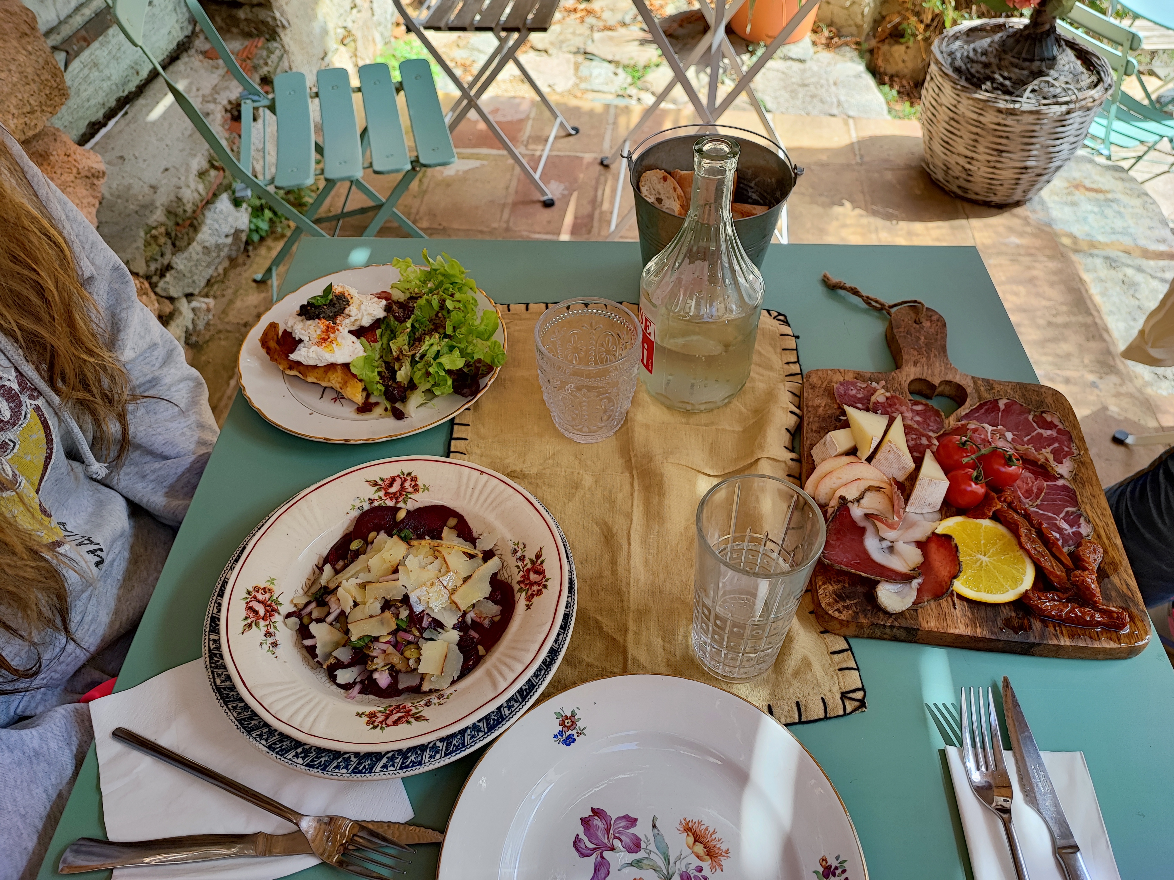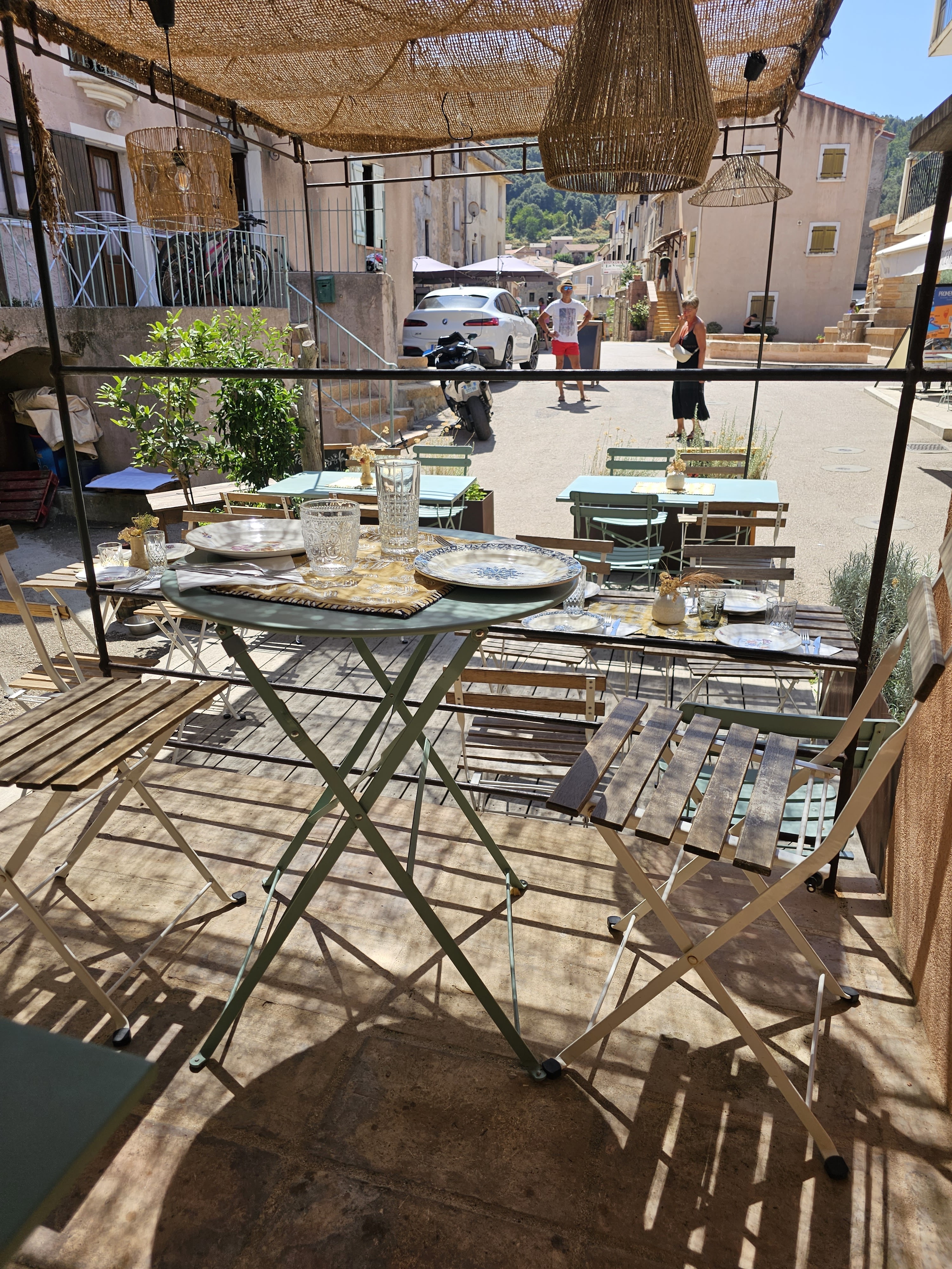 Découvert par hasard, en plein milieu du village, ce petit coin authentique nous reçoit sur une terrasse mignonnette avec vaisselle chinée. L'ardoise propose quelques plats, preuve du fait maison et avec les produits de l'épicerie. Nous avons choisi le pâté artisanal local, et à notre surprise nous avions le bocal entier dans l'assiette. D'ailleurs nous sommes répartis avec plusieurs de ces petits bocaux de pâtés délicieux. Nous avons également demandé 2 salades inventives et une tarte aux figues comme à la maison. Vraiment nous recommandons.