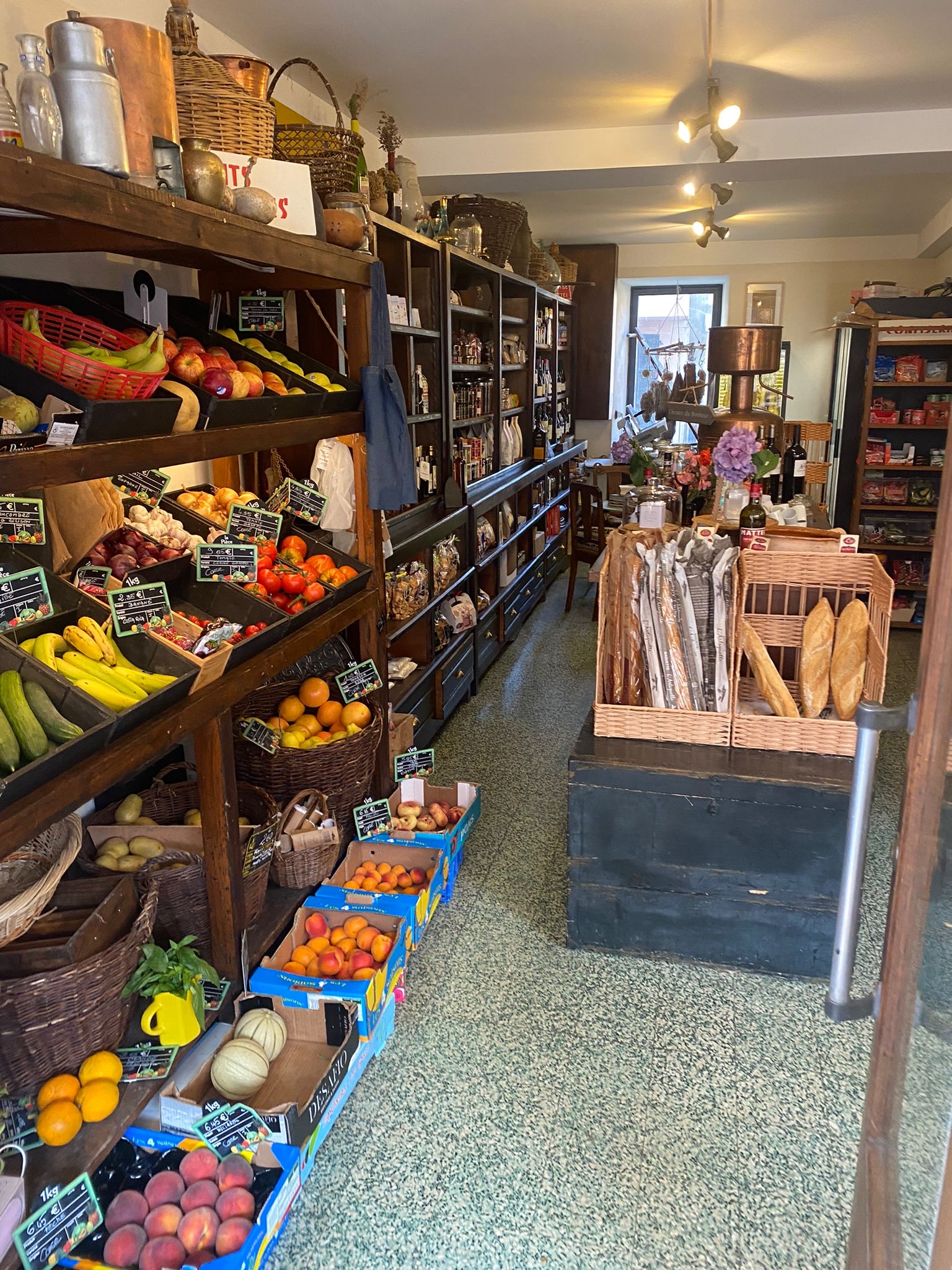 Jolie petite épicerie situé au cœur du village, qui a su garder son charme d’autrefois, avec les meubles de la maman comme souligné par le propriétaire. Très bon petit déjeuner en terrasse servie dans de la porcelaine ancienne. 10€ le petit déjeuner., Service chaleureux et attentionné.