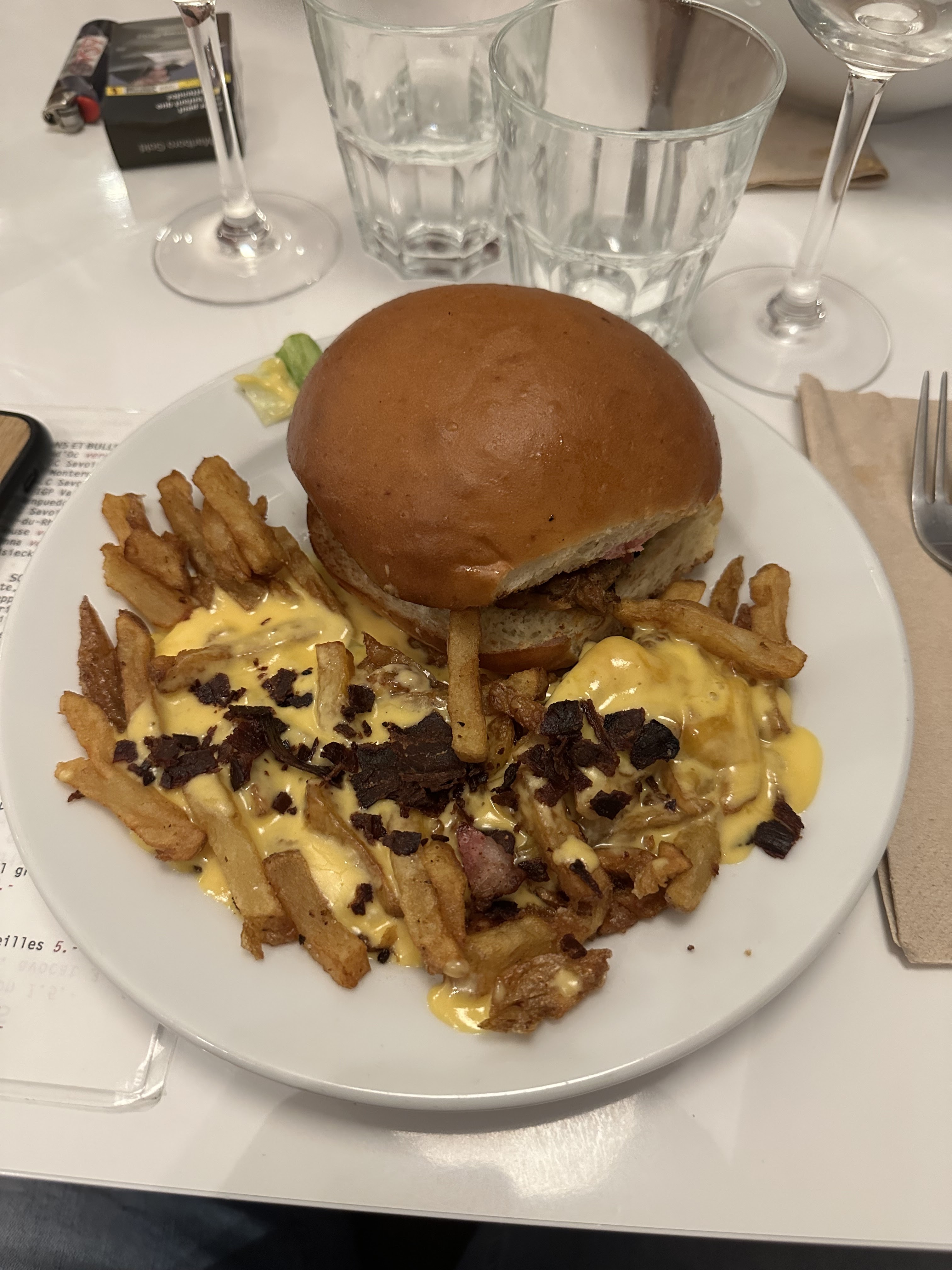 Une catastrophe industrielle pour la restauration ! On ne peut pas appeler ça un « restaurant » mais plutôt un fast food et encore McDo, Burger King ou autres proposent de meilleurs choses à manger ! On demande une table en extérieur, on nous dit que ça sera possible dès qu’une table se libère dans quelques minutes (il suffit de bouger un peu votre terrasse pour faire la table demandé mais bon …) mais manque de bol notre table demandé a été donné à d’autres clients arrivés 20 min après nous. Du coup, nous avons dû subir notre repas dans ce sauna intenable … et réclamer environ 4 fois nôtres fameuse table en terrasse ! 15, 50 € pour un burger insipide, à peine chaud… burger demandé sans salade, servi avec … enfin non une erreur entre deux assiettes (du coup on permute seulement les burger sur le pass de la cuisine sans lavage de main, changement d’assiette etc) et le supplément frite à 6, 50 € n’en parlons pas : pour une demie pomme de terre fris avec du cheddar parsemé de bacon (voir photo). Logiquement, quelques choses en supplément est servi à côté et en quantité sinon ce n’est pas en suprêmement, c’est l’accompagnement du plat. On ne peut pas appeler ça un « restaurant ». C’est mettre à mal les vrais professionnelles de la restauration ! Et le pompon, on nous propose si on veut un dessert (bravo ça fait parti du job) mais c’est suivi de « il nous reste plus rien, désolé » pourquoi proposer alors ? A aucun moment les serveurs s’intéressent aux clients, on ne demande pas si tous se passe bien, s’il nous manque rien etc … Il va falloir apprendre les bases du métier !