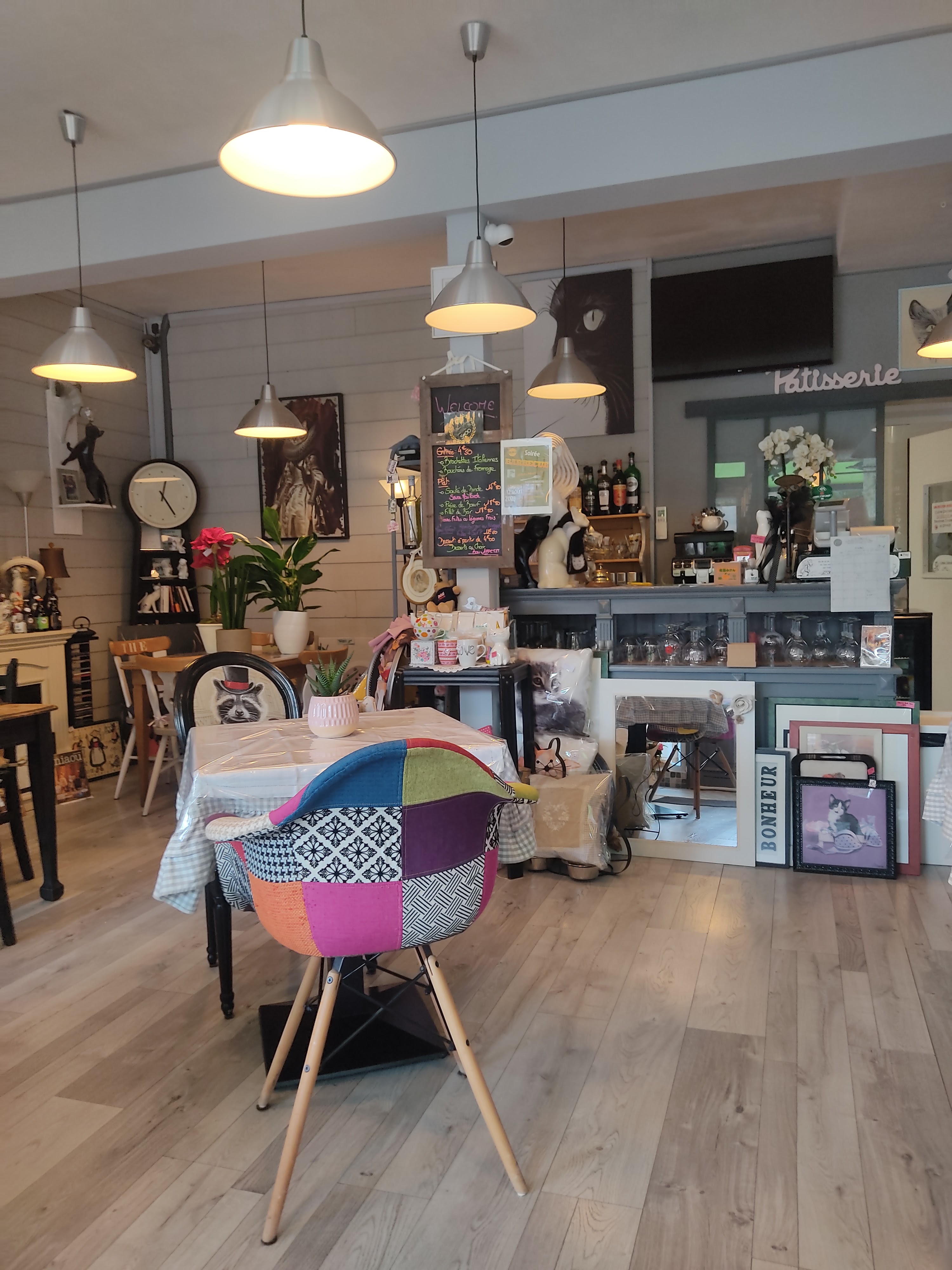 Très bon moment passé. Bonne cuisine, personnel très sympathique et lieu très cosy! Très belle décoration et 1 esprit boutique /brocante que j'ai adoré et dont les recettes sont reversées à 1 association qui vient en aide aux chats...Très bel esprit, bravo, nous reviendrons!