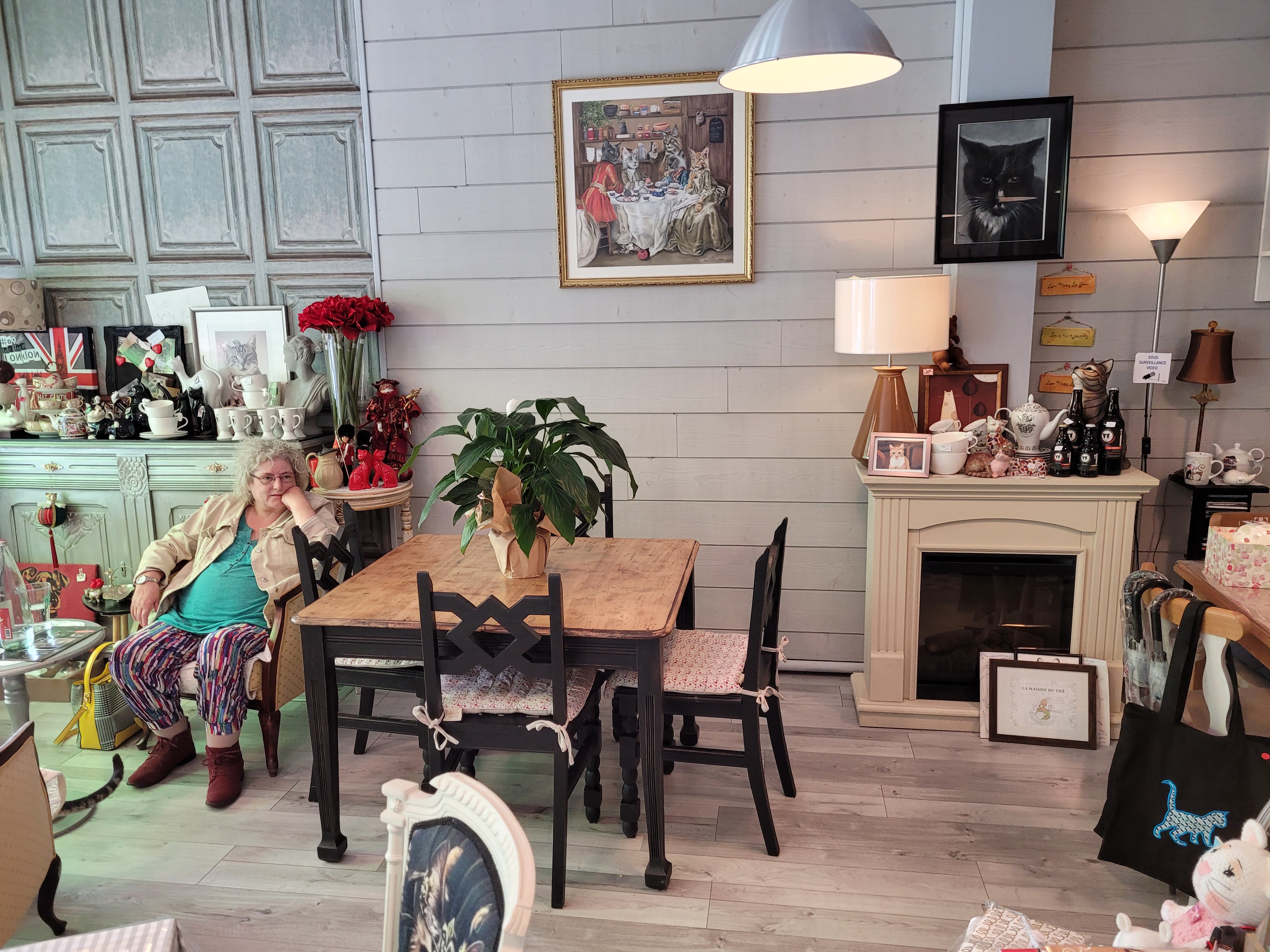Un endroit qui ressemble à un salon de poupée avec une superbe decoration et tout un choix d'articles pour participer à sauver des chats de la rue (Asdociation Chats Lhrureux), une carte de boissond chaudes et froides, de desserts ou collations et de repas pour tous les goûts. Un accueil chalheureux des humains et des félins. On aime s'y rendre entre mère et (grande) fille ; aujourd'hui on y a emmené une petite nièce pour qu'elle découvre la magie du lieu.