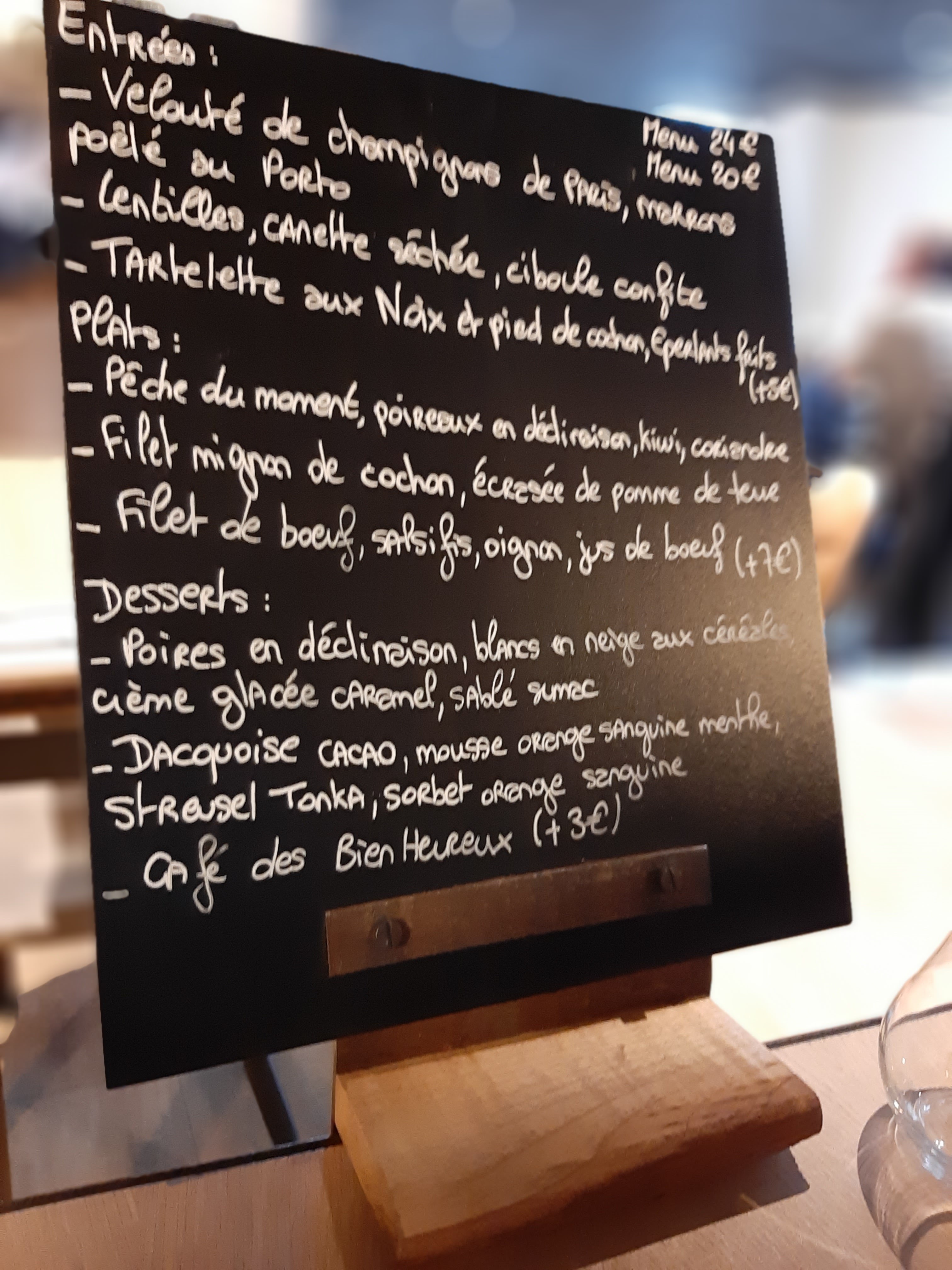 Bonjour, Merci pour vos compliments sur notre cuisine Pour les suppléments, à chaque étape, vous avez deux options dans le cadre du tarif à 29 euros et une option avec supplément. Elle est bien mentionnée sur la carte. Elle se justifie par la technique (chou maison), l'animation (découpe en salle du Saint honoré devant le client) et le produit (fruits rouges). A notre sens, le supplément est justifié et il est bien mentionné donc le client le prend en connaissance de cause. Il reste toujours deux options sans supplément si vous désirez rester sur la formule à 29€, eaux incluses. Pour la bouteille, c'est un cidre de Eric Bordelet, le vigneron le plus côté sur le cidre et le poiré. L'équipe de salle a bien spécifié le prix de la bouteille. Nous effectuons une marge classique sur cette bouteille, sans exagération car simplement, le coût d'achat est plus élevé qu'un cidre classique. Il peut donc arriver que le cidre soit effectivement plus cher que le vin rouge à la bouteille, selon la référence de comparaison. Nous nous tenons à votre disposition si vous avez des questions Au plaisir de vous accueillir au restaurant des bienheureux à nouveau
