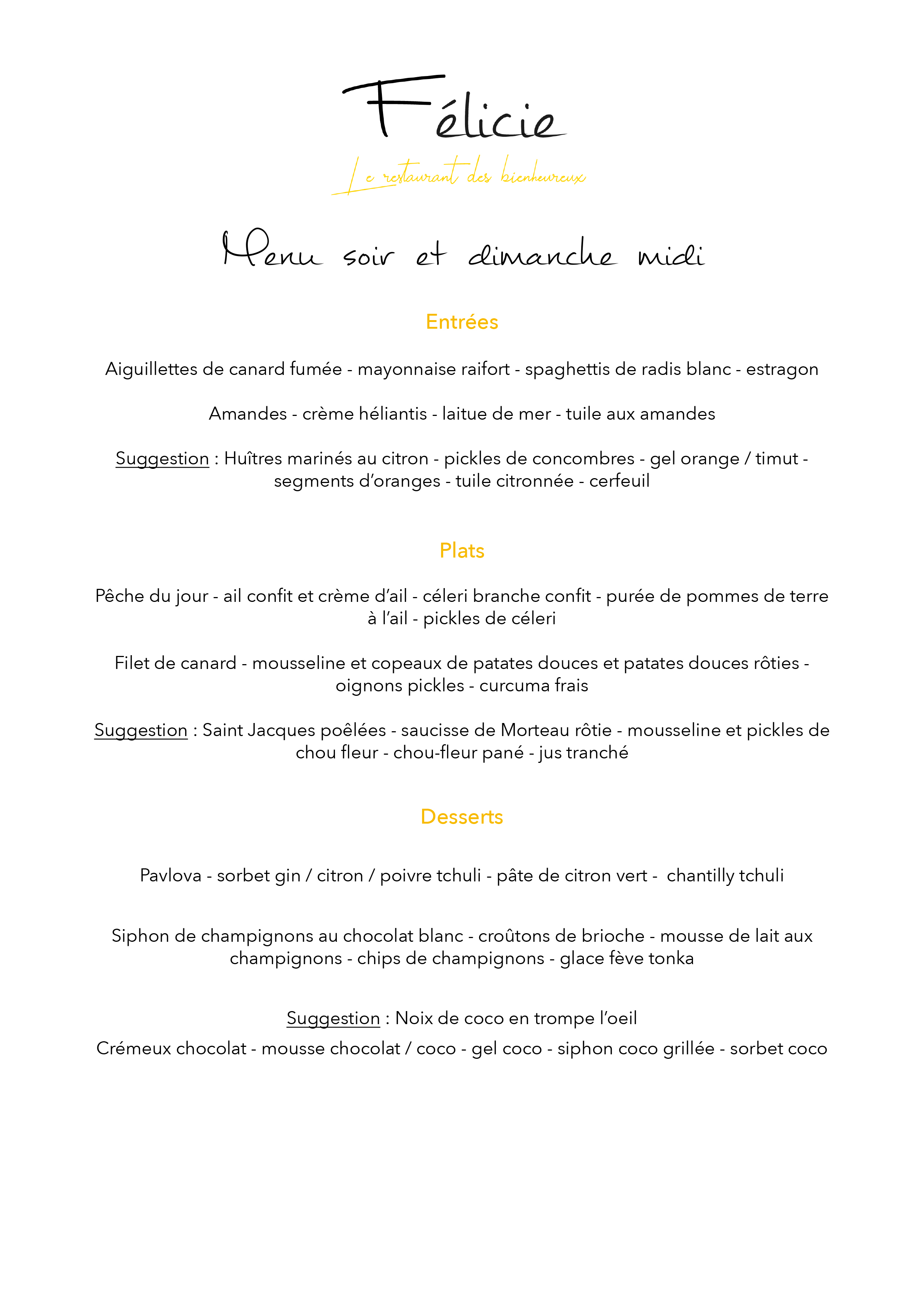 Au top comme d’habitude. Bravo pour cette belle proposition de plats. Le poisson était excellent. On reviendra très rapidement. Bonne continuation et vive le félicie.