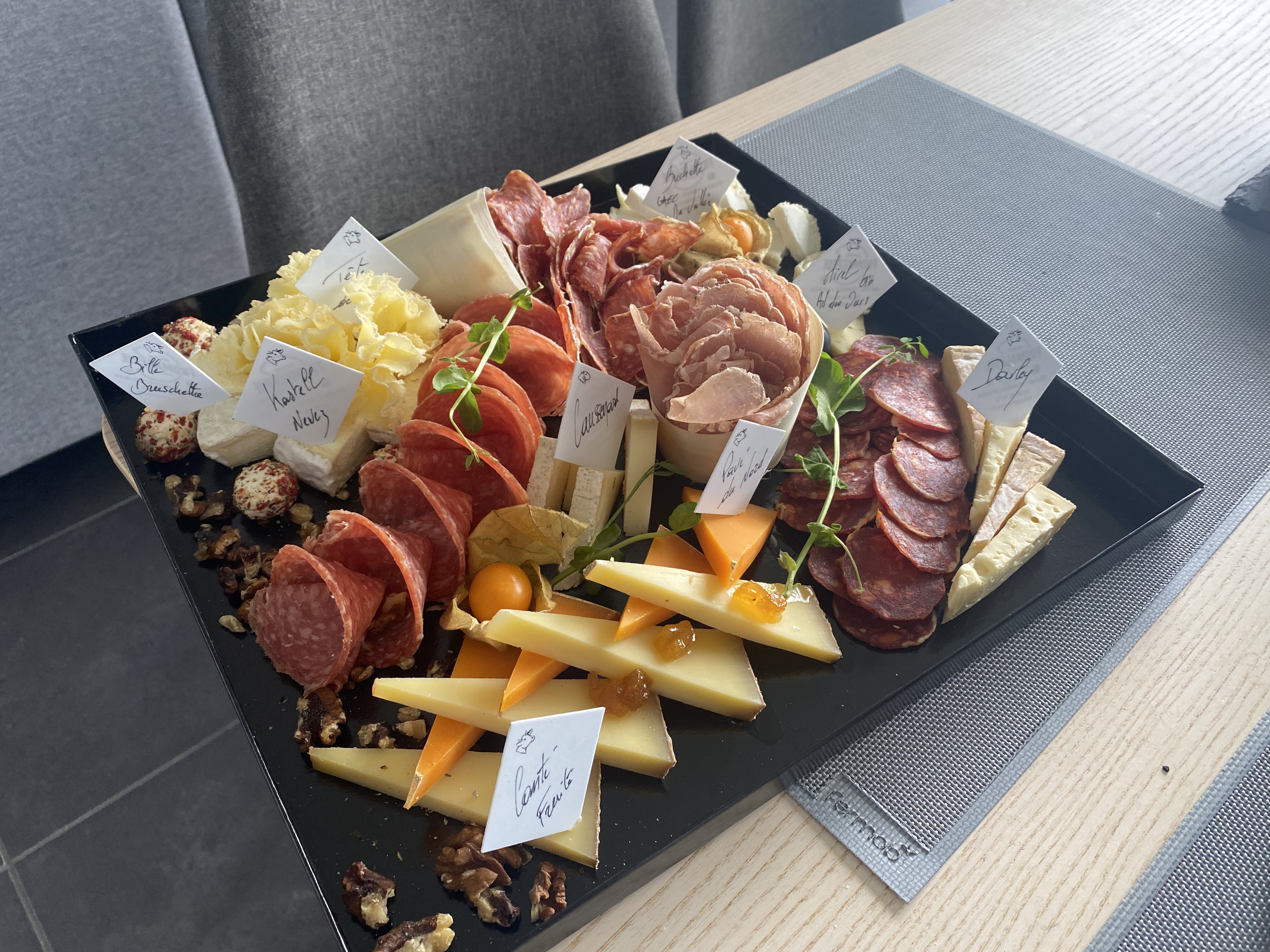 Plateaux de fromages et charcuterie excellents. Même les enfants ont adorés. Peut être juste mettre des petites étiquettes dans le plateau de fromage pour savoir quel fromage nous mangeons pour en racheter plus tard