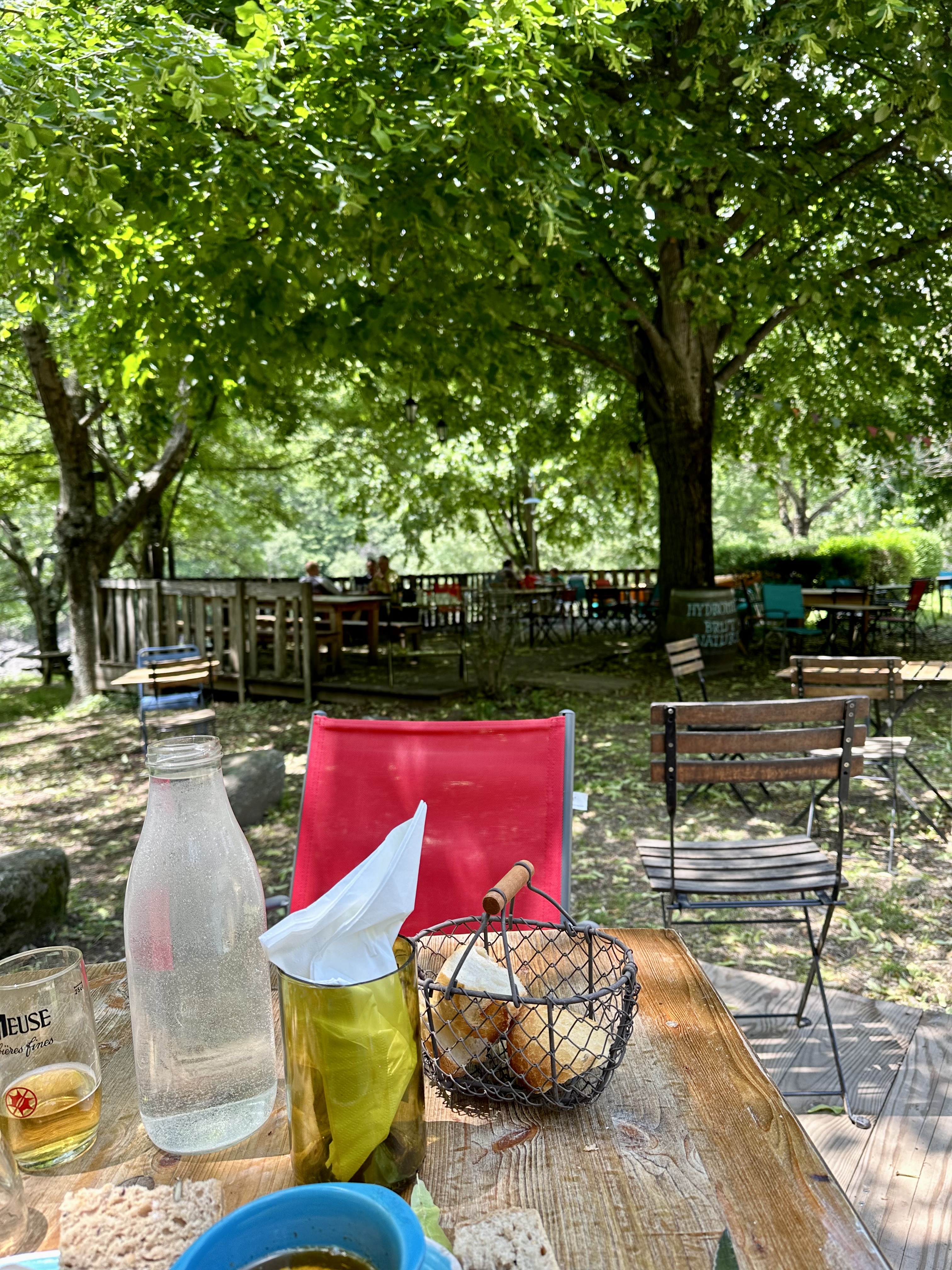 Très chouette petite table sans prétention, service efficace et produits au top, excellent rapport qualité prix, saucisse aux herbes à tomber, proximité directe de l’eau pour plouf salvateur et sieste dans l’herbe ombragée, comme le parking :-) (Seul hic s’il en faut un, pas de CB)