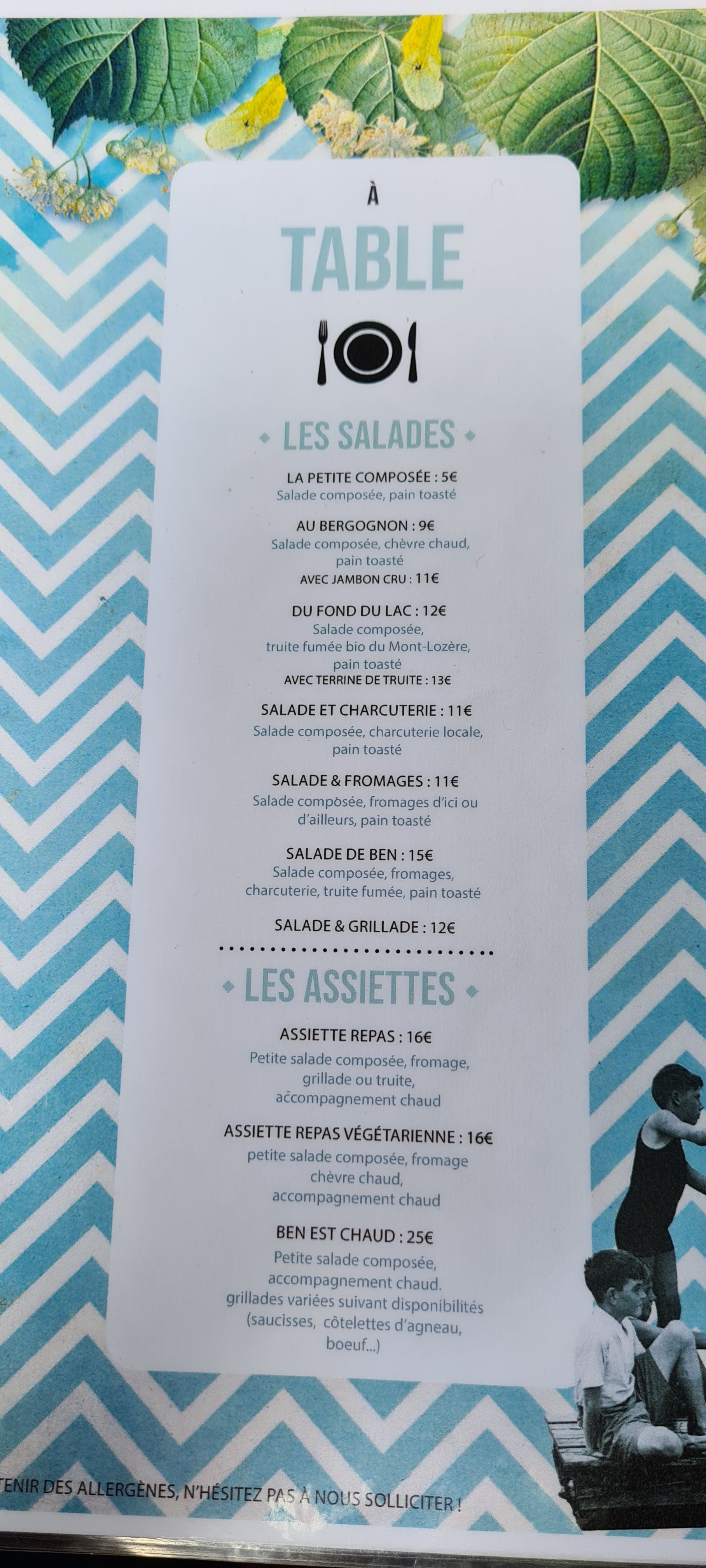 La guinguette du bout du lac est un lieu paradisiaque. Une superbe terrasse au bord d'un lac ombragé grâce à un majestueux tilleul. Les produits sont frais et locaux. Toute la carte est absolument exceptionnelle. Les entrées sont sublimes (cevice, tomate-mozza revisitée, chèvre chaud), les plats sont accompagnés de légumes de saison frais et gouteux et les viandes proviennent de la boucherie de Villefort (la saucisse aux marrons est incroyable). Et les desserts sont tous fait maison, ils sont divins et originaux (je recommande tout particulièrement la crème brûlée à la bergamote et le gateau choco-halva). Les cuisinier.e.s sont de véritables ARTISTES culinaires (en plus d'être très gentil.le.s). L'ensemble de l'équipe est fort sympathique, drôle et dynamique. Le lieu dispose d'une cave à vin nature d'exception et la bière pression est artisanale et très bonne. De plus, iels louent des canoés, font des concerts les vendredi soir et mettent à disposition (en lecture sur place) des BD de qualité (et il y a un échiquier géant), que demander de plus !!?. Les prix sont plus que respectables compte tenu de leurs qualités d'exception. Pensez à réserver absolument et à vous munir de liquide ou d'un chéquier, pas assez de réseau pour la carte bleue. Bonne chance et bon courage à l'équipe pour la fin de la saison, vous êtes super !