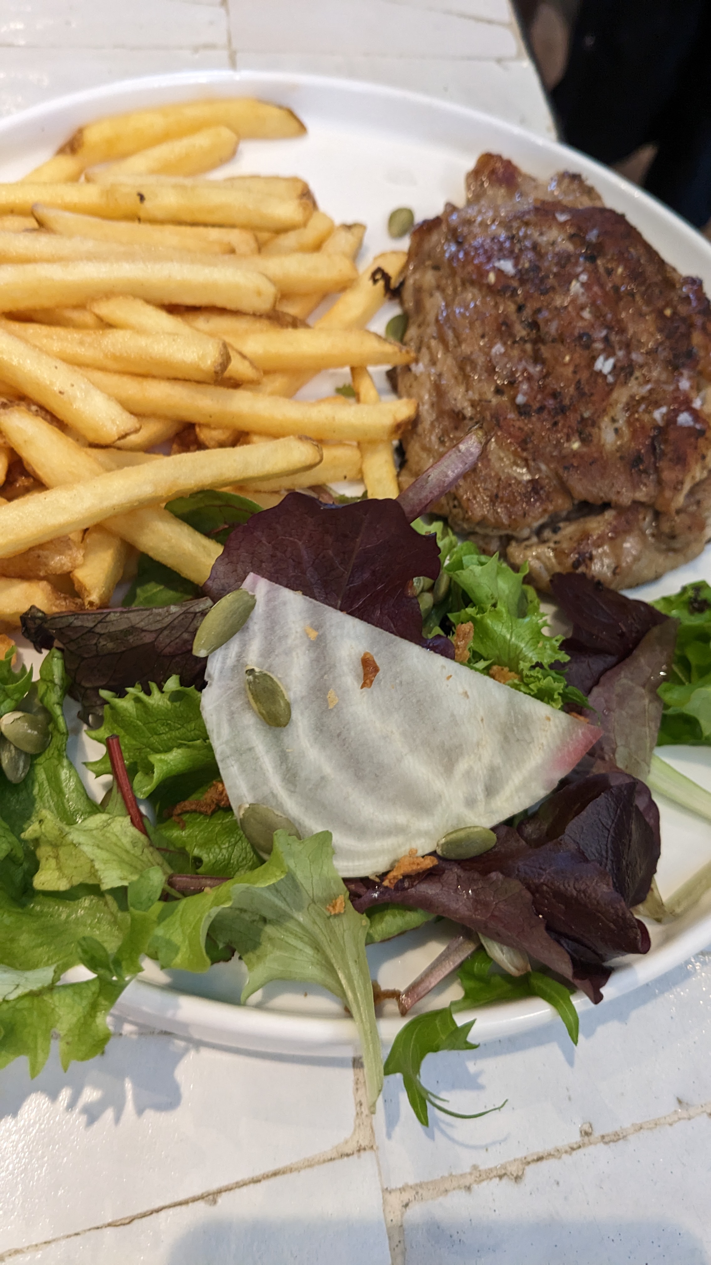 Cauchemar en cuisine Un cadre très agréable à côté de la fontaine Je suis venu avec un ami Il devait être 20h30 Déjà on nous prévient, il n’y a plus de hamburger Et on nous dit on a eu beaucoup de monde aujourd’hui On reste quand même, et on commande de salade César et une petite portion de frites Plus d’une demi-heure d’attente pour deux salades, au moment où on s’apprêtais à partir, la serveuse arrive avec les deux salades Je peux vous assurer que pour le prix il y a rien d’extraordinaire Et en plus les frites étaient des frites congelées même pas des frites fraîches, cinq euros la portion J’ai eu l’impression que le personnel était en panique Quand on nous a servi même pas, on vous met du pain sur la table, il faut le réclamer une fois qu’on a été servi Bref!!!! Pour un début de saison, c’est raté Si vous êtes pas pressé, vous pouvez y aller Si vous êtes gastronome, faites demi-tour