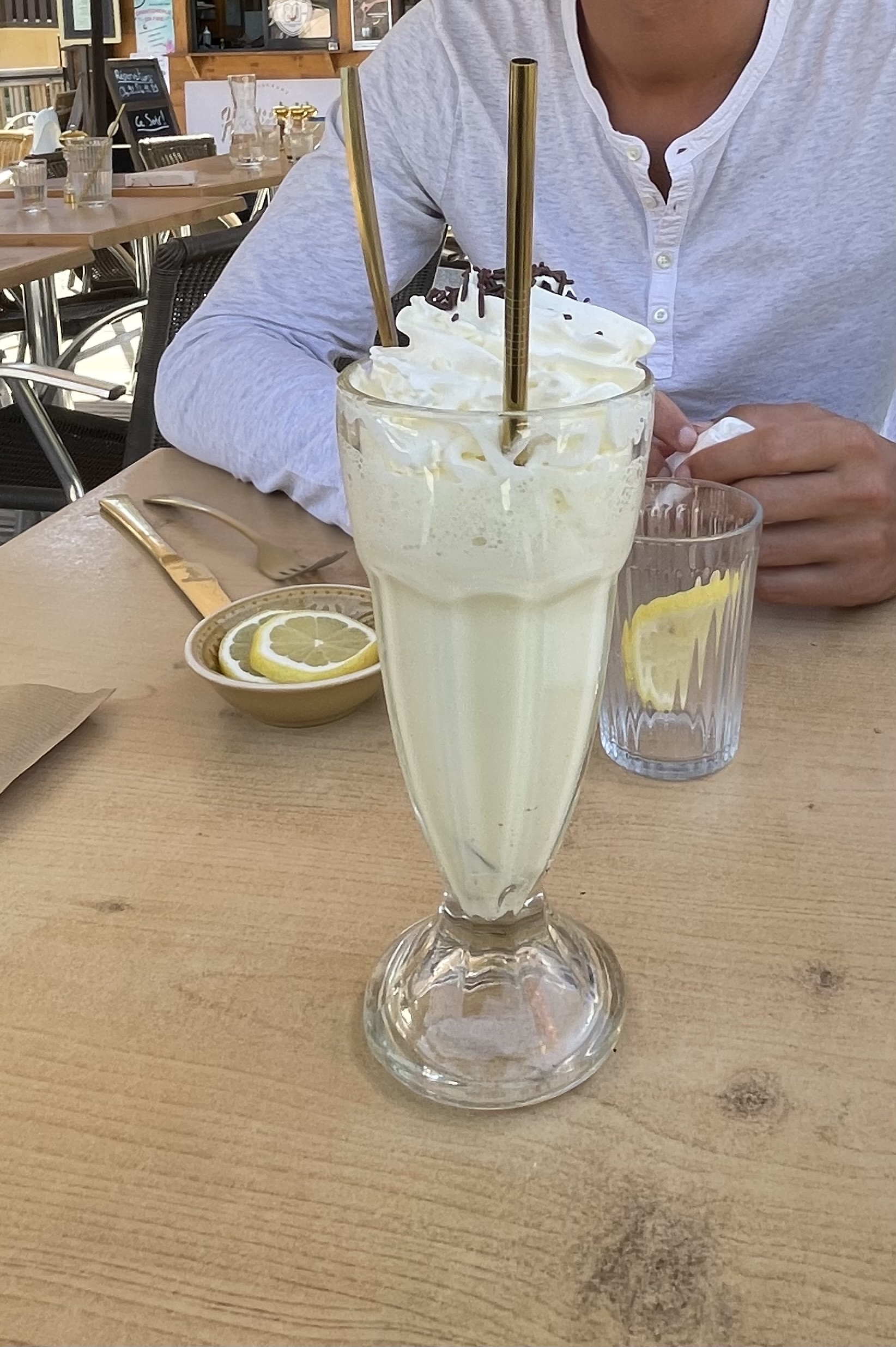 Un endroit où nous avons mangé des crêpes car pas de glaces possibles sauf des bâtonnets et la cerise sur le gâteau c’est la carafe d’eau chaude. Lorsque ma fille a demandé des glaçons on nous a répondu que c’était à cause de la chaleur Et les frigos??? Nous ne risquons plus d’y mettre un pied