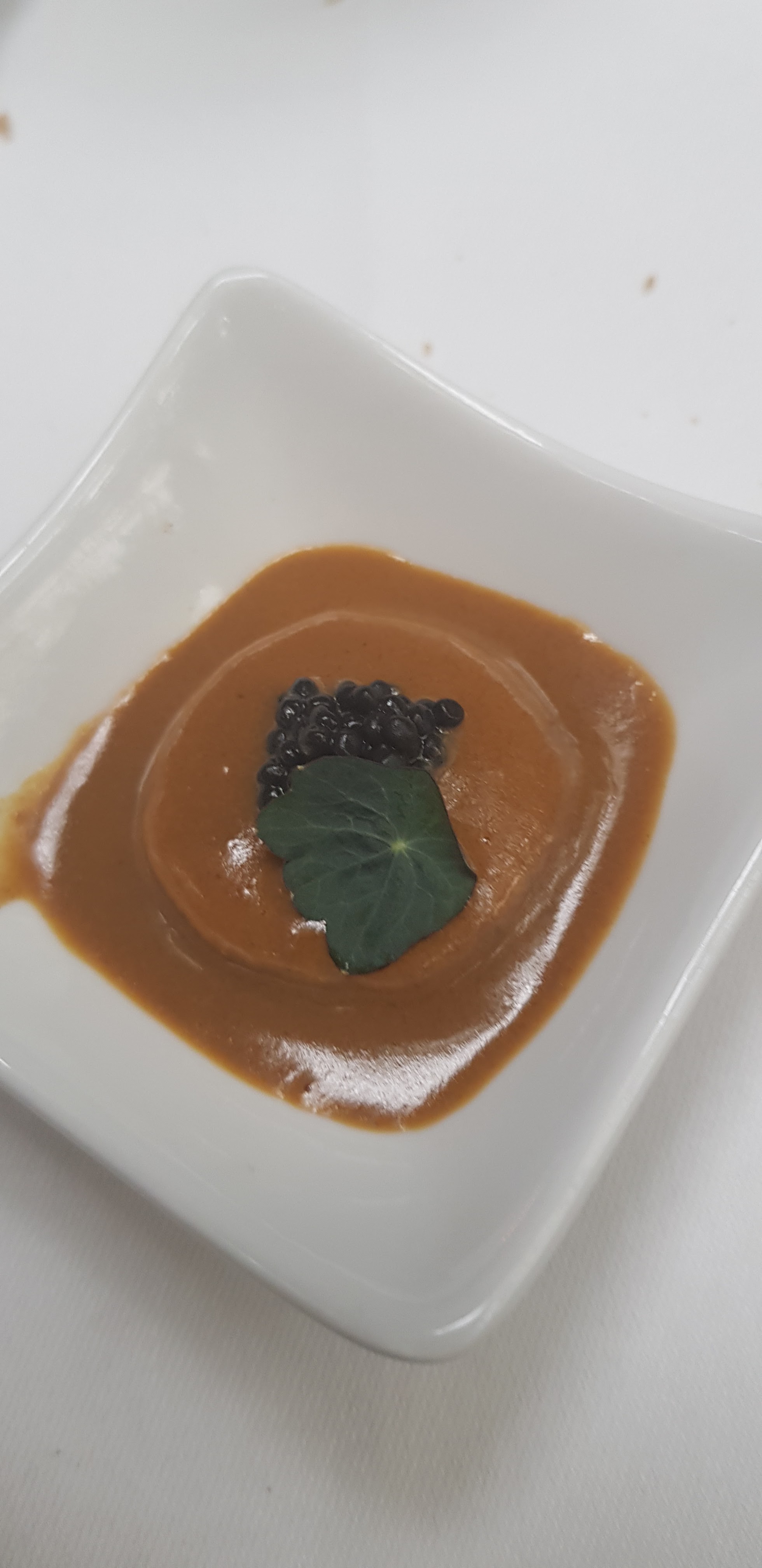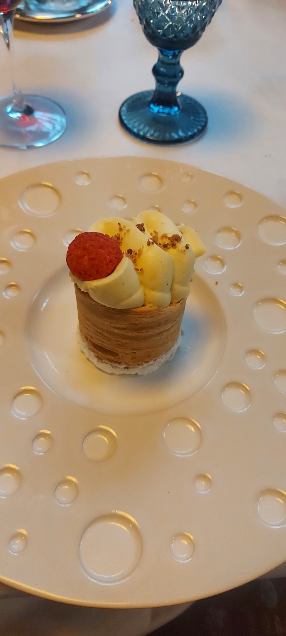 Menu découverte à 58€. Consommé tiède dans une tasse, purée de carottes, carotte rôtie cromeski de tapioca ( sans intérêt), lotte crue et trop salée, 2 desserts au choix nous n'avons pas aimé les associations : sangria pana cotta ou boule de mûres au chocolat blanc biscuit à la rose. Beau visuel mais pas bon pour nous...service très très long... Lumière inexistante, nous sommes très déçus, nous préférerions avant 😥