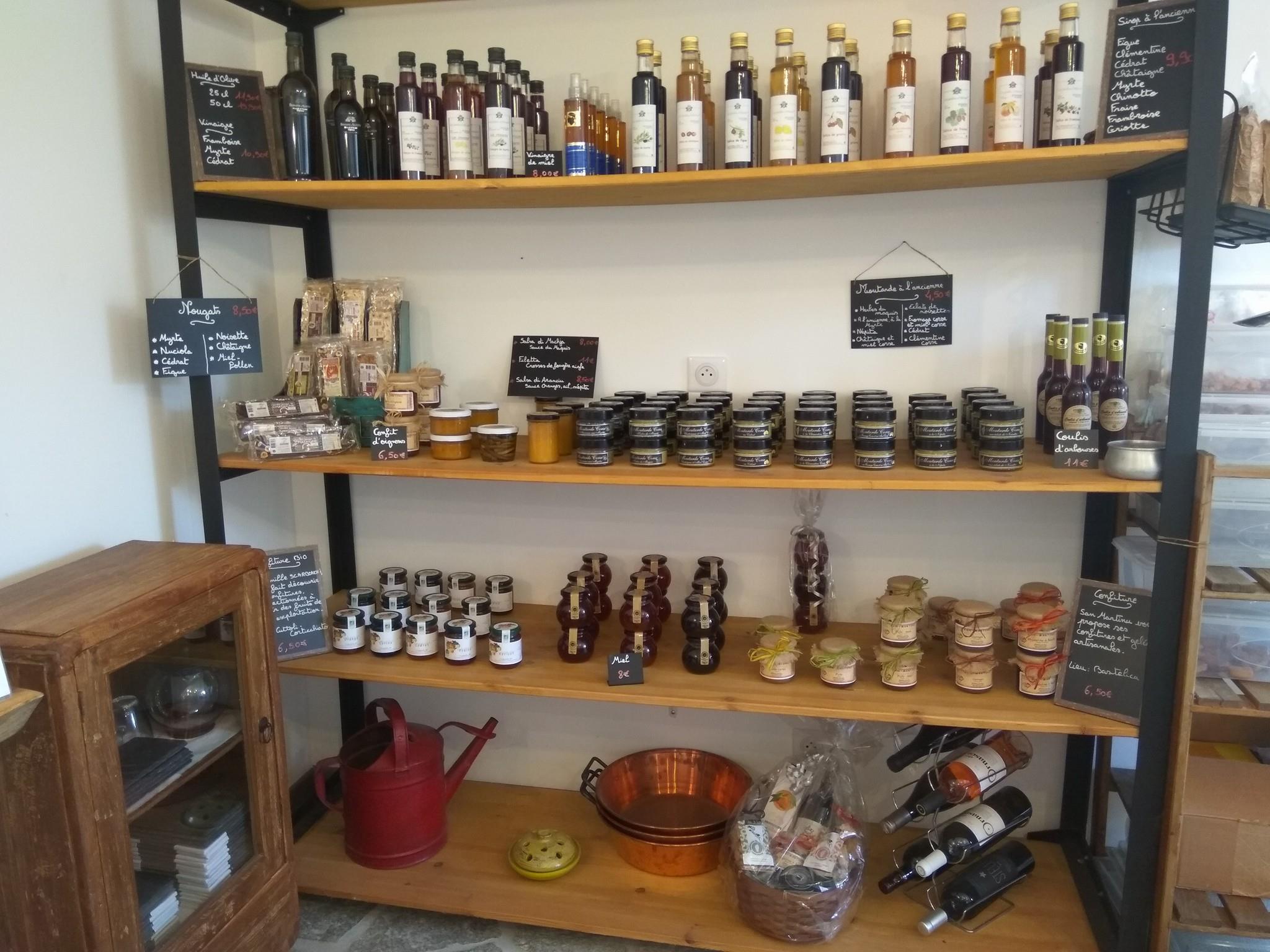 Au sein d’une belle propriété, une épicerie fine tenue par un jeune couple, qui vous propose des produits de producteurs corses (cette épicerie dispose d’un site internet) : nous avons passé commande et nous nous sommes faits envoyer les produits à domicile par Chronopost. Nous avons apprécié les moutardes parfumées à la clémentines ou celle au miel et à la châtaigne dont les graines sont cultivées en Corse, la charcuterie à base de cochon roux corse. Les prix restent raisonnables pour des produits non industriels, et les produits restent de saison.