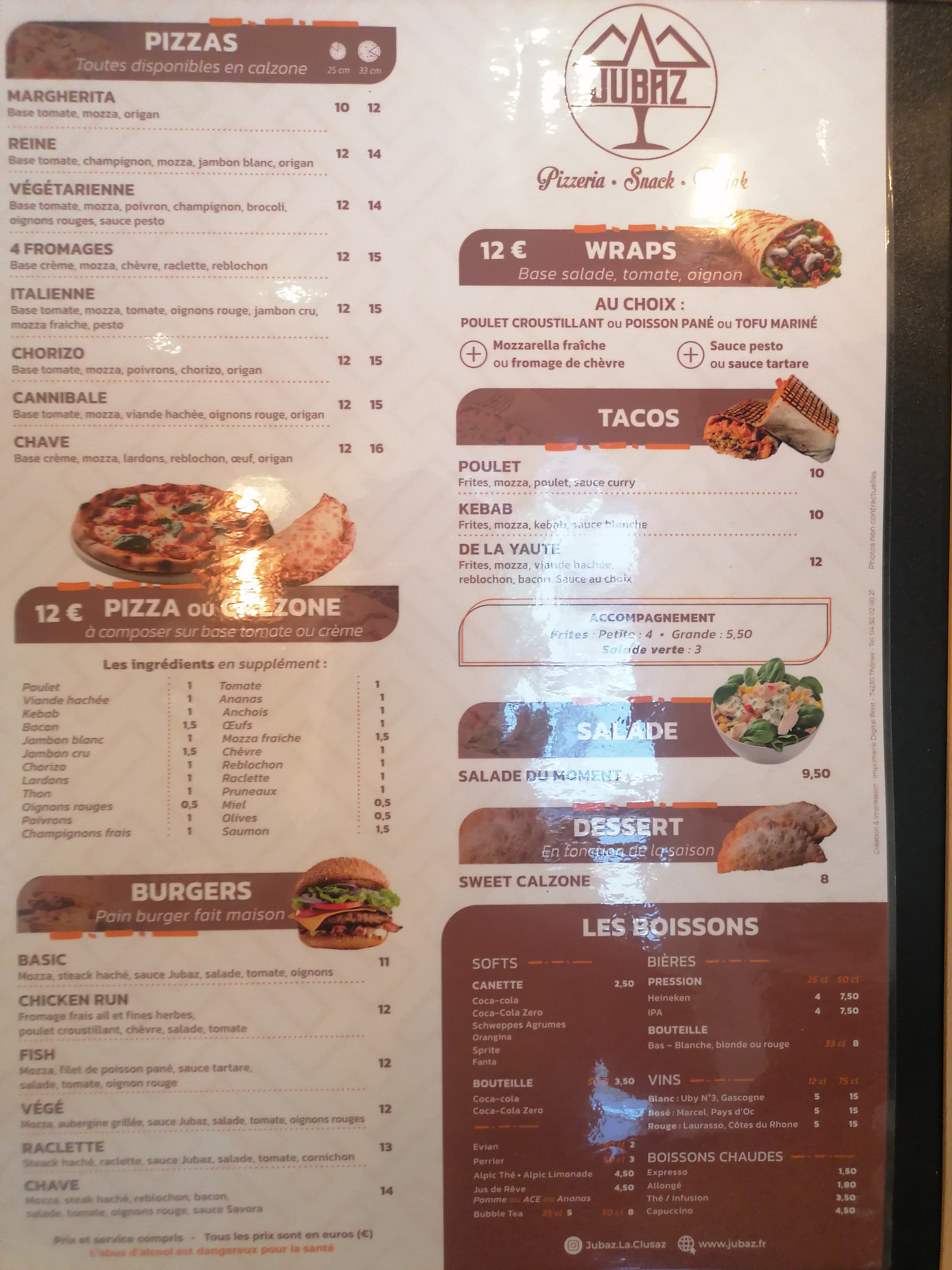 Arrivé depuis 2 semaine a la Clusaz j'ai manger pas une pizza mais quasi la totalité de la carte. Patte a pizza très bien cuit dans les règles de l'art, pain à burger maison assaisonner, wrap bien charnu et très, très bon. Ambiance conviviale avec beaucoup d'habitués, Les gérants a l'écoute et très cool, on peut composé son plat. Je Recommande