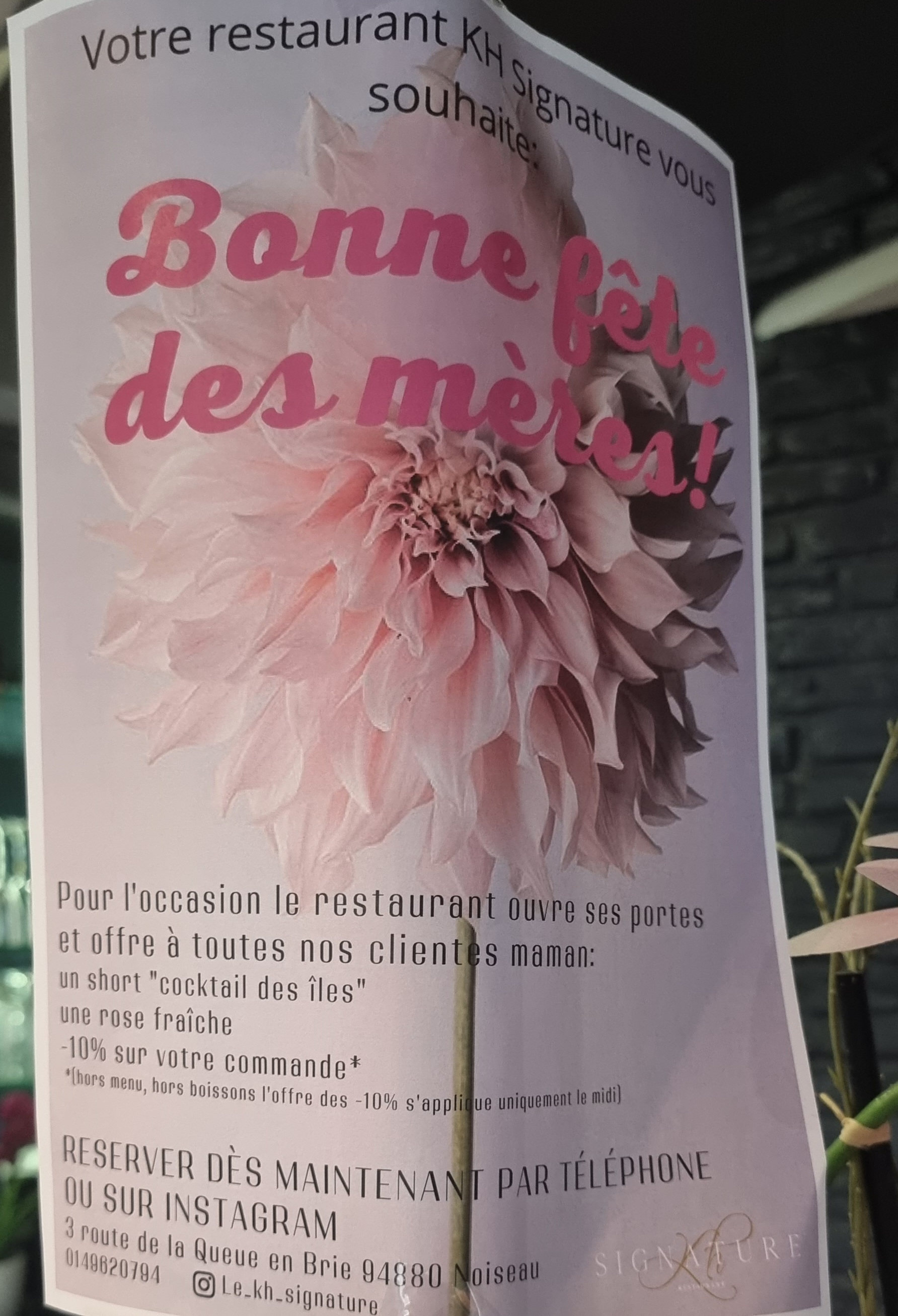 Chère N F Nous vous adressons nos remerciements les plus sincères. Nous sommes ravis de savoir que vous avez apprécié votre expérience au KH SIGNATURE. Merci pour ce commentaire encourageant et qui en effet résume parfaitement la raison de certains avis qui porte une étoile ou certain commentaire. La quasi totalité son lié à l’alcool qui n’est, effectivement pas servi dans notre établissement. Nous espérons vous revoir très vite. Excellente journée à vous L’équipe du KH signature