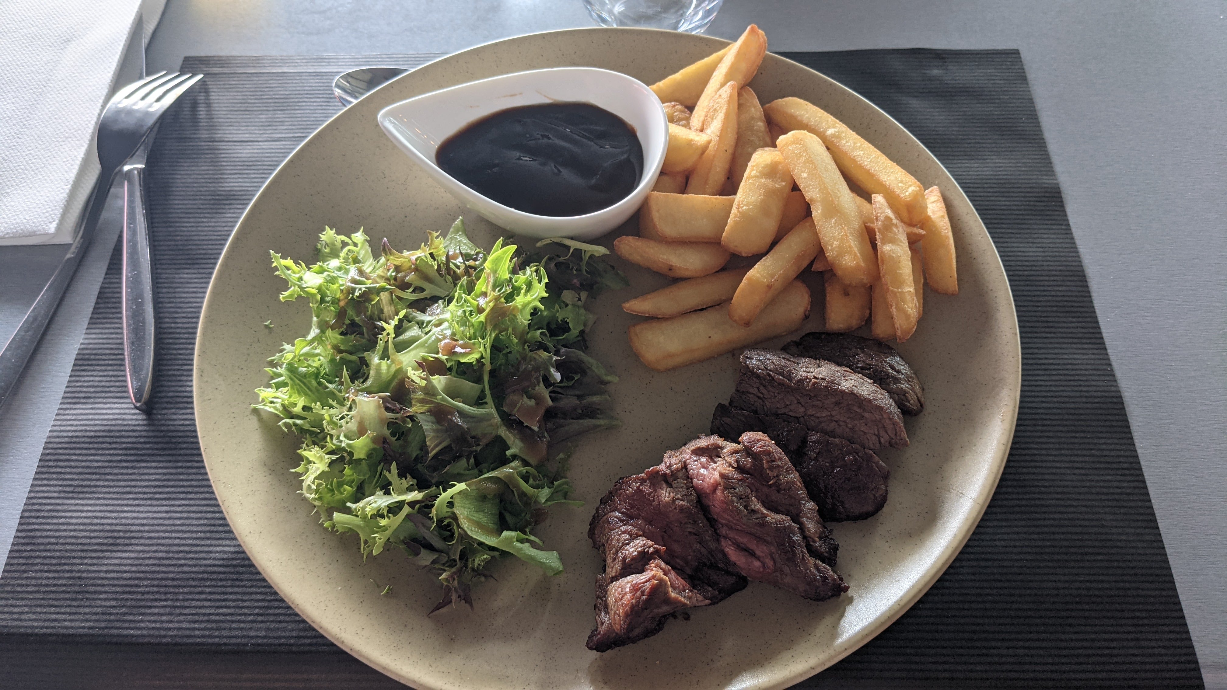 A part le lieu qui peut démotivé, le restaurant par lui même est agréable. Tartare de bœuf au couteau, ce qui rare, excellent très bien assaisonné et salade césar généreuse. Service impeccable